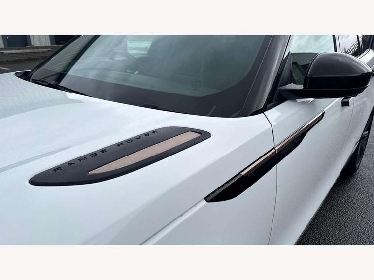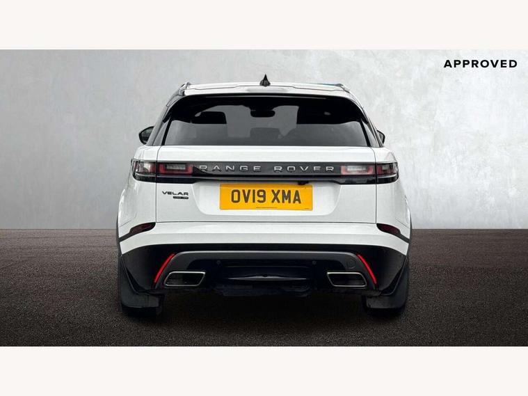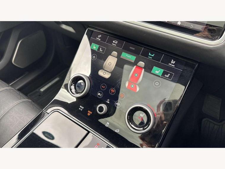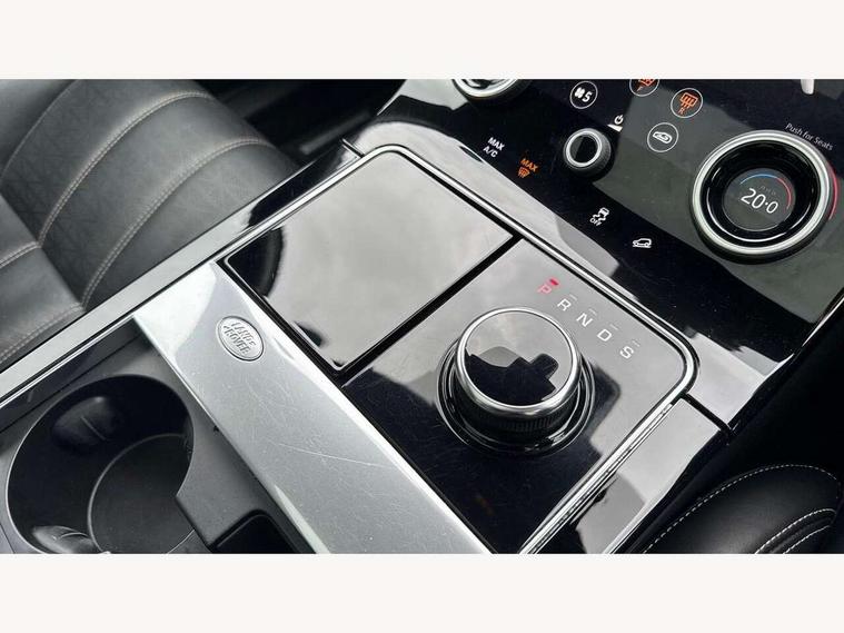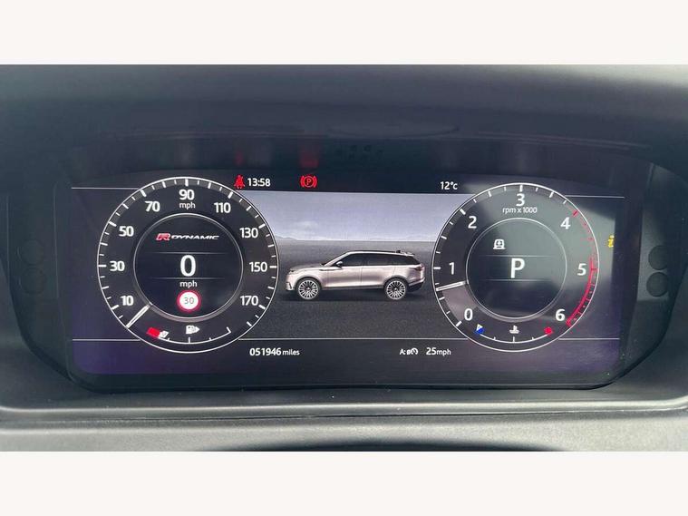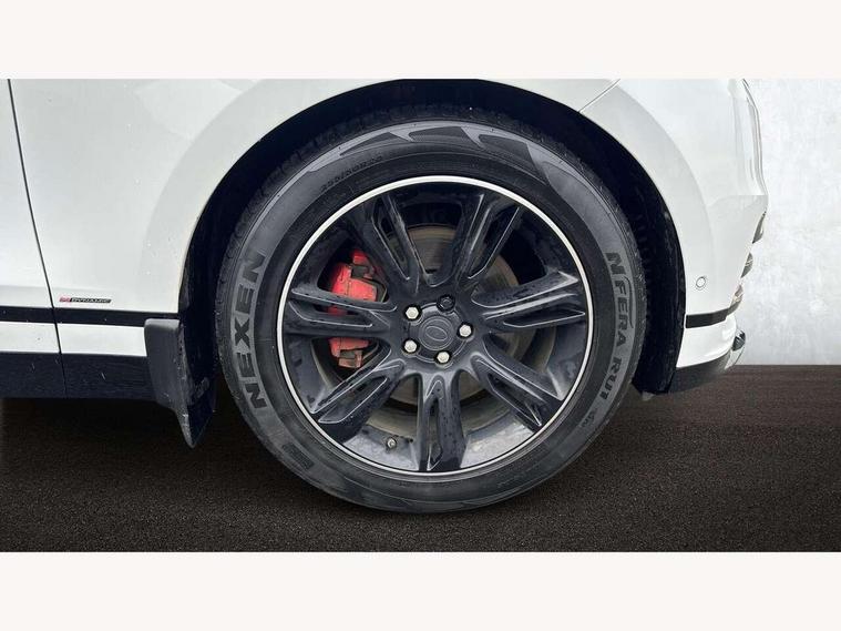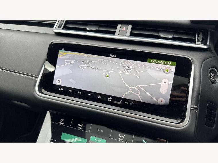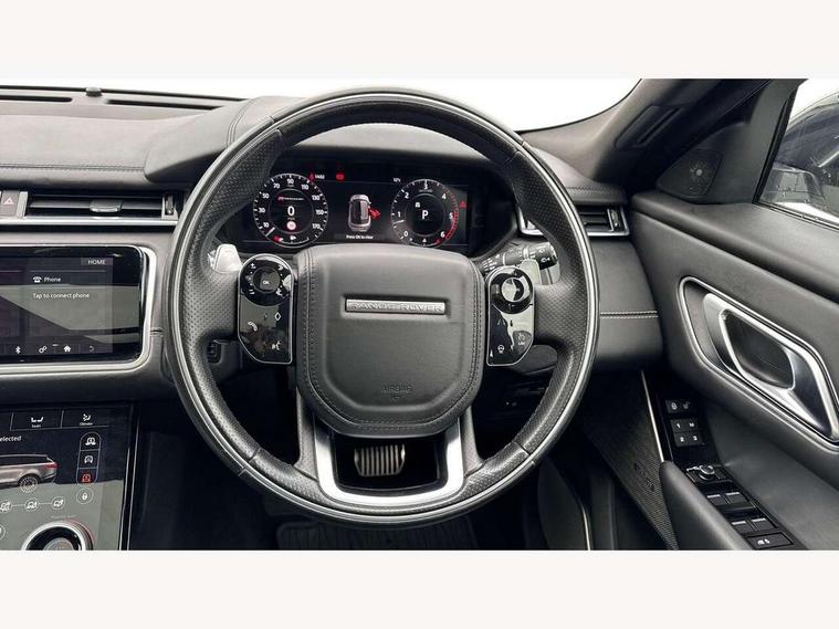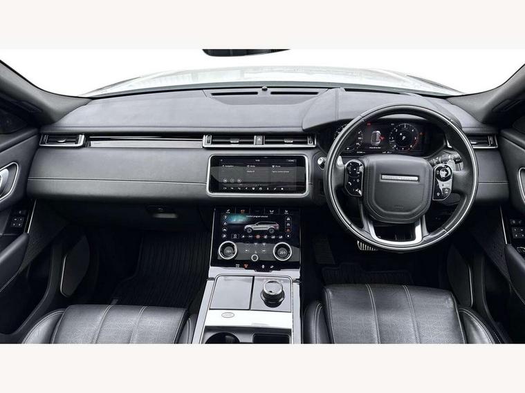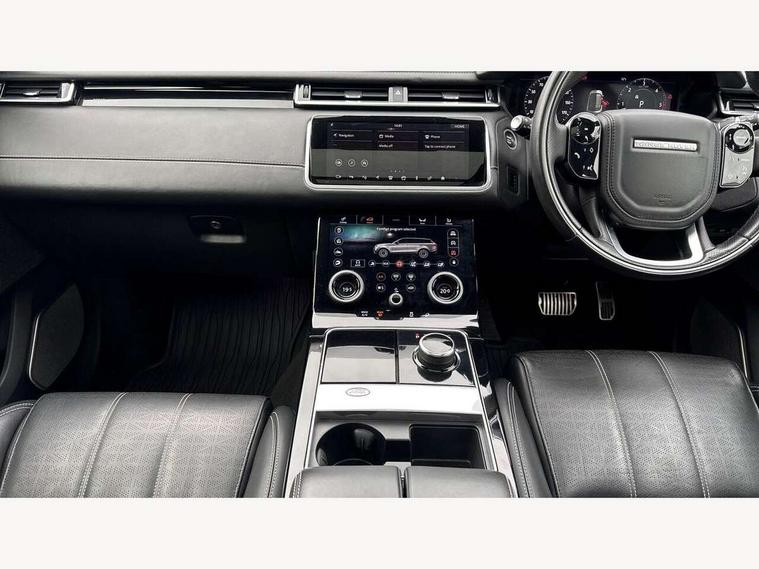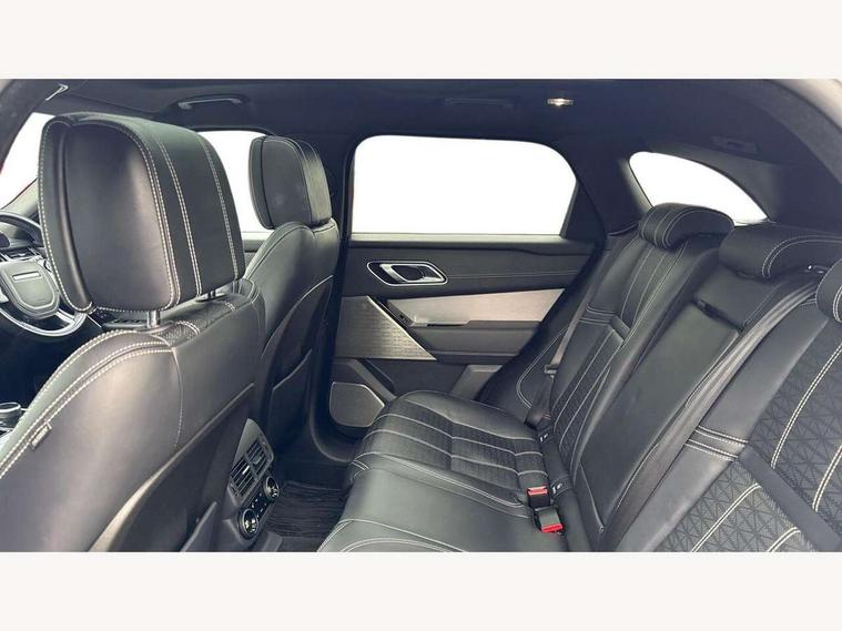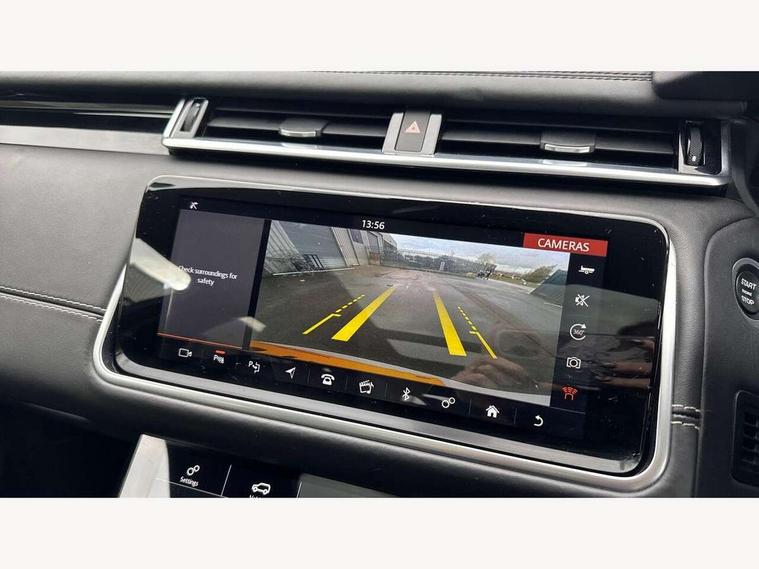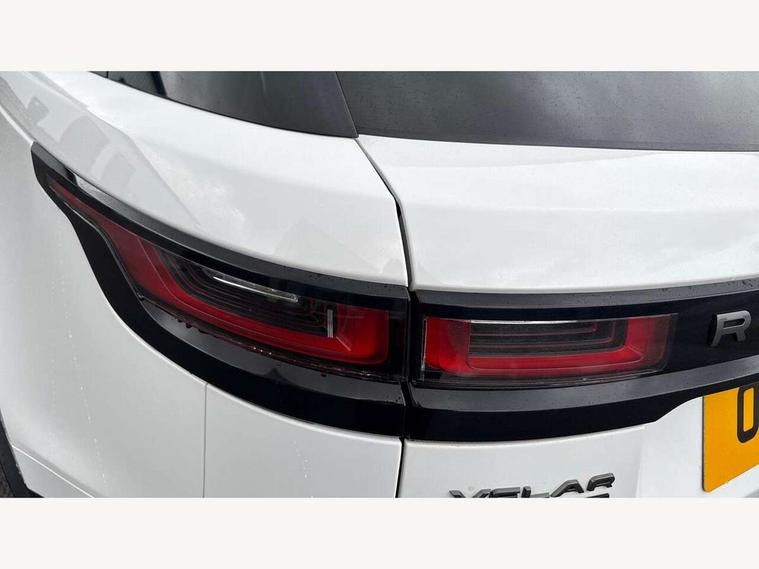 360 Parking aid sensors, Blind spot assist, Bluetooth connectivity, Brake pad wear indicator warning light, Driver condition monitor, InControl remote, InControl Touch navigation pro, Interactive Driver display instrument cluster, Land Rover InControl apps, Lane keep assist, Park Assist - Parallel Park/Parking Exit/Perpendicular park, Powered gesture tailgate/boot lid, Pro services and wifi hotspot, Rear traffic monitor, Service indicator, Speed proportional electronic power assisted steering (EPAS), Traffic sign recognition with adaptive speed limiter, Trip computer, Voice control system, 8 speed automatic transmission, Electronic air suspension, Open differential with torque vectoring by braking, Single speed transfer box, Digital Audio Broadcast radio-DAB, Steering wheel mounted controls, Acoustic laminated windscreen, Adaptive front lighting system, Auto dimming interior rear view mirror, Automatic headlamp levelling, Automatic headlights, Body coloured bumpers, Boot protection plate, Electric windows with one touch open/close and anti trap, Flush deployable exterior door handles, Follow me home headlights, Headlamp power wash, Heated rear window with timer, Heated windscreen + heated windscreen washer jets, Power fold, auto-dimming, heated door mirrors with approach lights, Rain sensor windscreen wipers, Rear fog lights, Rear wash/wipe, Standard roof, Tailgate/boot lid spoiler, Trailer stability assist, Velar and R-dynamic badge, 40:20:40 split folding rear seats, Adjustable front armrest, Bright metal pedals, Driver and passenger illuminated vanity mirror, Electric adjustable steering column, Isofix system on outer rear seats, Loadspace cover, Passive front headrests, Rear centre headrest, Satin chrome gearshift paddles, 350mm front brakes, 3x3 point rear seatbelts, Anti-lock braking system (ABS), Cornering brake control, Curtain airbags, Door side intrusion beams, Driver airbag, DSC - Dynamic Stability Control, Electronic brake force distribution, Electronic parking brake, Electronic traction control, Emergency brake assist, Front and rear seatbelt reminder, High speed emergency braking, Hill descent control, Hill launch assist, Low traction launch, Passenger airbag, Power operated child locks, Rear airbags, Roll stability control, Side airbags, Tyre pressure monitoring system, Unpainted brake calipers, Global lock and unlock switch on driver door, Immobiliser, Intrusion sensor, Keyless entry, Lock only switch on front passenger door, Perimetric alarm, Remote central locking,