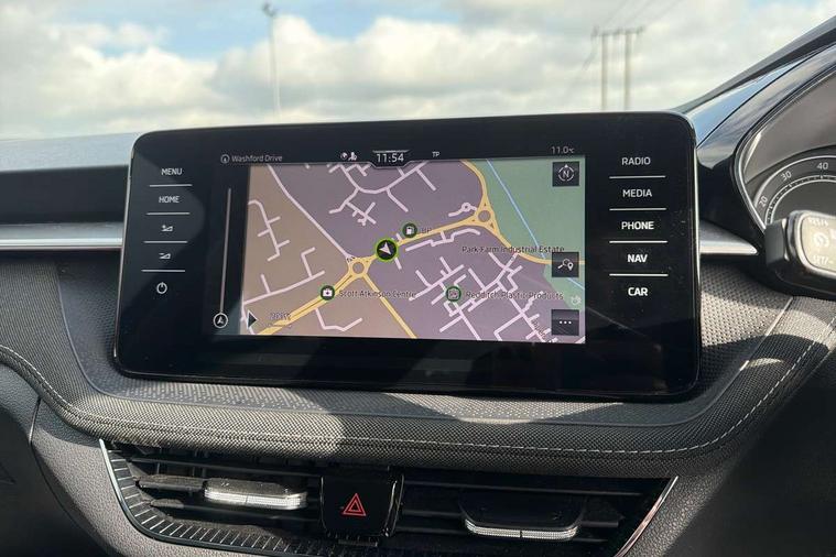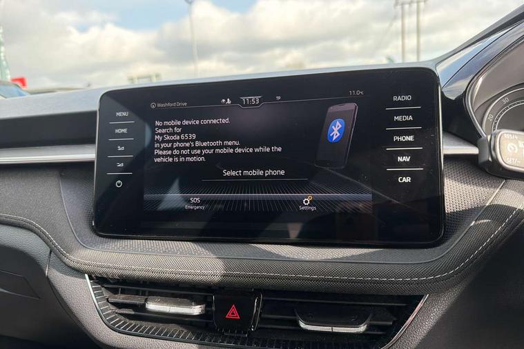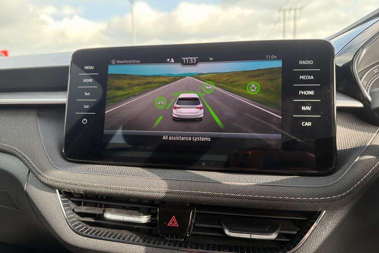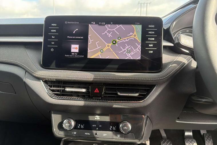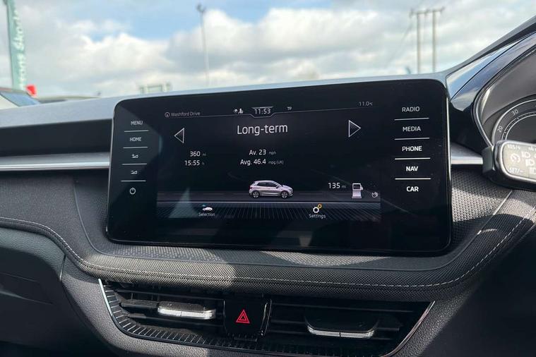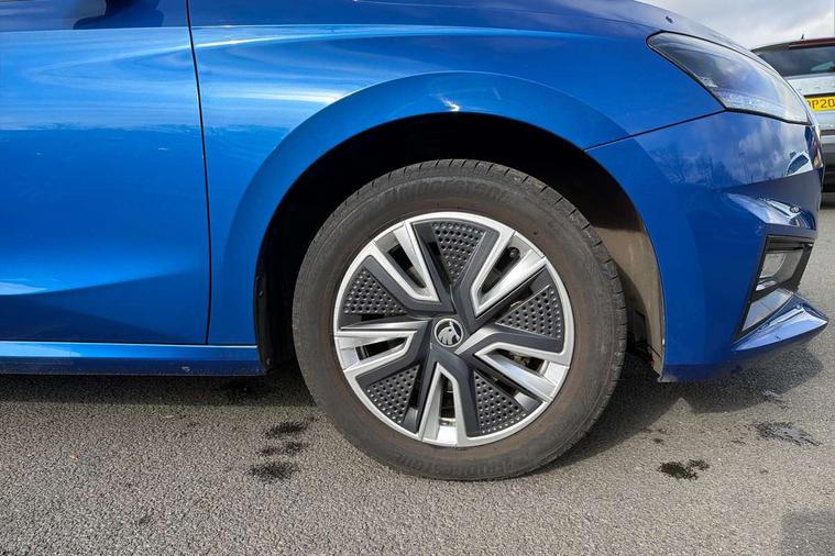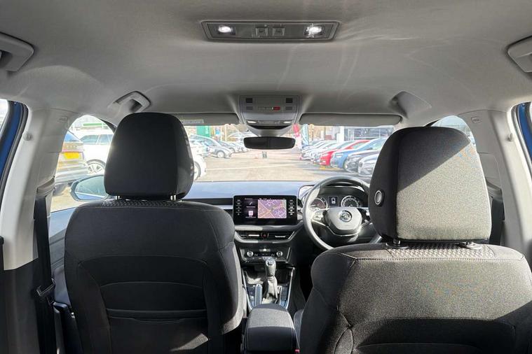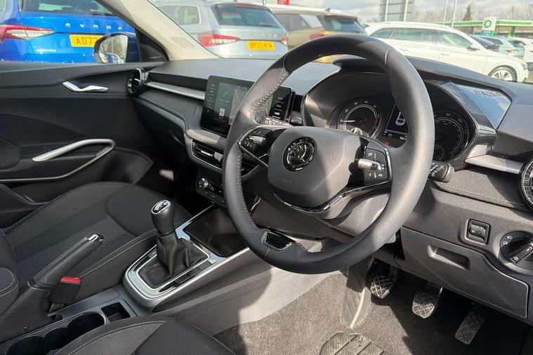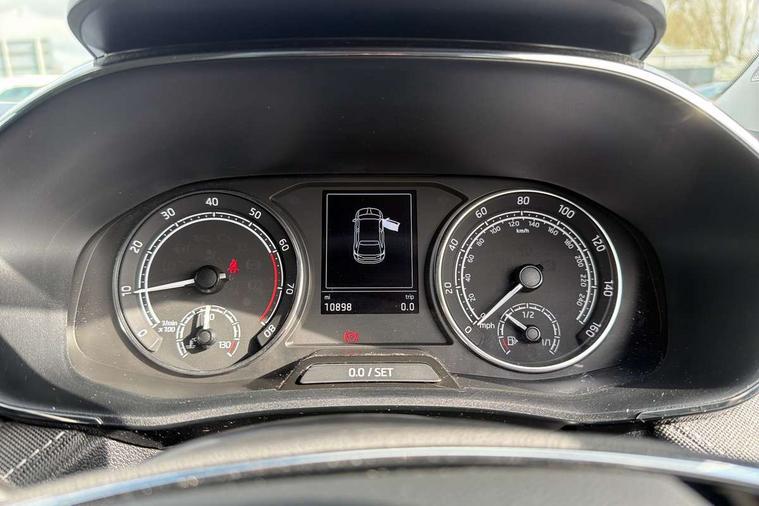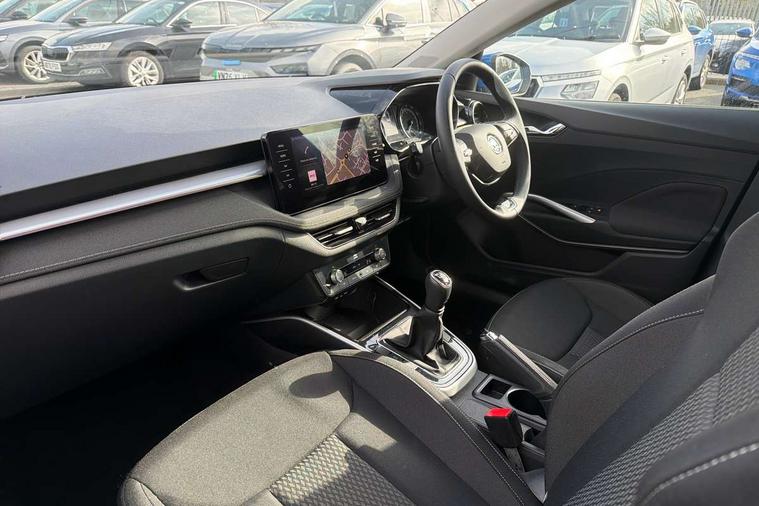 Bluetooth connection, Driver alert system - DAS, Electromechanical power steering, Exterior temperature gauge, Service interval indicator, 2x USB-C in the front (for data transmission and charging), 6 Speakers (4 in front and 2 in rear), Auxiliary socket for external MP3 player, DAB digital radio reception, Web radio, Auto dimming rear view mirror, Basic LED Headlights, Body colour door mirrors, Body coloured bumpers, Chrome window surround, Door mirror integrated indicators, Electrically adjustable and heated door mirrors, Front and rear electric windows, Front fog lights, Front window wiper intermittent control, Headlight range control - Automatic, Ice scraper in fuel cap, LED daytime running lights with coming and leaving home feature, Rain sensor, Rear LED fog light, Rear side wing doors, Rear window wiper with washing nozzles, Roof mounted spoiler, SKODA tailgate lettering in chrome, Third brake light, 3 rear headrests, Backrest split and folding, Central console with fixed cup holder and storage box, Chrome handbrake release button, Comfort seats, Fabric upholstery, Front centre armrest, Gearshift knob/handle in leather, Hand brake lever handle in leather, Height adjustable front headrests, Height adjustable front seats, Height adjustable steering wheel, ISOFIX and TopTether anchorage points to the outer rear seats, ISOFIX and TopTether on the front passenger seat, Luggage compartment lighting, Manually adjustable lumbar support in front seats, Pollen filter, Rear seat bench unsplit, Removable cup holder, Single front passenger seat, Storm grey headlining, Sun visors with mirror and airbag label on passenger side, Textile floor mats, Ticket holder, Umbrella in drivers door, 3-point height adjustable front seats belts with pretensioner and force limiter, Automatic warning lights in case of crash, Driver and passengers airbag with switch off function, e-Call+, ESC including ABS, MSR, ASR, EDS, HBA and XDS, Front and rear seat belt warning, FRONT ASSIST (AEB City and AEB Inter Urban), Front side airbags, Head airbags, One tone horn, Pedestrian protection, Three rear 3-points safety seat belts with pretensioner and force limiter including stop function for outer rear seat belts, Tyre pressure monitoring system, Anti-theft alarm system including immobiliser, interior monitoring, backup horn, and towing protection, Central locking with radio remote control, interior controls, SAFE function and 2 foldable keys, KESSY - Keyless engine start/stop, Chrome edged air vents, Satin black door and side trim panel in front, Anti-theft wheel bolts protection, Super-low rolling resistance tyres,