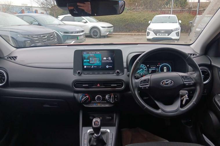 8" Touchscreen display audio + smart device integration, Bluetooth connectivity, Cruise control + speed limiter, Digital clock, Driver attention warning, Driver supervision instrument cluster with 10.25" LCD display, eCall emergency call system, Forward collision avoidance assist with pedestrian detection, Lane follow assist, Lane keep assist, Leading vehicle departure alert (LVDA), Parking system with rear camera and guidance system, PAS, Phone connection with apple carPlay and android auto, Rear parking sensor, Roadside assistance, Tailgate, Windscreen washer fluid sensor and warning indicator, 6 speed intelligent manual transmission, 6 speakers (2 front, 2 tweeters, 2 rear), Front USB ports, RDS and Digital DAB, Steering wheel mounted audio/phone controls, Automatic headlights with dusk sensor, Body colour door mirrors and handles, Door mirror integrated indicators, Electric front/rear windows with drivers one touch/anti-trap, Electrically adjustable and heated door mirrors, Halogen headlights, Halogen rear lights, LED daytime running lights, Positioning Lights - LED, Rain sensor, Rear roof spoiler with integrated LED brake light, Rear side wing doors, Rear wiper, Roof rails, Tinted glass with front door glass and windscreen with shade band, Variable front intermittent wipers, 12V power outlet in front console, 3 seat bench in 2nd row, 60/40 split folding rear seat, Adjustable head restraints, Air conditioning, Centre interior light, Cloth upholstery, Door scuff plate, Driver's seat height adjustment, Driver/passenger sunvisors and illuminated vanity mirrors, Front interior light, Front passenger seat manual adjustments, Height/reach adjustable steering column, Isofix rear child seat fastenings, Leather wrapped steering wheel and gear knob, Luggage compartment lighting, Luggage hooks, Metal paint effect interior door handles, Parcel shelf, Rear centre console with air vents, Single front passenger seat, Sunglasses holder, Vertical adjustment rear head restraints, Trailer wiring package - Kona, Airbags - front, front side and curtain airbags, Anti-lock brake system (ABS), Childproof rear door locks, Downhill brake control, EBD + Brake Assist, Electronic stability control, Fasten seatbelt reminder, Fixed 3 point for second row centre passenger seatbelt, Front seatbelt pretensioners, Height adjustable front seatbelts, Hill start assist control (HAC), Manual parking brake, Passenger airbag deactivate switch, Rear seat alert, Traction control, Tyre pressure monitoring system, Alarm/immobiliser, Deadlocks, Folding key, Locking wheel nuts, Remote central locking, 17" Alloy wheels,