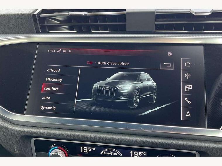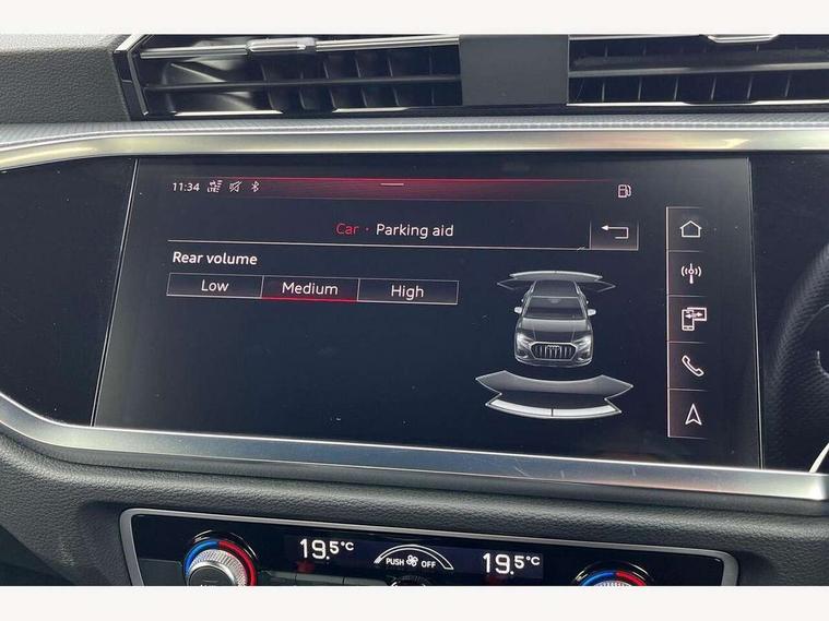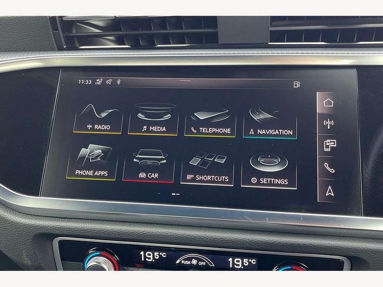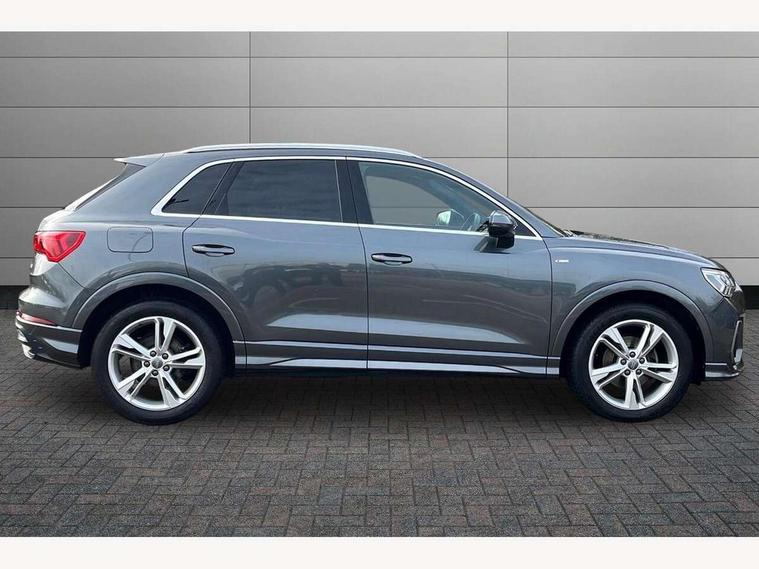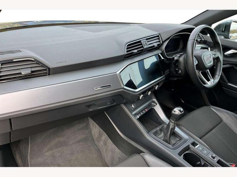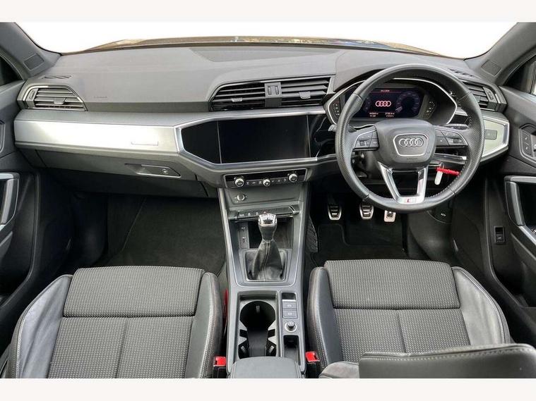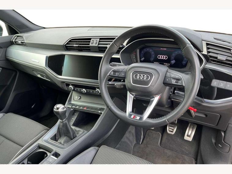 Audi connect safety and service (e-call), Audi drive select, Audi lane departure warning, Audi side assist, Audi smartphone interface, Bluetooth interface, Camera based traffic sign recognition, Cruise control + speed limiter, MMI navigation plus with MMI touch, Power opening/closing tailgate, Progressive steering, Rear parking sensors, Service interval indicator, Stop/start system, Voice control system, Sports suspension, 1 x USB type C and 1 USB type A charging points, 6 speakers, DAB digital radio module, Acoustic windscreen, Aluminium roof rails, Aluminium window trim, Auto dimming rear view mirror, Body coloured bumpers, Diffuser in matt Platinum grey, Electrically adjustable and heated door mirrors with integrated LED side indicators, Front and rear electric windows, Front fog lights, Front side air inlets in matt platinum grey, Front spoiler blade in matt platinum grey, Grille vertical bars in aluminium silver/Matt, High gloss black finish B and C pillars, LED headlights with LED daytime running lights and dynamic rear indicator, LED rear lights, Privacy glass, Rain and light sensors, Rear diffuser strip in matt titanium black, S Line badge on wings, S Line front and rear bumpers, Side skirt insert in matt Platinium grey, Titanium black radiator grille, 12V socket in rear centre console, 40:20:40 split folding rear bench seat, Adjustable rear seat bench/backrest with centre armrest and cupholder, Aluminium door sill trims, Black cloth headlining, Dual zone climate control, Front and rear black floor mats with contrast stitching in rock grey, Front and rear headrests, Front centre armrest with storage compartment and angle adjustment, Illuminated door sill trims with S logo, ISOFIX child seat mounting and Top Tether with front passenger airbag deactivation, Manual front seats with height adjustment, Perforated leather gearknob, Stainless steel luggage compartment sill finisher, Stainless steel pedals, Non smoking pack - Q3, 3x3 point rear seatbelts, 6 airbags - Driver, front passenger, curtain and side windows, Audi pre-sense front with pedestrain and cyclist recognition, Electrically operated child locks on rear doors, Electromechanical parking brake, Electronic stabilisation control including ABS, ASR and EDL, Hill hold assist, Pre sense basic, Seatbelt monitoring, Tyre pressure warning, Warning triangle and first aid kit, Anti theft alarm, Anti theft wheel bolts, Remote central locking, Dark matt brushed aluminium inlay, MMI touch colour display in gloss black with aluminium surround,