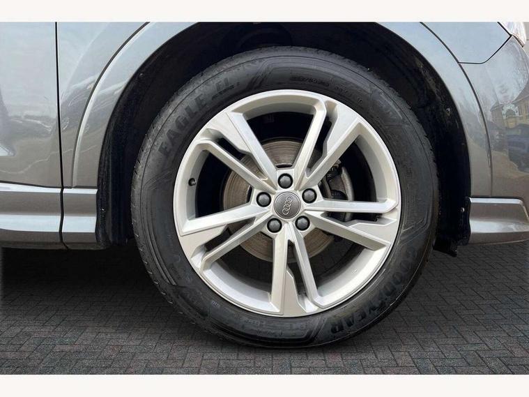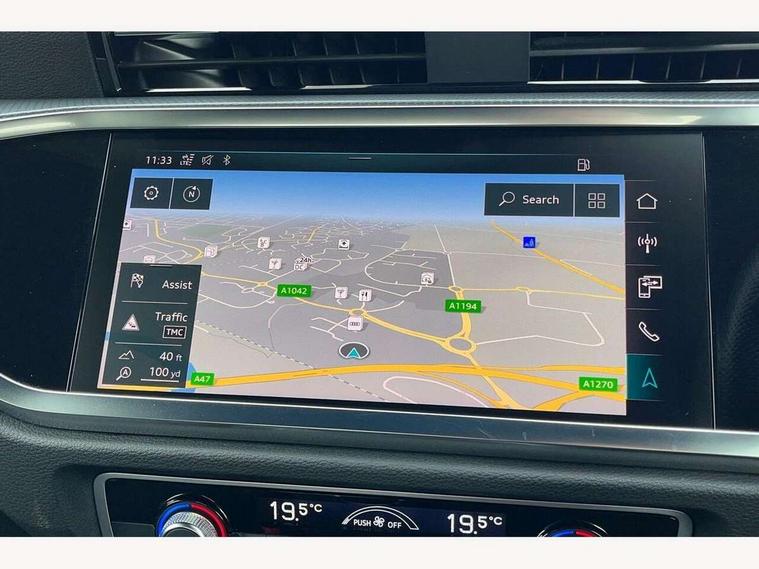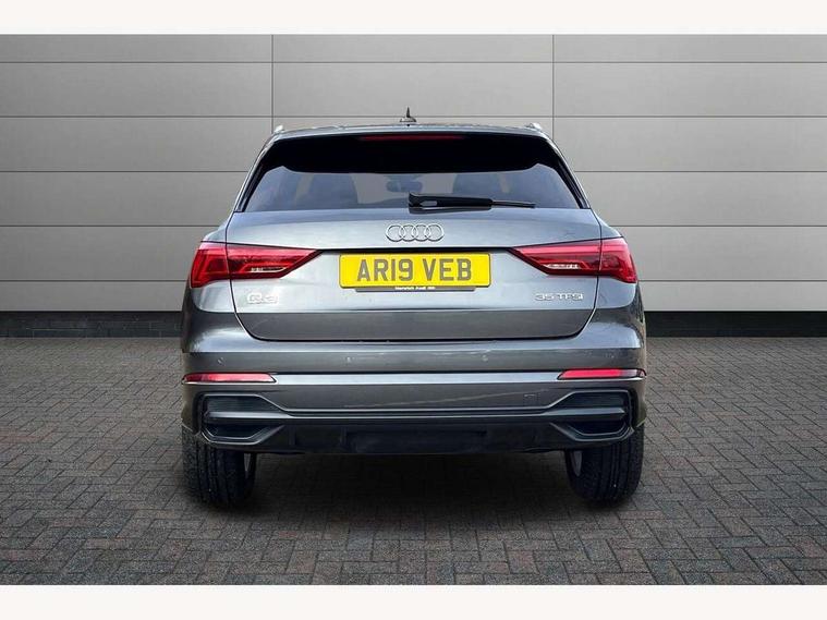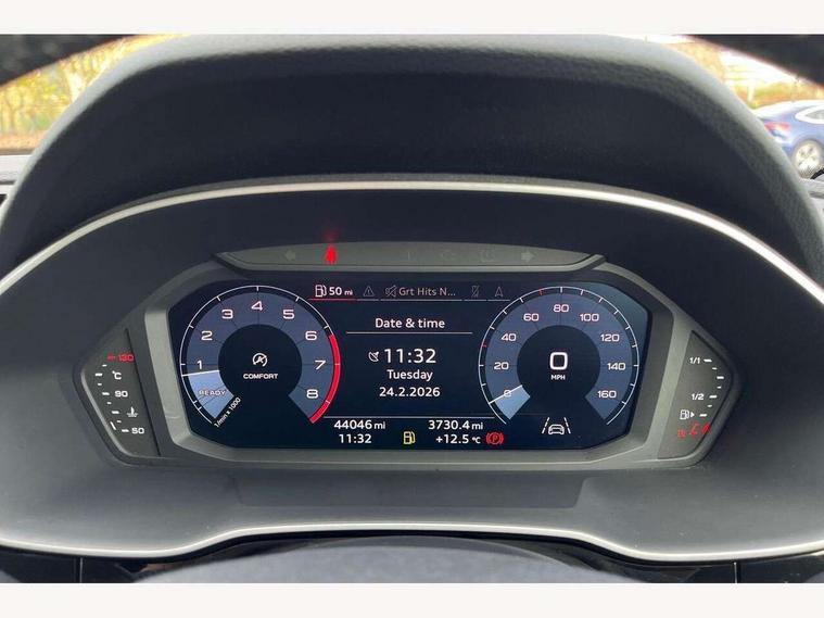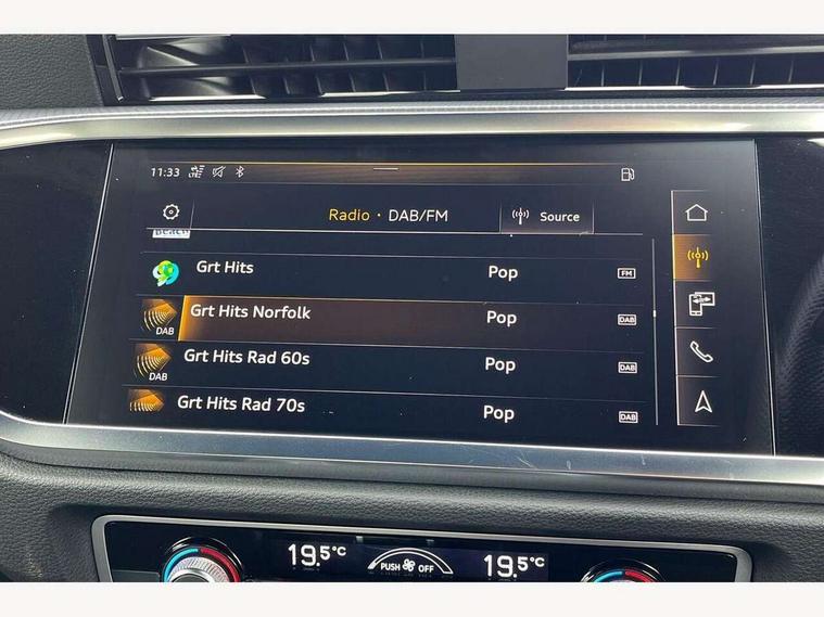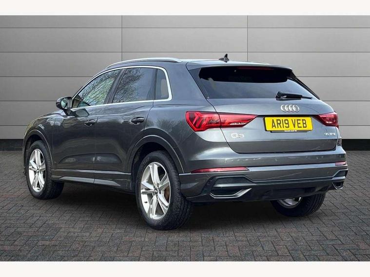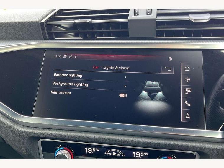 Audi connect safety and service (e-call), Audi drive select, Audi lane departure warning, Audi side assist, Audi smartphone interface, Bluetooth interface, Camera based traffic sign recognition, Cruise control + speed limiter, MMI navigation plus with MMI touch, Power opening/closing tailgate, Progressive steering, Rear parking sensors, Service interval indicator, Stop/start system, Voice control system, Sports suspension, 1 x USB type C and 1 USB type A charging points, 6 speakers, DAB digital radio module, Acoustic windscreen, Aluminium roof rails, Aluminium window trim, Auto dimming rear view mirror, Body coloured bumpers, Diffuser in matt Platinum grey, Electrically adjustable and heated door mirrors with integrated LED side indicators, Front and rear electric windows, Front fog lights, Front side air inlets in matt platinum grey, Front spoiler blade in matt platinum grey, Grille vertical bars in aluminium silver/Matt, High gloss black finish B and C pillars, LED headlights with LED daytime running lights and dynamic rear indicator, LED rear lights, Privacy glass, Rain and light sensors, Rear diffuser strip in matt titanium black, S Line badge on wings, S Line front and rear bumpers, Side skirt insert in matt Platinium grey, Titanium black radiator grille, 12V socket in rear centre console, 40:20:40 split folding rear bench seat, Adjustable rear seat bench/backrest with centre armrest and cupholder, Aluminium door sill trims, Black cloth headlining, Dual zone climate control, Front and rear black floor mats with contrast stitching in rock grey, Front and rear headrests, Front centre armrest with storage compartment and angle adjustment, Illuminated door sill trims with S logo, ISOFIX child seat mounting and Top Tether with front passenger airbag deactivation, Manual front seats with height adjustment, Perforated leather gearknob, Stainless steel luggage compartment sill finisher, Stainless steel pedals, Non smoking pack - Q3, 3x3 point rear seatbelts, 6 airbags - Driver, front passenger, curtain and side windows, Audi pre-sense front with pedestrain and cyclist recognition, Electrically operated child locks on rear doors, Electromechanical parking brake, Electronic stabilisation control including ABS, ASR and EDL, Hill hold assist, Pre sense basic, Seatbelt monitoring, Tyre pressure warning, Warning triangle and first aid kit, Anti theft alarm, Anti theft wheel bolts, Remote central locking, Dark matt brushed aluminium inlay, MMI touch colour display in gloss black with aluminium surround,