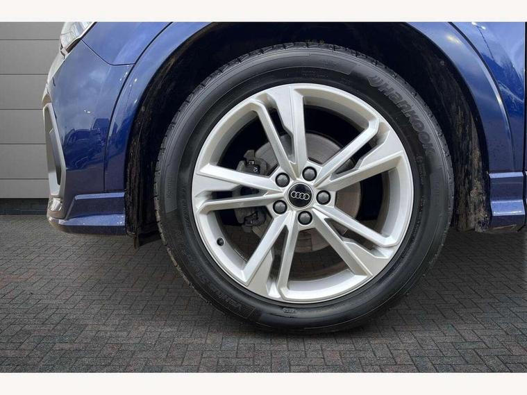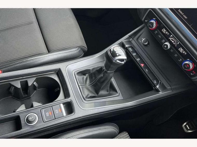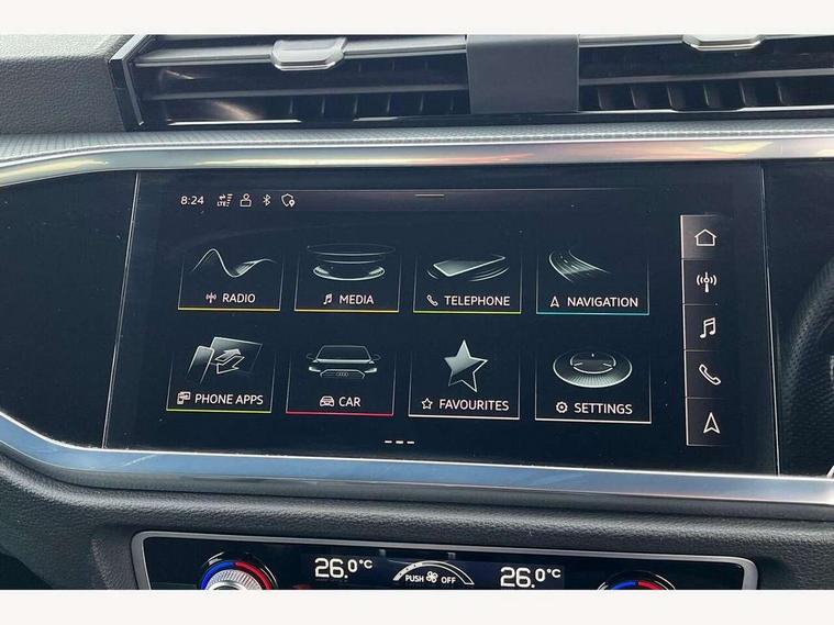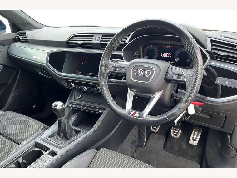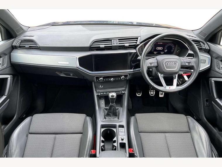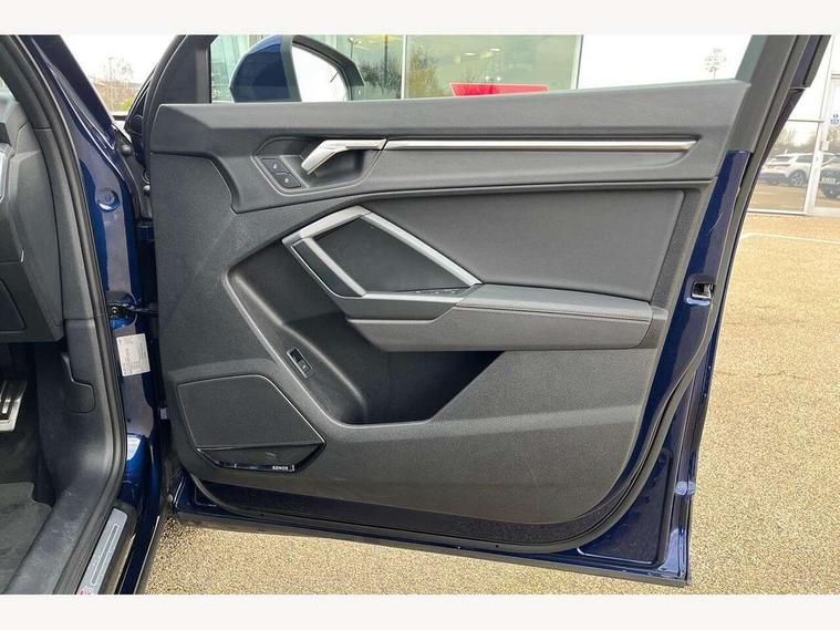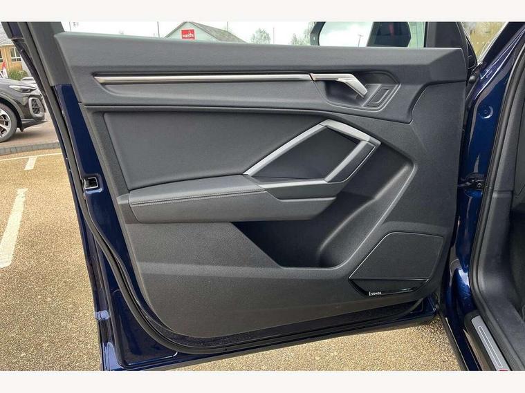 Amazon alexa Integration, Audi drive select, Audi lane departure warning, Audi Virtual Cockpit - 10.25" display, Bluetooth interface, Camera based traffic sign recognition, Cruise control + speed limiter, Legal emergency call, MMI Navigation Plus with high resolution 10.1 inch touchscreen colour display, Power operated tailgate, Progressive steering, Rear parking sensors, Service interval indicator, Smartphone interface includes wireless Apple carplay/Android Auto, Start stop system with recuperation, Voice control system with natural language interaction, Sports suspension, 2 USB-C ports with charge and data functions, 6 passive loudspeakers, DAB digital radio module, Acoustic windscreen, Aluminium roof rails, Aluminium window trim, Anthracite black radiator grille, Auto dimming frameless rear view mirror, Body colour front spoiler blade, Body coloured bumpers, Electrically folding, adjustable and heated door mirrors with integrated LED side indicators and kerb view function for passenger side, Front and rear electric windows, Front fog lights, Front side air inlets in matt platinum grey, Grille vertical bars in aluminium silver/Matt, High gloss black finish B and C pillars, LED Dynamic rear indicators, LED headlights with LED daytime running lights, LED rear lights, LED third brake light, Privacy glass dark tinted rear and rear-side windows (from B-pillar backwards), Rain and light sensors, Rear diffuser grille in grained matt black, Rear diffuser strip in matt anthracite black, Rear side wing doors, Rear wiper, S line badges on front wings, S Line front and rear bumpers, Side skirt insert in matt Platinium grey, Variable front intermittent wipers, 12V socket in rear centre console, 3 seat bench in 2nd row, 3 spoke leather multifunction steering wheel features S badging and grips in perforated leather with contrast stitching, 40:20:40 folding with manual adjustment for 60:40 forwards/backwards position and backrest angle, Adjustable rear seat bench/backrest with centre armrest and cupholder, Black cloth headlining, Dual zone electronic climate control, Front and rear black floor mats with contrast stitching in rock grey, Front and rear headrests, Front and rear roof module including reading lights, Front centre armrest, Glove compartment lighting, Height and reach adjustable steering wheel, Illuminated door sill trims with S logo, ISOFIX child seat mounting for front passenger with airbag deactivation and outer rear seat including top tether attachment point for outer rear seats, Luggage compartment light, Manual front seats with height adjustment, Perforated leather gearknob, Single front passenger seat, Stainless steel luggage compartment sill finisher, Stainless steel pedals, Ambient lighting pack - Q3, Non smoking pack - Q3, 3x3 point rear seatbelts, 6 airbags - Driver, front passenger, curtain and side windows, Audi pre-sense front with pedestrain and cyclist recognition, Electrically operated child locks on rear doors, Electromechanical parking brake, Electronic stabilisation control including ABS, ASR and EDL, Front seatbelt reminder, Hill descent control, Hill hold assist, Pre sense basic, Seatbelt monitoring, Tyre pressure warning, Warning triangle and first aid kit, Anti theft alarm, Anti theft wheel bolts, Immobiliser, Remote central locking, Aluminium look interior elements, Dark matt brushed aluminium inlay, Detail dashboard around MMI touch colour display in glass look, black with surround in aluminium look, Leatherette door armrest,