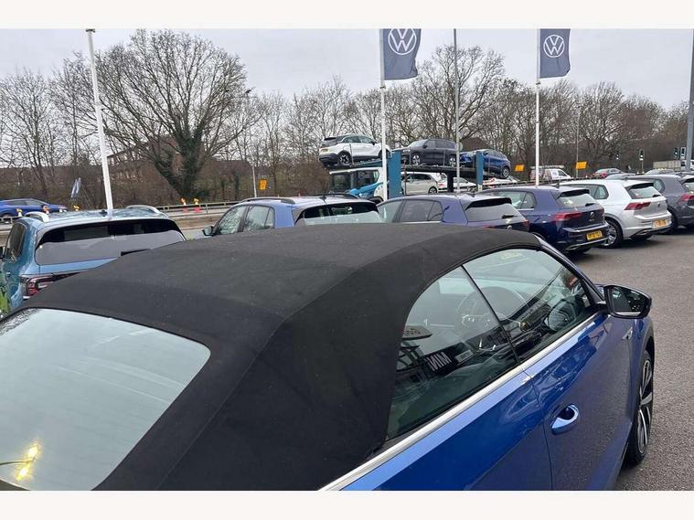 8" colour touch screen, Active Info display 10.25" high resolution TFT dash display with customisable menu and information, Adaptive cruise control, Bluetooth telephone and audio connection for compatible devices, Brake pad wear indicator, Car information display, Driver alert system with fatigue detection, Driver tips and journey analysis, Dusk sensor, Dynamic road sign display, Emergency call service, Front assist, radar sensor controlled distance monitor, city emergency braking + predictive pedestrian protection, Lane assist with warning text instrument cluster, Mobile phone interface, Modified key software - reduce switch off time for key status change to Long no motion, Multifunction computer with visual gear change recommendation for fuel consumption, Navigation system discover media including streaming and internet, Online services, Progressive power assisted steering, Service interval indicator, Start/stop system with brake energy recovery, Wired and wireless app connect, Bluetooth - Simultaneous pairing of 2 compatible mobile devices, DAB Digital radio, Diversity antenna for FM reception, Front USB type C Interface 2X and USB charging socket, Music playback - MP3, WMA and AAC files, SMS functionality - read, compose and send SMS messages using touch-screen display, Title and cover art display, WeConnect plus, Auto dimming interior rear view mirror, Automatic hazard lights activation under emergency braking, Automatic headlamp activation with manual coming home and automatic leaving function, Black door handles, Body colour rear roof spoiler, Body coloured comfort bumpers, Chrome effect left and right trapezoid exhaust tailpipe fascia surround, Chrome trim on upper and lower radiator grille, Darkened LED tail lamp, Electrically power adjustable, heated, folding, auto dimming, front passenger exterior door mirror lowering function, Front and rear electric windows, Front fog lights with static cornering function, High level 3rd brake light, LED dipped and main beam headlights with automatic range adjustment including signature LED daytime running lights, LED rear number plate lights, Power operated canvas convertible top, Rain sensor, Rear fog lamp, Volkswagen roundel, Windscreen wiper with intermittent wipe light, 12V socket in centre console storage area, 2 front reading lights, 50/50 rear seat bench split folding rear seat backrests, Brushed stainless steel pedals, Chrome plated radiator grille inserts, air vent surrounds and light switch surrounds in interior, Climate control - 2 zone electronic air conditioning with automatic air recirculation and allergy filter, Entry aid easy entry (Front folding seats), Front + rear carpet mats, Front centre armrest, Front cupholders x 2, Front seat back storage pockets, Front sports comfort seats with manual height adjustment, Glove Compartment with light, Height/reach adjust steering wheel, Illuminated vanity mirrors in sun visors with air bag label on sun visor and b-pillar, Instrument lighting, white adjustable panel illumination, Interior light delay, Interior light in footwell, Interior white ambient lighting and surround lighting, Isofix easy fit child seat preparation for 2 outer rear seats, leather wrapped multi functional sports steering wheel with paddle shift, Luggage compartment lighting, Power adjustable lumbar support in front, Rear head restraints, Scuff plates in door apertures, Storage compartments in driver and front passenger doors, 2 x 3-point rear seat belts, ABS, Autonomous emergency braking, Driver and front passenger safety-optimised head restraints, Driver/Front Passenger airbags, Drivers seatbelt reminder, Electronic parking brake with auto hold, Electronic stability control (ESC) includes ASR, EDL, EDTC and trailer stabilisation function, Front passenger airbag deactivation, Front side airbags, Pedestrian monitoring, Rigid safety cell with front and rear crumple zones, Single tone horn, Three point height adjust front seatbelts + pretensioners, Tyre pressure monitor, Ventilated front and rear disc brakes, Volkswagen roadside assistance, Alarm with interior protection and deactivation via infotainment system, Electronic engine immobiliser,