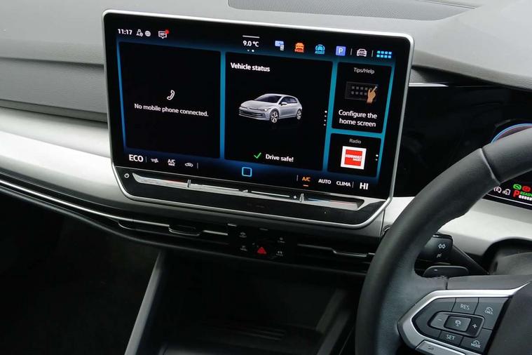 Activated carbon canister, Adaptive cruise control (ACC), Advanced driver attention and drowsiness monitor, Dynamic road sign display, E-Sim card for online connectivity, eCall emergency call system, Multi-color Digital cockpit pro, selection of different info profile possible, Multifunction front facing camera for distance control, Navigation system, Oncoming vehicle braking when turning including swerve support, Speed limiter, Speedo, rev counter, electronic odometer, trip, service interval display, exterior temperature and fuel gauge, Traffic jam assist, Voice enhancer and voice control, Warning signal and warning light for front and rear seatbelts not fastened, We connect plus preparation, We connect preparation, Wireless app connect, Charging cable Mode 2 Type 2 (10A), Charging cable mode 3, type 2 32 A, Electric motor (hybrid electric vehicle) total system output 200kw, unit OEK A, Hybrid propulsion system, Petrol Particulate Filter, Start-stop system with battery regeneration (recuperation - energy recovery during braking), XDS electronic differential lock for improved traction and handling, 2 USB C ports in front, 2 USB charging sockets on the centre console in the rear charging capacity upto 45W, 6 Speakers - 4 in front and 2 in rear with central speaker, Digital radio reception (DAB), Diversity antenna for FM reception, Gaming platform via car app, Infotainment system with 12.9" display, Mobile phone interface with inductive charging feature, 3rd brake light, Automatic headlamp activation with Coming home and Leaving home feature, Body colour door handles, Body colour door mirrors, Exterior mirrors convex on the left and aspherical on the right, Front and rear electric windows, Heat insulating windshield made of laminated glass, LED separate daytime running light, Rear exhaust tailpipe, Rear fog light on one side and reversing lights on both sides, Rear side wing doors, Rear tinted glass 65% light absorbing from B pillar backwards, Rear windscreen washer and wiper with interval delay, Remote electrically foldable door mirrors, puddle lights and reverse activated passenger's door mirror, Standard bumpers, Welcome light with surround lighting, 12V socket in front centre console, 12V socket in luggage compartment, 3 rear head restraints, 3 seat bench in 2nd row, Air care climatronic 3 Zone automatic climate control with rear air conditioning control panel, Chrome plated radiator grille inserts, air vent surrounds and light switch surrounds, Front centre armrest, Front head restraints, Front seat lumbar support adjuster, ISOFIX anchors for child seats on outer rear bench seats and on front passanger seat compatible for i-Size, Luggage compartment lighting, Manual height adjustable front passenger seat, Manually height adjustable driver seat, Plastic gear knob, Rear cupholder and loadthough, Single front passenger seat, Soul black instrument panel, Split folding backrest with centre armrest and unsplit rear seat bench, Standard pedal cluster, Storm grey roof lining, Sun visors with illuminated vanity mirrors, Technology park and comfort pro package - Golf Hatchback, 3 point height adj front seatbelts + pretensioners, 3 rear three point seatbelts, ABS, Autonomous emergency braking front assist with pedestrian and cyclist monitoring, Child locks on rear doors, Driver and front passenger airbag with front passenger airbag deactivation, Electronic parking brake with auto hold, ESC (Electronic Stability Control), Extended pedestrian protection measures, Hill start assist, Rear disc brakes, Two tone horn, Tyre pressure loss indicator, Volkswagen roadside assistance, Anti theft wheel bolts, Preparation for alcohol interlock, Nature cross brushed decorative inserts for dashboard and front door panels, Tool kit for tyre mobility set, Tyre mobility kit Includes 12V compressor and tyre sealant,
