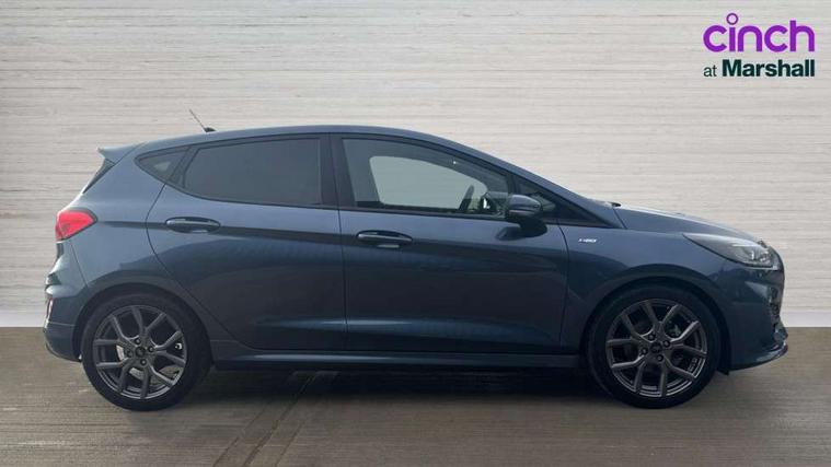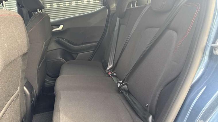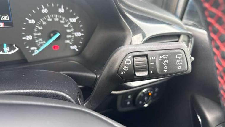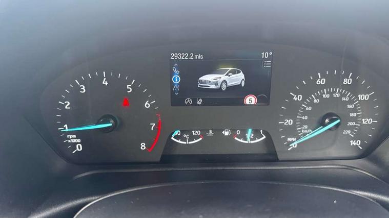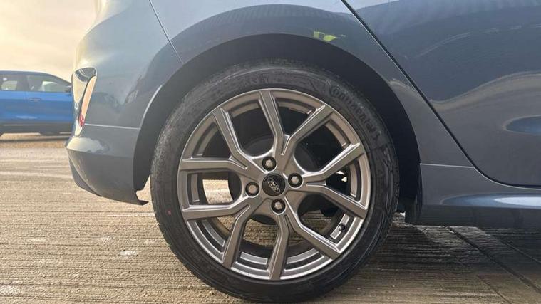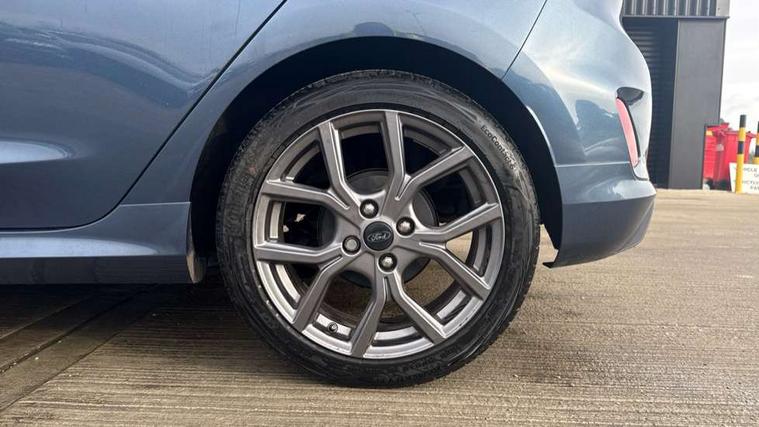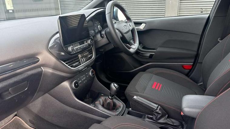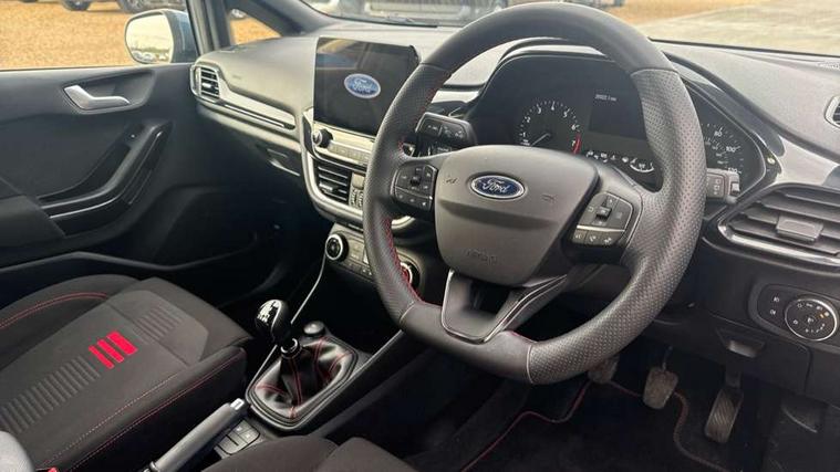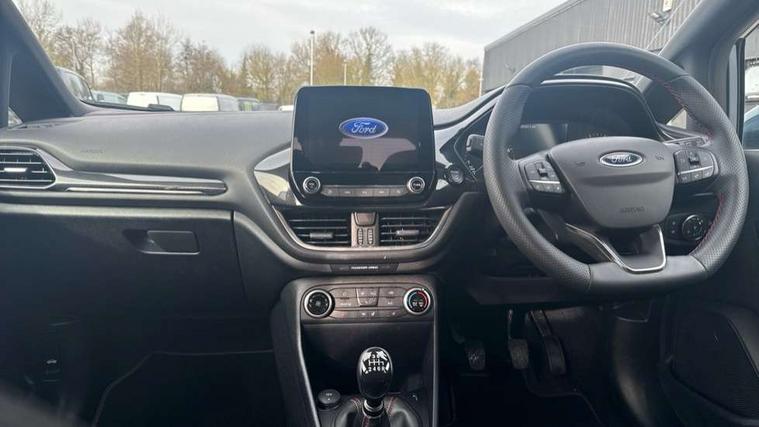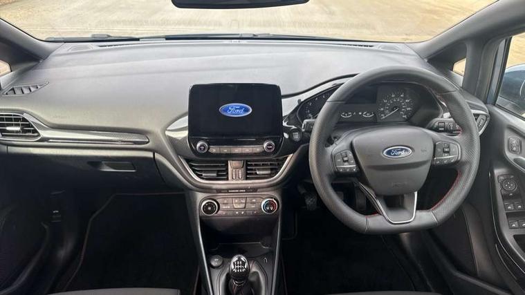 Bluetooth system, Electric power steering, Ford easy fuel, Ford SYNC 3 Navigation system incl 8" touchscreen, 7 speakers, FordPass connect, Apple carplay, android auto, voice control and emergency assistance, Rear parking distance sensors, Selectable drive modes (Normal, Sport, Track), Trip computer, Sports suspension, 2 USB ports, Auxiliary input socket, DAB Digital radio, Steering wheel mounted controls, Body colour bumpers, Body colour door handles, Body colour large rear spoiler, Body coloured electrically operated and heated door mirrors with side indicators, Cornering front fog lights, Electric front windows/one touch facility, Electric rear windows, LED Night signature to rear lights, Quickclear heated windscreen, Rain sensing wipers and auto dimming rear view mirror, Rear privacy glass, Rear wiper, Unique ST-Line upper grille & full bodystyling kit with ST-Line wing badges, 3 spoke flat bottomed leather steering wheel, 60/40 split folding rear seat, Adjustable head restraints, Black headlining, Boot carpet, Centre console with opening armrest, 2x cupholders, 12v and USB, Chrome inner door handles, Cloth upholstery, Footwell illumination, Front floor mats in velour, Front map reading lights, Front seat and rear pockets, Illuminated glovebox, Leather gaiter, Load area light, Manual 2 way passenger seat adjust, Manual 4-way driver seat adjust, Manual air conditioning, Overhead console with sunglasses holder, Pollen filter, Rake/reach adjustable steering wheel, Sensico wrapped steering wheel, Sports front seats, NCAP Pack - Fiesta, 3 point seatbelts on all rear seats, ABS+EBA, Curtain airbags, Driver and passenger airbags, Drivers knee airbag, Electronic stability control with hill start assist, Front passenger airbag deactivation, Front side airbags, Seatbelt warning, Two tone horn, Tyre pressure monitoring system, Keyless start with 'Ford Power' starter button, MyKey system, Remote central locking & engine immobiliser, Thatcham Cat.1 alarm, 17" 5 spoke alloy wheels with rock metallic finish,