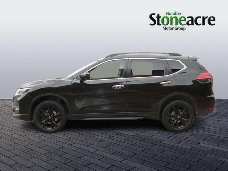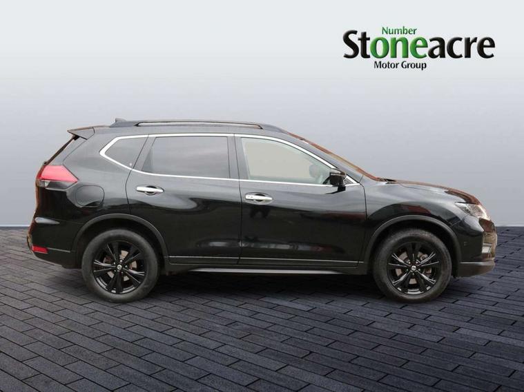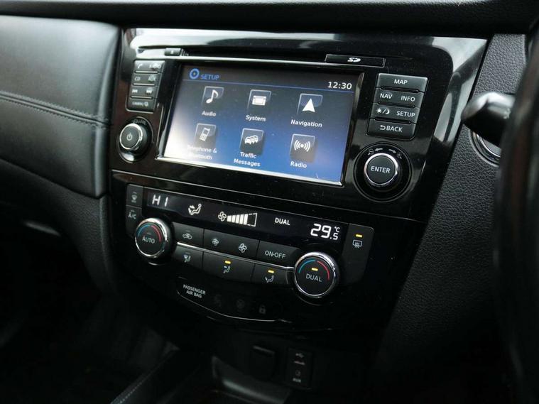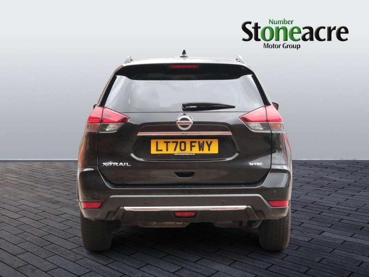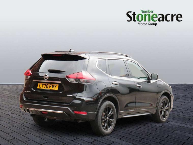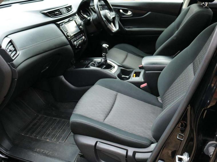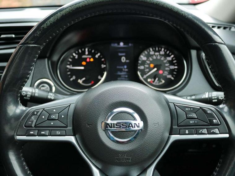5" TFT driver information centre, Automatic tailgate opening, Blind spot monitoring, Bluetooth phone integration system, Driver attention alert system, Front and rear parking sensors, Intelligent around view monitor, Intelligent parking assist, Lane departure warning system, Moving object detection, Nissan connect evo 7" touchscreen navigation and entertainment system, PAS, Push button start, Rear cross traffic alert, Traffic sign recognition, Trip computer, Nissan chassis control (intelligent ride control, intelligent trace control, intelligent engine brake), 6 speakers, DAB Digital radio, Radio/CD, Smartphone apps, Steering wheel mounted audio controls, USB/aux input socket, Aluminium entry guards with N-TEC naming, Anti dazzle rear view mirror, Automatic headlights, Black roof rails, Chrome door handles, Chrome window surround, Dark V motion grille, Electric folding door mirrors, Electric heated mirrors with side turn signal light, Front and rear electric windows, Front fog lights, Halogen headlights, LED daytime running lights, Metallic black door mirrors, N-Tec badge, Panoramic sunroof with one touch shade, Rain sensing windscreen wipers, Rear privacy glass, Shark fin roof aerial, 3 rear headrests, 60/40 split rear bench seat, Centre console storage box/armrest, Cloth upholstery, Configurable luggage board system, Driver's manual adjustable lumbar support, Dual zone climate control, Front and rear door pockets with bottle holders, Front row ventilated cupholders, Front/rear armrests, Height adjustable front headrests, Individual rear reading lights, Isofix child seat attachment, Leather D shaped steering wheel, Leather steering wheel and gear knob, Manual adjust driver/passenger seats, Pollen filter, Tilt/telescopic adjustable steering wheel, Drive assist pack - X-Trail, 3 point seatbelts on all seats, 6 airbags - Driver, front passenger, curtain and side airbags, ABS, Child locks on rear doors, EBD + Brake Assist, Electric parking brake, ESP + traction control, Intelligent emergency braking with pedestrian recognition, Seatbelt warning, Tyre pressure monitoring system, Immobiliser, Intelligent Key, Remote control door locking with superlocking, Thatcham Cat.1 alarm, 18" Black alloy wheels, Full size spare wheel,