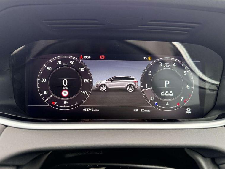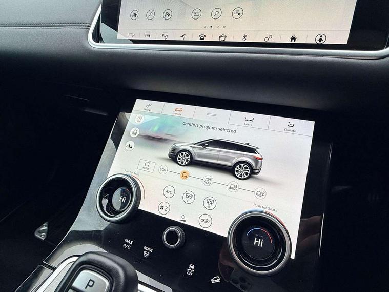 360 degree parking aid, Android Auto, Apple car play, Bluetooth connectivity, Brake pad wear indicator warning light, Clear exit monitor, Driver condition monitor, Duo touch pro, Electronic power assisted steering (EPAS), InControl remote, Interactive Driver display instrument cluster, Land Rover InControl apps, Lane keep assist, Navigation pro system, Park assist - Parallel, perpendicular and parking exit, Pro services and wifi hotspot, Push button starter, Rear traffic monitor, Smart settings, Traffic sign recognition with adaptive speed limiter, Voice control system, All terrain progress control, Efficient Driveline, Large fuel tank, Passive suspension, Terrain Response 2 Auto, Digital Audio Broadcast radio-DAB, Steering wheel mounted controls, Automatic headlight levelling, Electric windows with one touch open/close and anti trap, Evoque badge, Flush deployable exterior door handles, Heated rear window with timer, Heated washer jets, Heated windscreen, Power fold, auto-dimming, heated door mirrors with memory and approach lights, Rain sensing windscreen wipers, Rear fog lights, Standard roof, Tailgate spoiler, 40:20:40 split folding rear seats, Isofix system on outer rear seats, Overhead lighting console, Overhead stowage for sunglasses, Passive front head restraints, Rear air vents, Rear centre headrest, Sunvisors with illuminated vanity mirrors, Twin front cupholders with cover, Twin sliding front centre armrest, Two zone climate control, Anti-lock braking system (ABS), Customer configurable autolock, DSC - Dynamic Stability Control, Electronic brake force distribution, Electronic parking brake, Electronic traction control, Front and rear seatbelt reminder, Hill descent control, Hill launch assist, Low traction launch, Power operated child locks, Roll stability control, Six airbags - Driver and passenger airbags/driver knee airbag/front side airbag and curtain airbags, Torque vectoring brake, Tyre pressure monitoring system, Alarm, Immobiliser, Intrusion sensor, Locking wheel nuts,