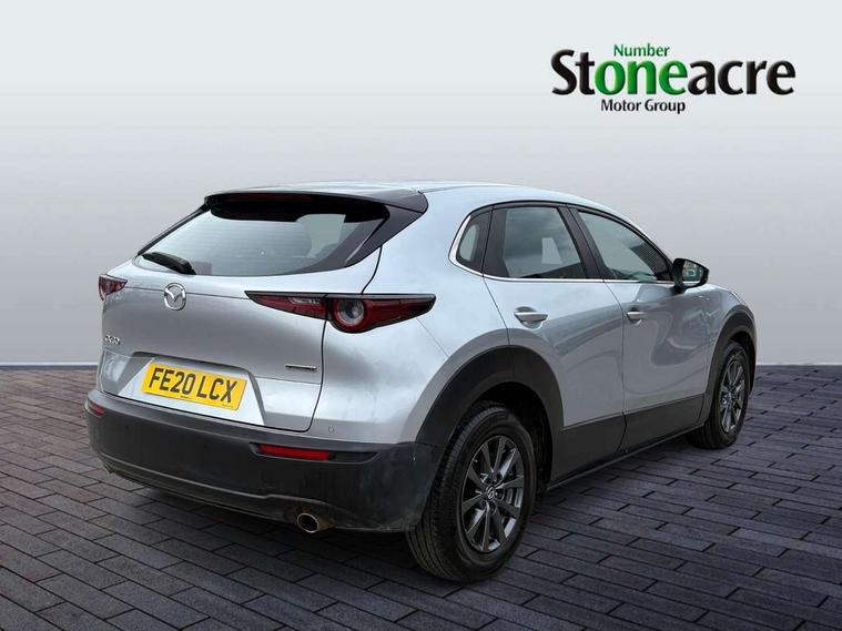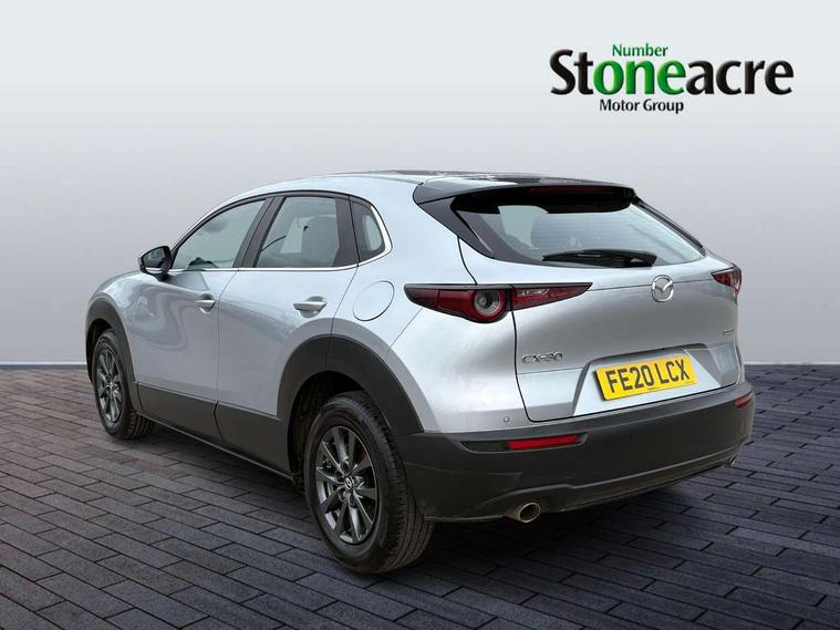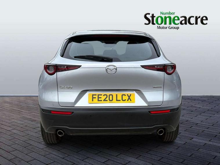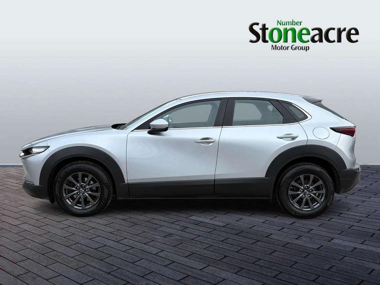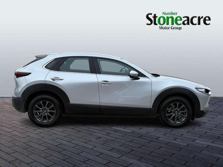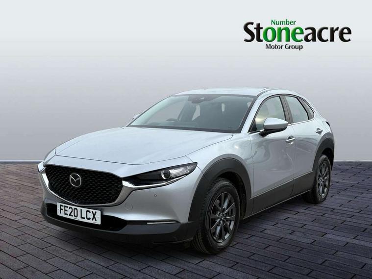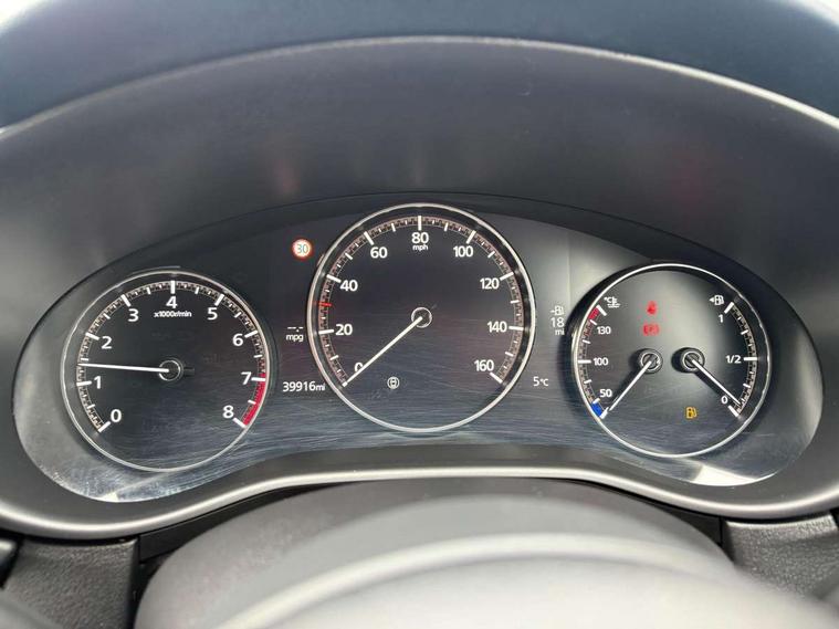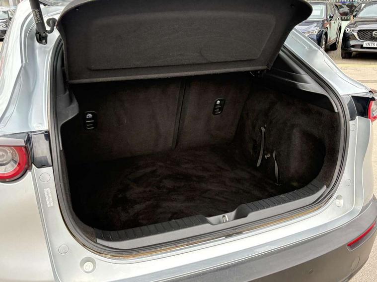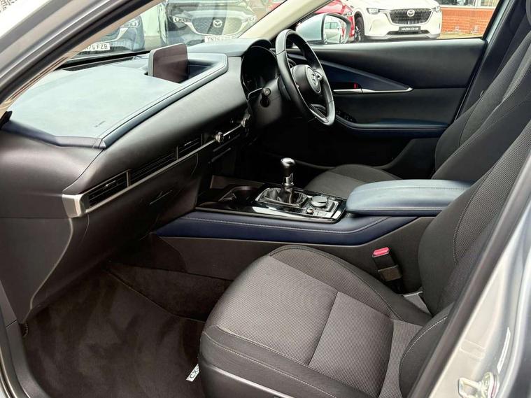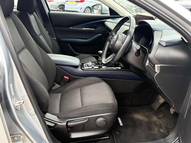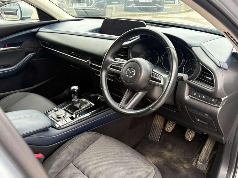 7" TFT Colour driver instrument panel display, 8.8" Colour centre touch screen display with Mazda Connect infotainment, Adaptive cruise control (Mazda radar cruise control) features stop and go, Apple car play/Android Auto, Blind spot monitoring with rear cross traffic alert, Driver attention alert system, E-call with GPS, Emergency stop signalling system, Engine start/stop button, Front and rear parking sensors, Integrated bluetooth, Integrated Mazda navigation system, Intelligent speed assist, Lane keep assist system (LAS) with Lane departure warning system (LDWS), PAS, Power lift gate, Reversing camera, Service indicator, Trip computer, Window projected colour active driving display (head up display) with traffic sign recognition, Cylinder Deactivation, i-stop, 2 USB charging ports, AM / FM / DAB radio with 8 speakers, CD player, Multimedia Commander including separate volume dial, Steering wheel mounted audio/bluetooth controls, B-pillar and C-pillar garnishes in material black finish, Auto dimming driver's door mirror, Auto dimming rear view mirror, Body coloured, electrically adjustable, heated auto power folding door mirrors with integrated indicators, Coming/leaving home lighting function, Dual chrome exhaust, Dusk sensing headlights, Electric front/rear windows with one touch auto up/down, Front grille in material black finish, Front kodo turn signal, Gloss black rear roof spoiler, LED headlamps with auto levelling, LED headlights with halogen daytime running lights and high beam control, LED rear combination lights with LED rear turn lights, Rain sensing front wipers with adjustable speed and intermittent wipe, Rear fog lights, Rear wiper, 12V power outlet in centre console, 60/40 split fold down rear seats, Cloth door panel inserts, Cloth upholstery with interior accents, Dashboard, door cards and front centre armrest in navy blue cloth, Driver and front passenger visors with covered vanity mirror and driver ticket holder, Driver seat manual slide, recline and height adjust, Driver, Front passenger and two rear grab handles with coathooks, Dual zone climate control air conditioning with rear air vents, Folding rear centre armrest with two cup holders, Front and rear (x3) head restraints, Front and rear door pockets, Front and rear LED lighting, Front armrest, Front centre storage with two cupholders, Front passengers seat manual slide, recline and height adjustment, Gear shift indicator, Glovebox illumination, Heated front seats with 3 stage setting, ISOFIX child seat anchorage points attached on outer rear seats, Leather wrapped gear shift knob, Leather wrapped steering wheel with telescopic and tilt adjustment, Luggage compartment light, Rear passenger seat map pockets, Roof mounted sunglasses holder, 3 point ELR front seat belts x2 with pretensioners, 3 point ELR rear seat belts, Anti-lock braking system (ABS), Driver/Front Passenger airbags, Drivers knee airbag, DSC - Dynamic Stability Control, Electronic parking brake with auto disengage function and auto hold function, Front and rear curtain airbags, Front passenger airbag cut-off switch, Front side airbags, Front smart city brake support, G-Vectoring control plus, Hill launch assist, Mild Hybrid system with regenerative braking, Seatbelt reminder for driver/front passenger and rear seats, Traction control system (TCS), Tyre pressure monitoring system (TPMS), Remote central locking with deadlocking and automatic door lock when driving, Smart keyless entry, Thatcham accredited alarm and immobiliser, 16" Grey metallic alloy wheels, Emergency tyre repair kit,