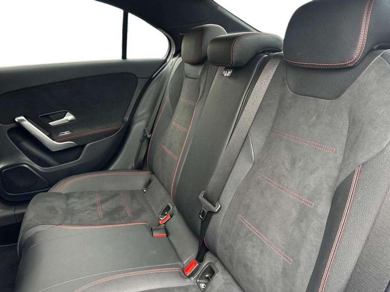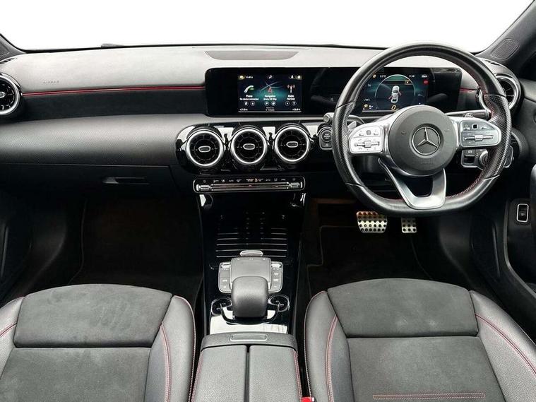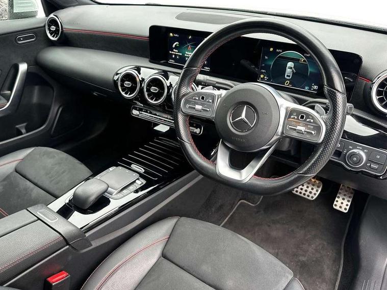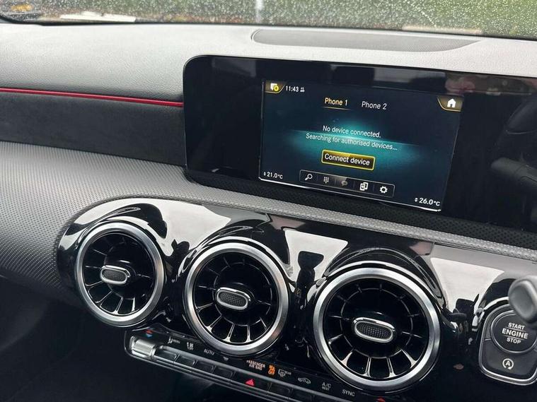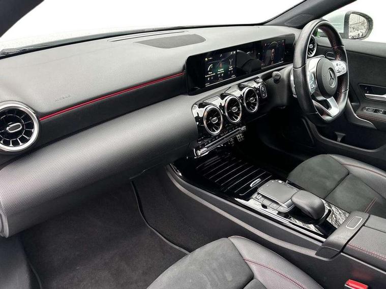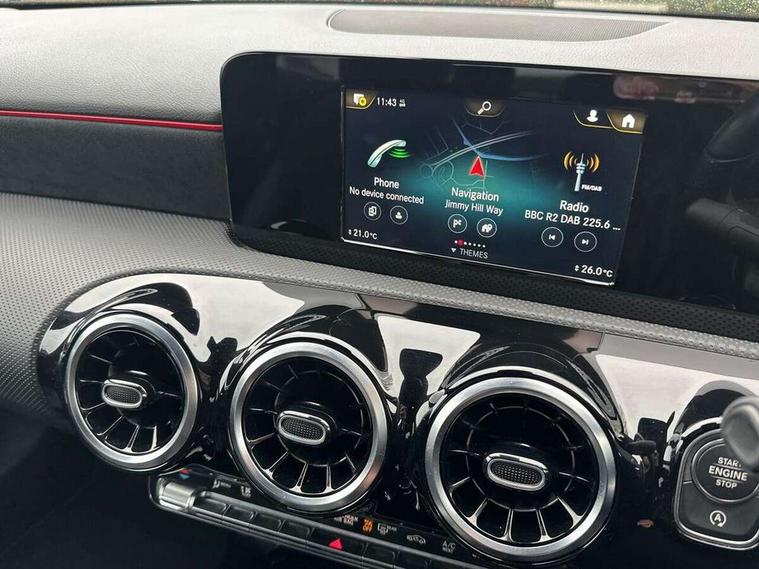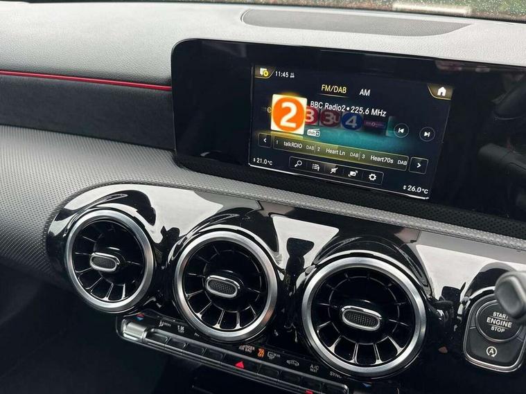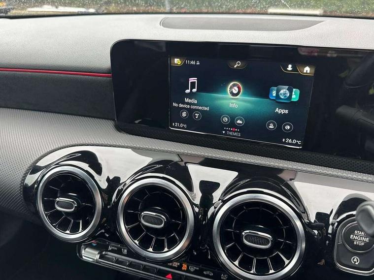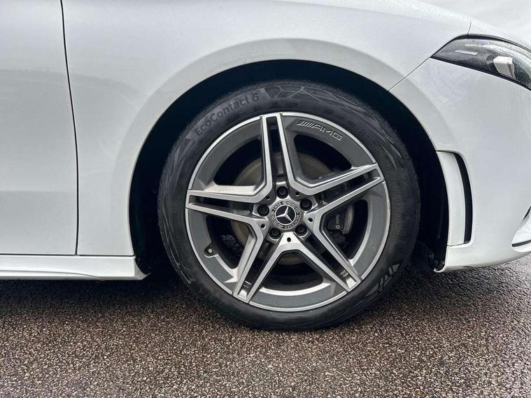 180 degree rear view camera with parking guidelines, 7" colour screen in instrument panel, 7" touchscreen media display, Attention assist, Brake pad wear indicator warning light, Car wash mode, Cruise control + speed limiter, Direct steering, Dual bluetooth interfaces, DYNAMIC SELECT with a choice of driving modes (ECO, Comfort, Sport and Individual), ECO start/stop function, Fluid level warning indicator for fuel, oil, coolant and washer fluid, Hard-disk navigation, Hey Mercedes Voice activation, Lamp failure indicator, Mercedes me connect including emergency call system, accident recovery, breakdown management and maintenance, Mercedes me remote services, Outside temperature gauge, Owners manual in English, Pre-installation for car sharing, Preinstallation for Mercedes Benz link, Service indicator (ASSYST), Speed sensitive power steering, Trip computer, Lowered comfort suspension, Rear axle torsion beam, 2 USB ports (type C) in rear stowage compartment and one in front of center console, 6 speakers, DAB Digital radio, MBUX multimedia system with DAB digital radio and touchpad including satellite navigation, Mercedes-Benz sound system - 100W, 4 Electric Front and Rear windows, Adaptive brake lights, AMG bodystyling - Front apron with splitter in chrome, rear apron with chrome trim and chrome visible trim elements in tailpipe, Black weather strip, Body colour bumpers, Body colour door handles, Body colour side skirt, Body coloured door mirrors, Chrome beltline trim, Diamond radiator grille with chrome pins and silver louvre + chrome insert, Electric adjustable and heated door mirrors with integrated LED side indicators, Exhaust system - Twin visible tailpipes in polished stainless steel, Headlamp assist automatic headlamp activation, Heated glass rear windscreen + timer control, LED high performance headlamps with integrated LED daytime running lights, LED tail lamp, LED third brake light, Privacy glass, Radio aerial, Rain sensing windscreen wipers with two sensitivity settings, Rear fog lights, Window line trim strip in chrome, 3 Spoke flat bottom leather multi function steering wheel with perforated leather in grip area, 40:20:40 split folding rear seats, Artico man-made leather/Microfibre Dinamica upholstery with red contrast stitching, Auto Mercedes-Benz child seat recognition sensor, Black air vents with surround in silver chrome, Black roof lining, Brushed stainless steel sports pedals with rubber studs, Controller on centre console with chrome surround, Floor mats with stitched edging and AMG lettering, Front centre armrest with storage compartment, Front door sills with Mercedes Benz lettering, Front seat backs luggage nets, Front seat cushion length adjustment, Galvanished gear shift paddles on steering wheel, Heated front seats, Height/reach adjustable steering column, Interior mirror with reading lamps in black and frameless, ISOFIX and top tether child seat fixing points in two outer rear seats, Manual height adjustable front seats, Rear head restraints, Seat occupancy sensor for front passenger seat, Sports seats with adjustable head restraints, Stowage compartment in centre console with retractable cover, Sunvisors with illuminated vanity mirrors, Touchpad on center console, Twin front cupholders, Two zone thermotronic luxury automatic climate control, Light and sight pack - A Class, Seat comfort pack - A Class, 3 rear 3 point seatbelts, ABS with Brake Assist, Active bonnet, Active brake assist includes forward collision warning system with autonomous braking, Adaptive brake assist with hold function and hill start assist, Black seatbelts, Childproof locks manually operated for rear doors and electrically operated for rear power windows, Crash responsive emergency lighting, Driver and passenger head and side airbags, Drivers knee airbag, Dual stage driver/passenger airbags, Electronic parking brake, ESP curve dynamic assist, ESP with ASR, Front and rear seatbelt reminder, Front brake callipers with Mercedes Benz lettering, Tyre pressure monitoring system, Warning triangle and first aid kit, Window airbags, Alarm system/interior protection/immobiliser, Keyless Go, Remote central locking and crash sensor with emergency opening function, Urban guard vehicle protection system with immobiliser and interior protection, Dinamica microfibre trim in black, 18" AMG 5 twin spoke light alloy wheels in titanium grey with highsheen finish, Summer tyres, Tirefit sealant kit,