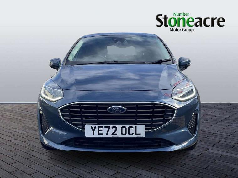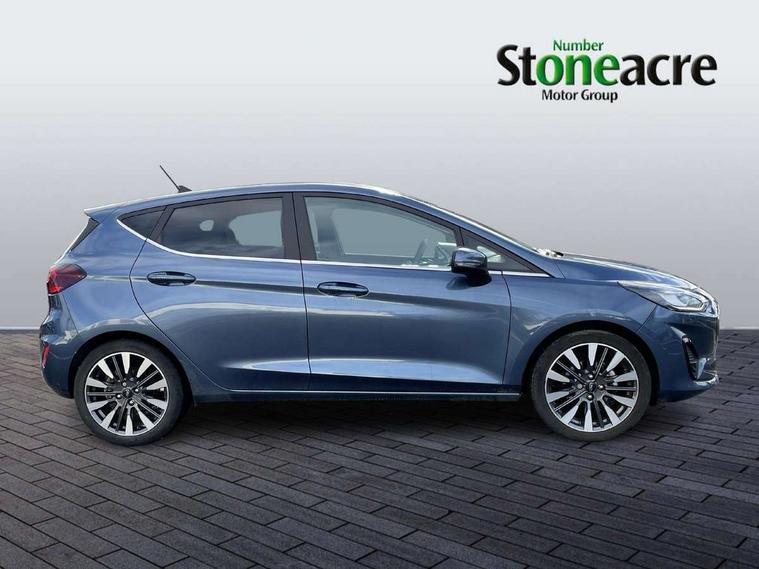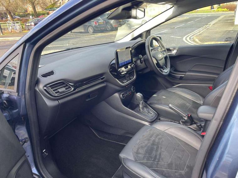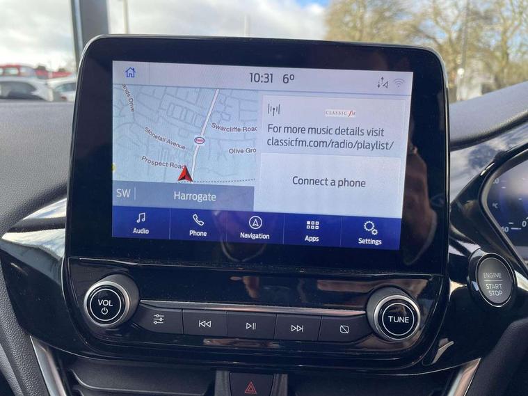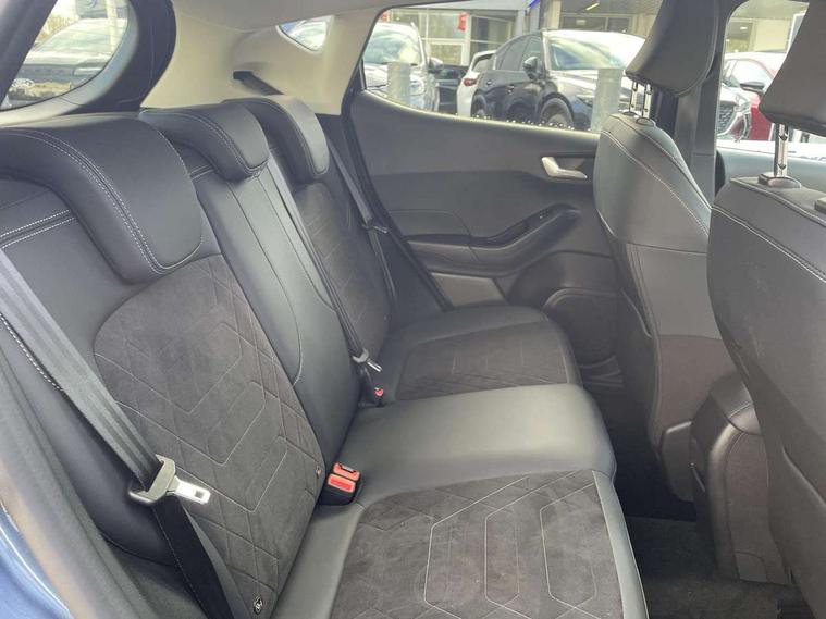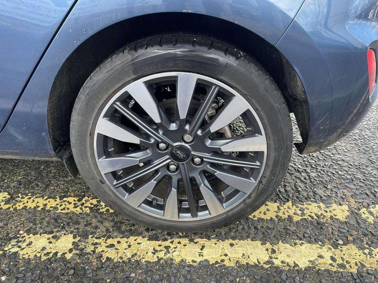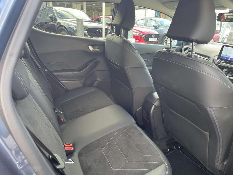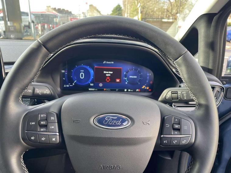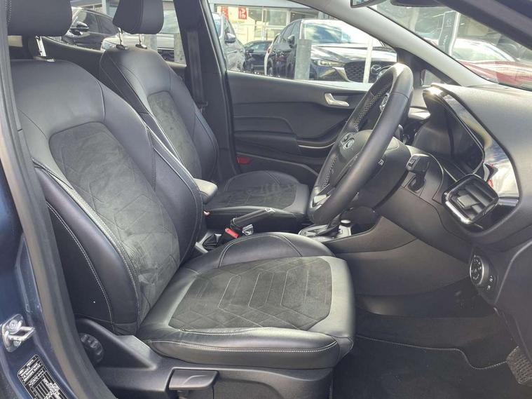 4.2" TFT instrument cluster screen, Bluetooth system, Electric power steering, Ford easy fuel, Rear parking distance sensors, Selectable drive modes (Normal, Sport, Track), Traffic sign recognition, Trip computer, 2 USB ports, Auxiliary input socket, B&O Premium audio system with 8" touchscreen, 10 speakers, 360 degree sound system, Ford SYNC 3 navigation system and Ford pass connect, DAB Digital radio, Steering wheel mounted controls, Auto high beam, Body colour bumpers, Body colour door handles, Body colour rear spoiler, Body coloured electrically operated and heated door mirrors with side indicators, Chrome beltline trim, Chrome front grille, Chrome lower window surround, Cornering front fog lights, Electric front windows/one touch facility, Electric rear windows, LED Night signature to rear lights, Power foldable door mirrors with puddle lights, Quickclear heated windscreen, Rain sensing wipers and auto dimming rear view mirror, Rear privacy glass, Rear wiper, 3 spoke leather trimmed steering wheel with audio control, 60/40 split folding rear seat, Adjustable head restraints, Boot carpet, Centre console with opening armrest, 2x cupholders, 12v and USB, Chrome inner door handles, Drivers and Passenger lumbar support, EATC - Electronic Auto Temperature control, Footwell illumination, Front floor mats in velour, Front map reading lights, Front seat and rear pockets, Height adjustable passenger seat, Illuminated glovebox, Leather gear knob, LED ambient lighting, Load area light, Luxury woven headliner, Manual 4-way driver seat adjust, Overhead console with sunglasses holder, Pollen filter, Rake/reach adjustable steering wheel, Sensico partial premium upholstery, Sensico wrapped steering wheel, NCAP Pack - Fiesta, 3 point seatbelts on all rear seats, ABS+EBA, Curtain airbags, Driver and passenger airbags, Drivers knee airbag, Electronic stability control with hill start assist, Front passenger airbag deactivation, Front side airbags, Seatbelt warning, Two tone horn, Tyre pressure monitoring system, Ford keyfree system with Keyless entry and keyless start, MyKey system, Remote central locking & engine immobiliser, Thatcham Cat.1 alarm, 17" 8 spoke alloy wheels,