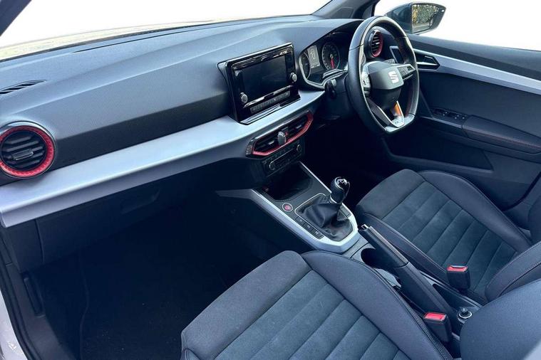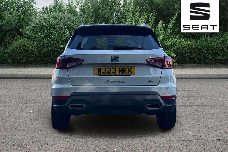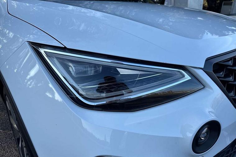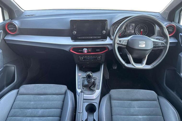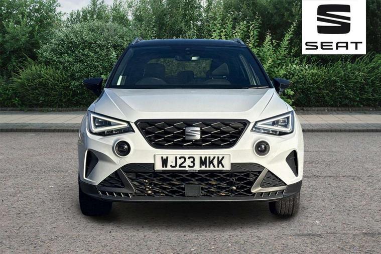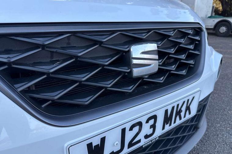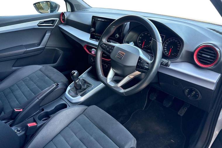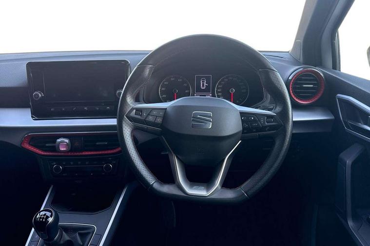 'Lights On' Reminder warning buzzer, Analogue cockpit with physical dials, Digital clock, E-call, Electric speed sensitive power steering, Full Link Smartphone Integration with Mirror Link, Apple Car Play, Google Android Auto with USB Type C cable for Apple and Android compatibility, Lane keeping system, Low fuel warning light, Outside temperature display, Rear parking sensor, RPM counter, Seat connect with safety, service and remote, SEAT Drive profile - Four different models normal-sport-eco-individual, steering response, throttle response, Trip computer, Wireless phone charger, Bluetooth interface for hands free and audio streaming, DAB digital radio and AM/FM radio, Media system with 8.25" colour touchscreen with USB port (type c), Steering wheel mounted audio controls, Anti theft roof antenna, Automatic activation of hazard warning lights, Body coloured bumpers, Body coloured door handle inserts, Chrome roof rails and window surrounds, Dark tinted rear windows, Dimming rear view mirror, Electric front/rear windows, Electrically adjustable and heated door mirrors, Front fog lights with cornering function and rear fog light, FULL LED automatic headlights with dynamic headlight range control, coming and leaving home, LED daytime running lights, LED rear tail lights and licence plate lights, Protective side mouldings, Rear side wing doors, Rear spoiler, Rear window wash/wipe, Roof colour door mirrors, Third brake light, Twin exhaust pipe styling hidden exhaust pipe, Visible VIN plate, Windshield wiper with intermittent control and potentiometer, 2 cupholders, 3 seat bench in 2nd row, 60/40 split folding rear seat, Aircare filter, Black interior roof, Double boot floor, Driver sunvisor with covered mirror + card holder, Dual zone climate control, Front comfort seats, Front courtesy light with 2x front and 2x rear reading lights, Gear shift indicator, Height adjustable front seats, Height/reach adjustable steering column, Illuminated boot, Instrument lighting with brightness control, Interior ambient lighting, Interior light in footwell, central console and door panel, ISOFIX points in outer rear seats with top tether anchorage points, Microsuede cloth upholstery, Passenger sunvisor with vanity mirror, Perforated flat bottomed leather steering wheel/gear knob/handbrake with red stitching and FR logo, Single front passenger seat, Two front and three rear height adjustable headrests, Interior chrome pack - Arona, 3 point seatbelts on all rear seats, ABS, Active front headrests, Child locks on rear doors, Driver and front passenger airbags with front passenger airbag de activation, front side and curtain airbags, Electronic stability control, Emergency Brake Assist (EBA) and front assist, Front and rear seatbelt reminder, Hill hold control, Multi-Collision braking, Tiredness recognition system, Traction control, Tyre pressure monitoring system, Alarm with back-up horn, Electronic engine immobiliser, KESSY Keyless entry and go, Locking wheel bolts, Remote central locking + deadlocks, Tow away protection, Titan black dashboard,