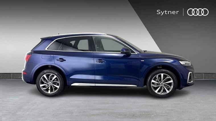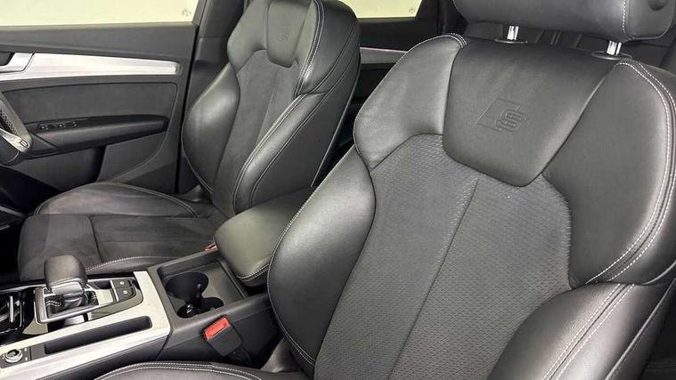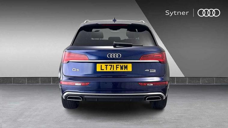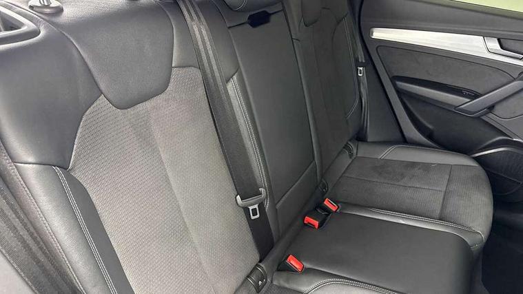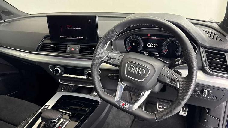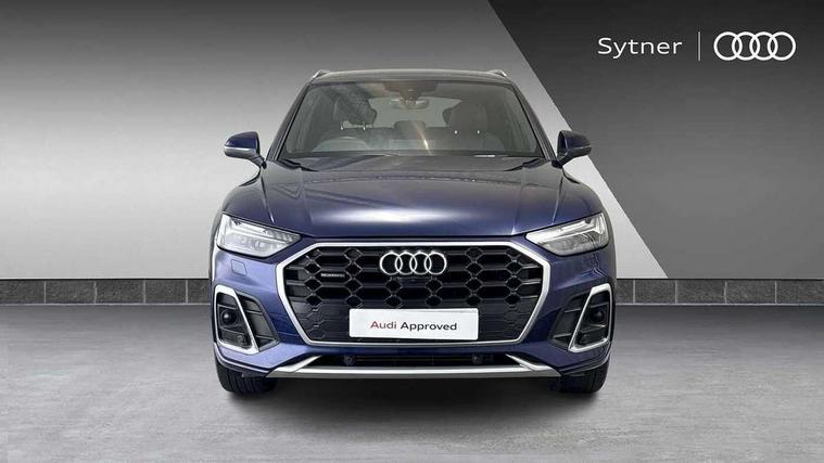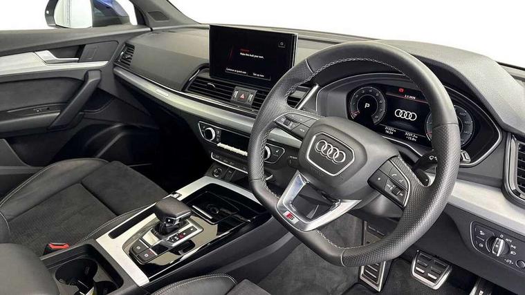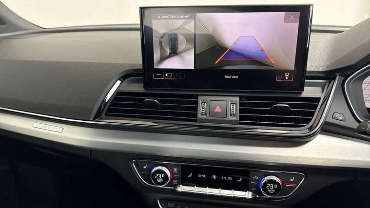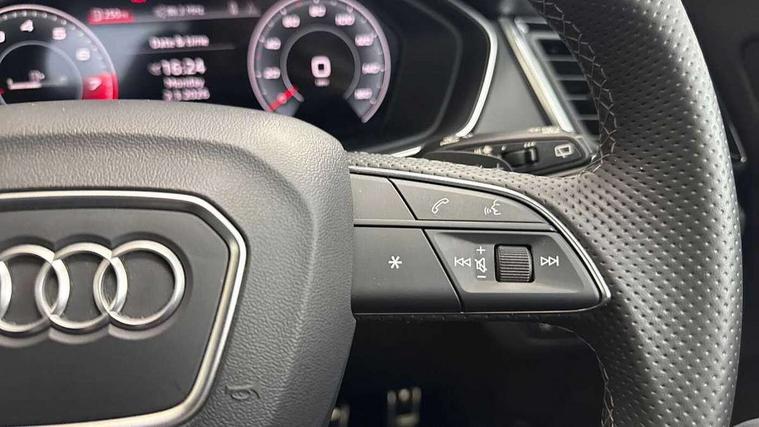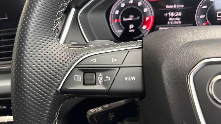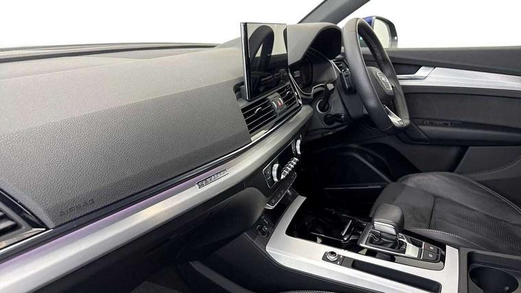 Audi connect safety and service (e-call), Audi connect with Amazon Alexa Integration, Audi drive select, Audi virtual cockpit plus with 12.3" screen and three different layout designs, Audi wireless smartphone interface, Automatic start-stop system with coasting functionality and efficiency programme, Bluetooth interface, Electro - mechanical power assisted steering, MMI navigation plus with 10.1" touch screen, Power tailgate, Reversing camera, Service interval indicator, Voice control system with Audi hotword activation "Hey Audi", Quattro on demand, S line sports suspension, DAB Digital radio, Acoustic windscreen, Aluminium roof rails, Audi matrix LED headlights with dynamic front and rear indicators, Auto dimming rear view mirror, Automatic headlights and windscreen wipers, Body colour bumpers, Body colour door mirrors, Body colour rear diffuser with matt aluminium silver surrounds, Body colour underbody protection, Chrome plated exhaust trims, Door sills in Selenite silver, Electric adjustable/heated/folding door mirrors, Front air inlet surrounds in aluminium, Front and rear electric windows, Front radiator grille in honeycomb design, Headlight washers, Lower bumpers painted in contrast Manhattan grey, Rear chrome trim strip below lights, Rear privacy glass and rear side windows, Rear spoiler, Rear wiper, Roof bars, S Line badges on the front wings, S Line front and rear bumpers, S Line side skirts, 2 x USB charging port with aux input socket, 3 rear headrests, 40:20:40 split folding rear seat with rear centre armrest, Black cloth headlining, Comfort front centre armrest, Contrast stitching on seats, steering wheel and gear lever gaiter, Deluxe 3 zone electronic climate control, Front/rear floor mats, Gear lever in black leather, Heated front seats, Height adjustable front head restraints, Height/reach adjustable steering column, Illuminated door sill trims with S logo, ISOFIX child seat mounting and top tether, Luggage compartment cover, Manual seat adjustment with 4-way electric lumbar support, Removable luggage compartment floor, Stainless steel pedals, Sunvisors with vanity mirrors, High gloss pack - Q5, LED interior light pack - Q5, 3 point seatbelts on all seats, 6 airbags - Driver, front passenger, curtain and side airbags, Electrically operated child locks on rear doors, Electromechanical parking brake, Electronic stabilisation control including ABS, ASR and EDL, Front passenger airbag deactivation, Hill descent control, Hill hold assist, Multi collision brake assist, Pop-up bonnet for pedestrian protection, Pre sense city, Seat belt force limiter, Seatbelt monitoring, Tyre pressure warning, Warning triangle and first aid kit, Anti theft alarm, Anti-theft wheel bolts, Keyless Go access/ignition system, Matt brushed aluminium inlays,