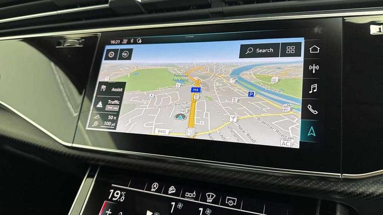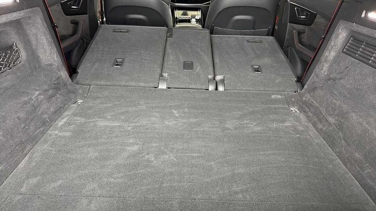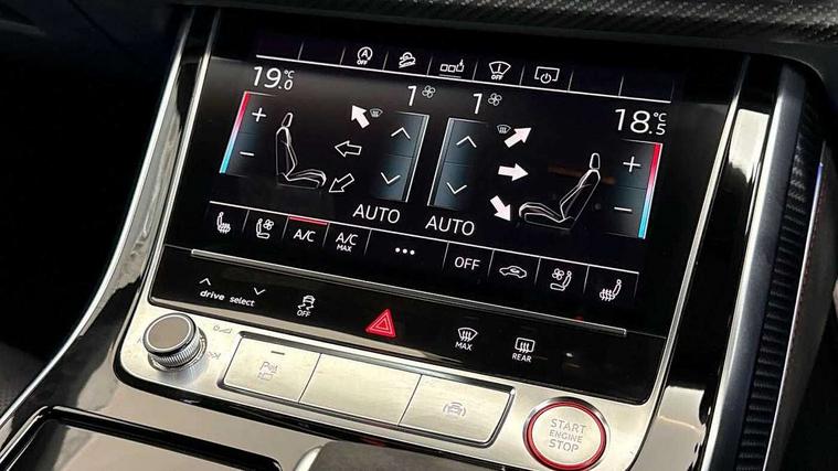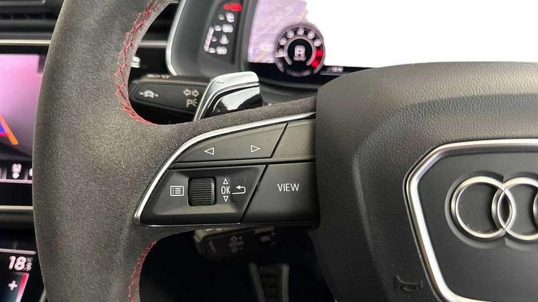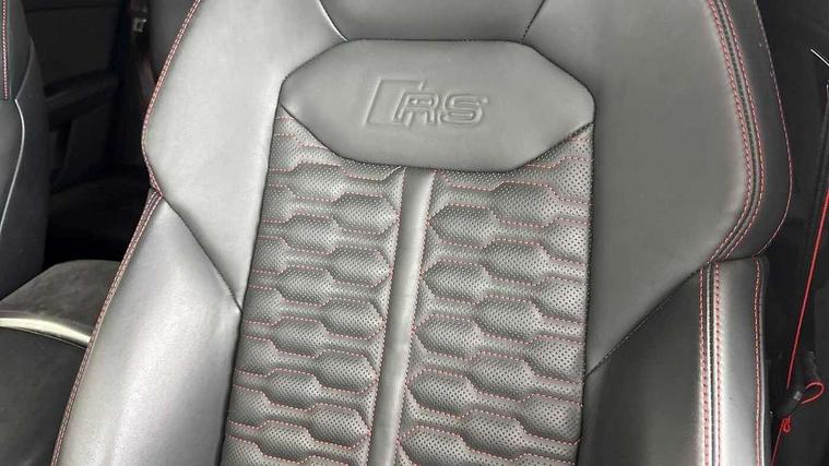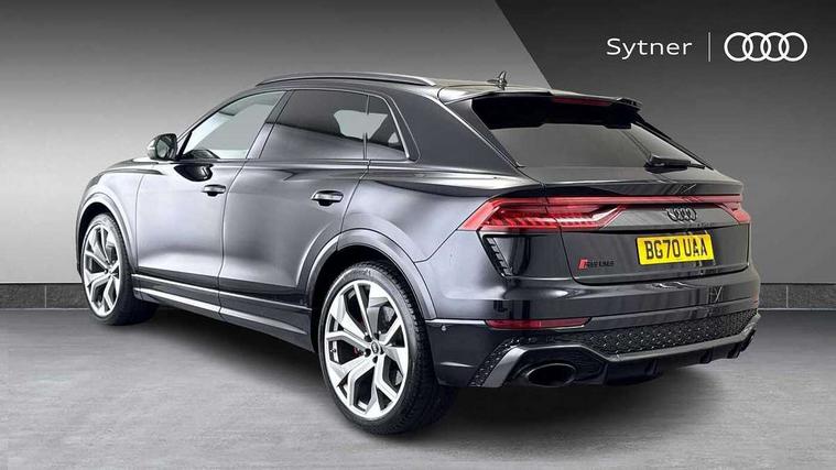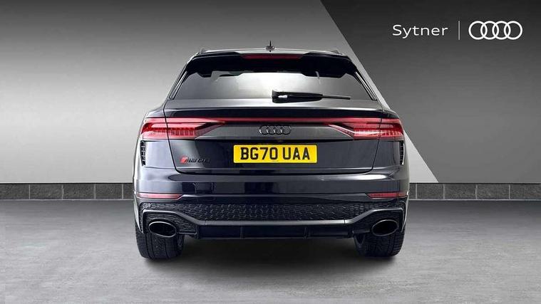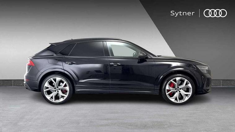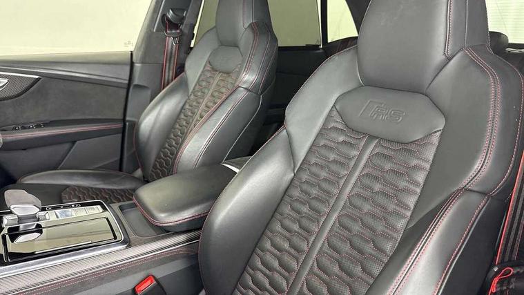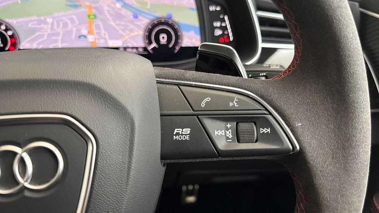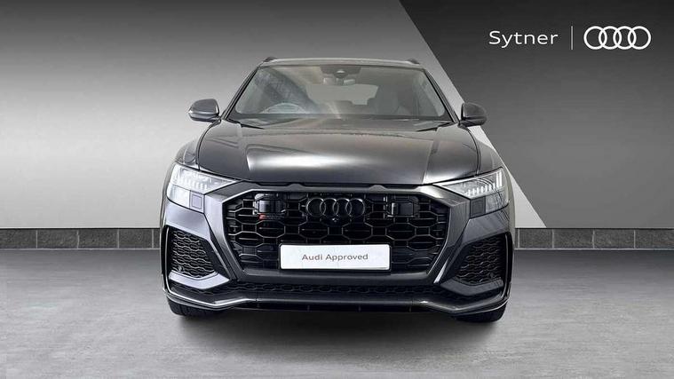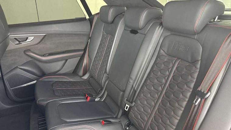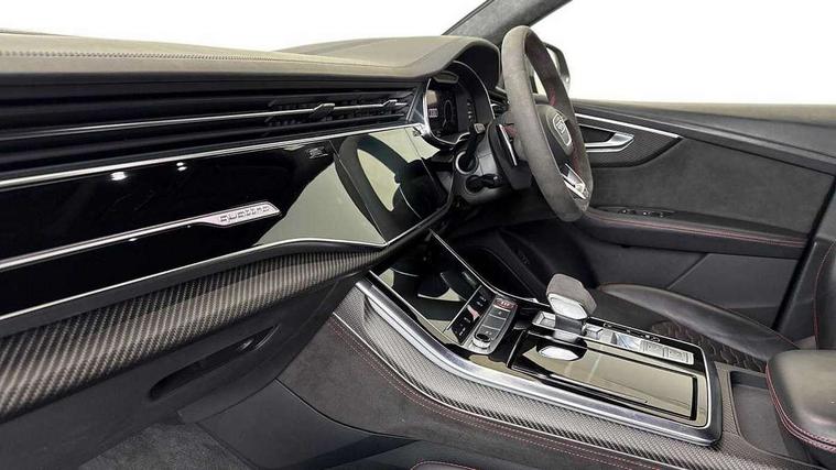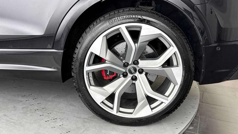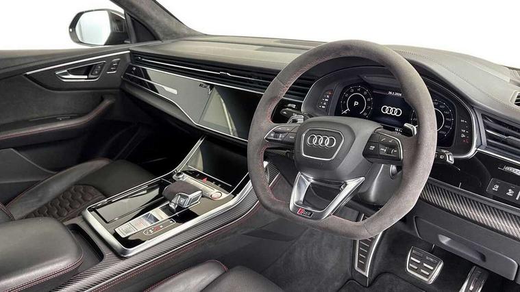 10.1" and 8.6" Dual colour touchscreens, All wheel steering, Audi connect safety and service (e-call), Audi parking system plus with front and rear sensors, Audi phone box with wireless charging, Audi smartphone interface with wireless Apple CarPlay, Audi virtual cockpit - 12.3" high resolution LCD display with fully customisable instrument cluster and RS specific menus and options, Automatic start/stop system, Electro-mechanical PAS, MMI navigation plus with MMI touch, Natural voice recognition, On board computer, Operating buttons in black, glass look with haptic feedback, Power operated tailgate, Rear view camera, RS Audi drive select, Service interval indicator, 48V Mild hybrid technology, Electromechanical active roll stabilisation, Quattro all wheel drive with sport differential, RS specific Adaptive air suspension, Audi music interface with 2 USB ports with charge and data functions, Audi music interface with 2 USB ports with charge and data functions in the rear, Audi sound system with 6 channel amplifier, 180 watt amplifying capacity and 10 loudspeakers including subwoofer, Aux-in socket, DAB Digital radio, Audi Beam uses LEDs to project the Audi logo, Audi HD Matrix LED headlights in RS specific design with dynamic front and rear indicators, Auto dimming frameless rear view mirror, Carbon exterior door mirrors, Electric front+rear windows, Electrically adjustable/heated/folding/auto dimming door mirrors with integrated LED indications + kerb view function for passenger side, Gloss black finish for exterior Audi rings and RS Q8 logo, Headlight washers, Heat insulating glass in windshield, Illuminated door sill trims with RS logo, LED signature daytime running lights, Privacy glass - dark tinted rear and rear side windows from B-pillar backwards, Rain and light sensors, Rear wiper, RS badges on front wings, RS coming/leaving home animations in front and rear, RS manhattan grey front spoiler lip and rear diffuser insert, RS specific bumpers in full body colour paint finish, RS sport exhaust system with black exhaust tips, 4 zone automatic climate control, 4-way lumbar support for front seats, 40:20:40 split folding rear bench seat, Comfort front centre armrest, Double sun visor with illuminated vanity mirror on driver and passenger side extendable, Driver and front passenger seat memory function for electrically adjustable front seats, Electric adjustable steering column with memory functionality, Electric sunblind for the rear side windows and manual sunblind for the rear window, Front and rear head restraints, Front seat ventilation operated through MMI system, Heated front seats, ISOFIX child seat mounting for front passenger seat and 2 outer rear seats with top tether child seat mounting for all 3 rear seats, Luggage compartment sill protection in stainless steel, Perforated Valcona leather upholstery + RS front super sports seats + honeycomb pattern with RS embossed logo, Rear seat bench plus, Stainless steel pedals, Air quality package - RS Q8, Carbon styling pack - RS Q8, Multi-coloured extended LED interior lighting pack - RS Q8, RS specific styling pack - RS Q8, 3 point seatbelts on all seats, Audi pre sense front, Driver and front passenger, front side and curtain airbags, Electromechanical parking brake, Electronic Stability Control (ESC) including ABS, ASR and EDL, Hill descent control, Hill hold assist, Predictive pedestrian protection, Seatbelt monitoring, Tyre pressure loss indicator, Warning triangle and first aid kit, Advanced key, Anti theft alarm with tow away protection, Anti-theft wheel bolts and wheel loosening detection, Immobiliser, Matte carbon twill inlays, 23" x 10.5J 5 Y spoke rotor design Audi sport alloy wheels in gloss black, Tool kit, Tyre repair kit,