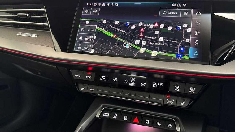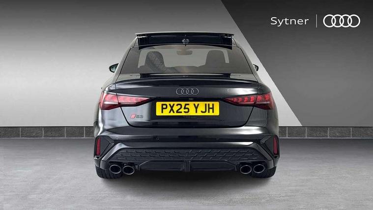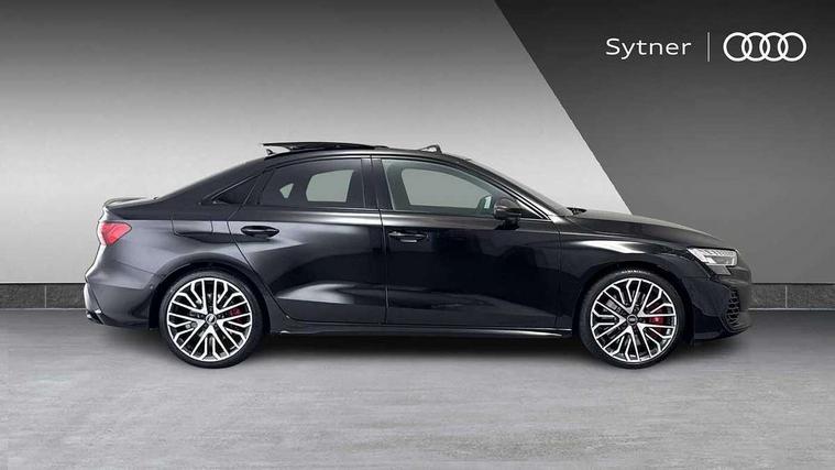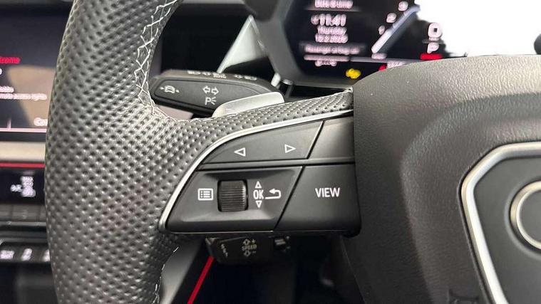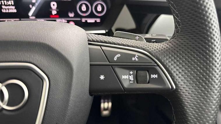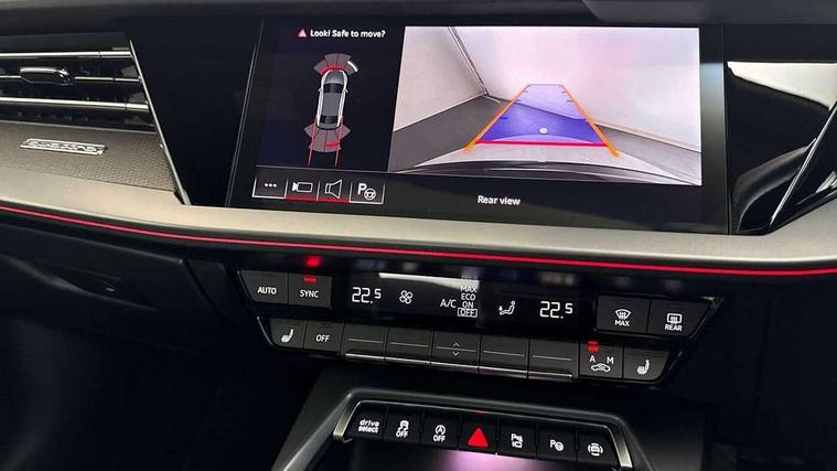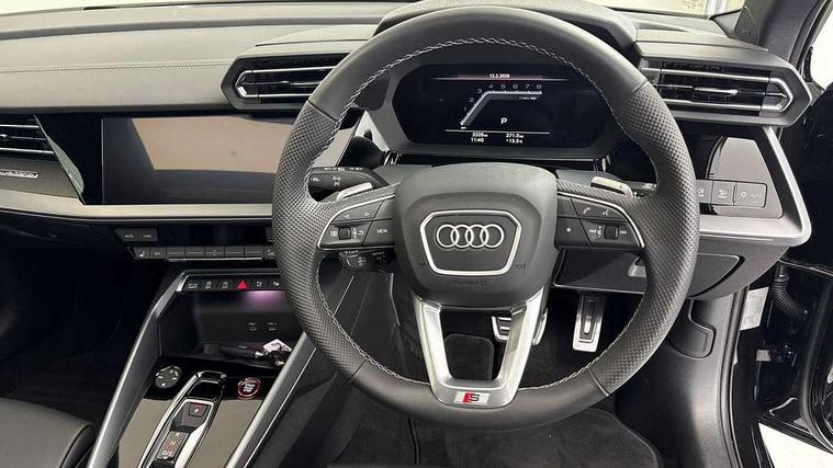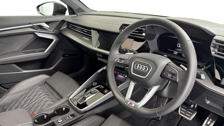 Adjustable speed limiter, Audi drive select, Audi smartphone interface with app store includes wireless Apple carplay, Android auto and Amazon alexa integration, Audi virtual cockpit plus - 12.3" full HD resolution dynamic digital instrument cluster, Automatic start/stop system with recuperation, Bluetooth interface, Camera based traffic sign recognition, Collision avoidance assistant, Distraction and Fatigue warning, e-Call (emergency call), Lane departure warning system, MMI Navigation Plus with high resolution 10.1" colour touch screen display, Park Assist with parking system Plus, Progressive steering, Service indicator, Trip computer, Voice control system with natural language interaction, quattro permanent all-wheel drive with torque splitter, S suspension with damper control, Audi Phonebox light with wireless charging, DAB Digital radio, USB ports with charging function in the rear, Anthracite grey Audi rings (front and rear), Audi Beam uses LEDs to project Vorsprung onto the ground as you exit your S3, Auto dimming frameless rear view mirror, Black accents front and rear bumpers including air inlets, Black accents in front grille and frame, Black accents in window trims, Carbon door mirror housings, Dipped beam, main beam, position light and turning light, Electrically adjustable/heated/folding/auto dimming door mirrors with integrated LED indications + kerb view function for passenger side, Exterior model badging, Front electric windows, Heat insulating glass windscreen, Illuminated door sills with aluminium inserts at the front with S logo, LED 3rd brake light, LED daytime running x3, Light and rain sensors, Privacy glass - dark tinted rear window, rear door and side windows, Rear boot, Rear diffuser and grill in grained matt black with inlay in dark liquid chrome, Rear electric windows, Rear side wing doors, S grille, S3 front bumper with S specific air intake grilles, 12V socket and storage compartment in front centre console, 3 seat bench in 2nd row, 3 spoke leather multifunction steering wheel with gear shift paddles, 3-zone deluxe automatic air conditioning, 4 way electrically adjustable lumbar support for driver and front passenger, 40/20/40 split folding rear seat bench, Black cloth headlining, Black front and rear floor mats, Fine Nappa leather upholstery with front sports seats S embossed logo, Front and rear centre armrest in artificial leather with contrasting stitching on armrests and instrument panel, Front and rear headrests, Heated front seats, Height and reach adjustable steering wheel, Manual boot compartment lid, Rear centre armrest with cupholder, S badging on the steering wheel, Seat side bolsters, Single front passenger seat, Stainless steel pedals and front footrest in black, Aluminium interior elements pack - A3, Extended ambient lighting package Pro with Multi-coloured contour lighting of instrument panel - S3, Storage package - A3 Saloon, Technology package pro - A3 S Tronic, 3x3 point rear seat belts, Driver and front passenger airbag with passenger airbag deactivation, Electronic Stabilisation Control (ESC) including ABS, ASR and EDL, First aid kit with warning triangle and 2 safety vests, Front side airbags with head airbags and interaction airbag, Hill hold assist, Pre-sense front with pedestrian and cyclist detection, Seatbelt monitoring, Tyre pressure loss indicator, Anti theft alarm, Anti-theft wheel bolts, Electronically operated child locks, Immobiliser, Black dashboard, Inlays in carbon atlas structure, Tyre repair kit,