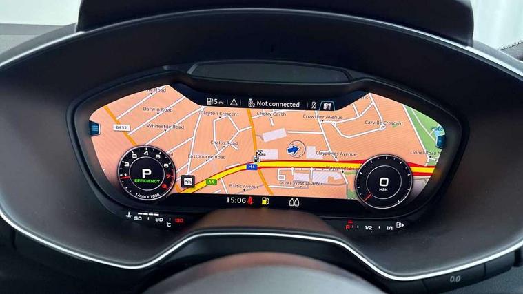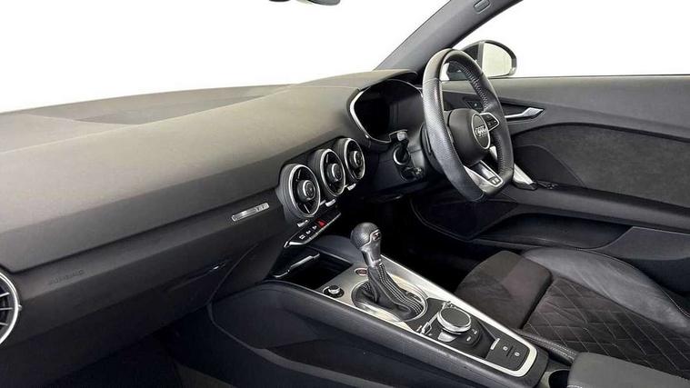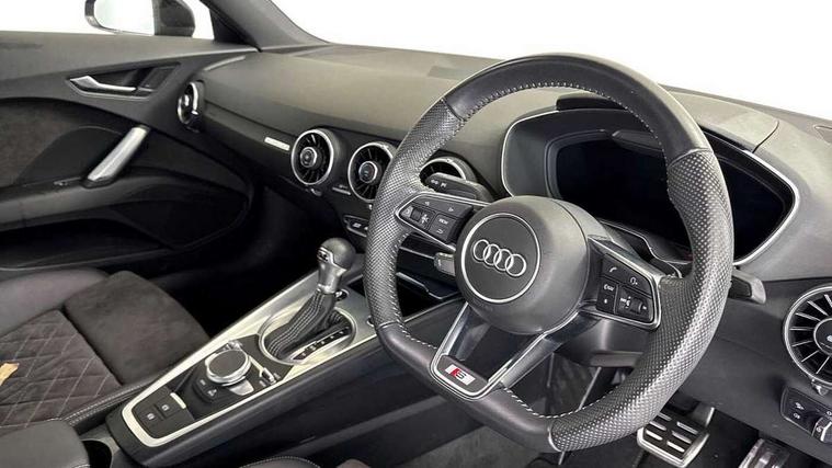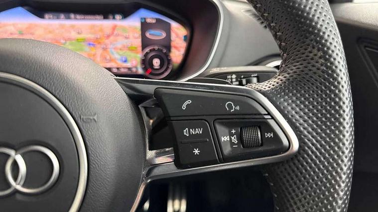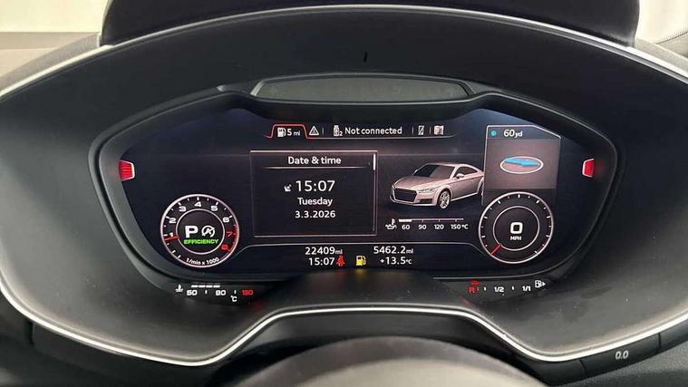 Audi drive select with 4 Pre configured modes, Audi smartphone interface, Audi virtual cockpit - 12.3" high-resolution LCD display with fully customisable instrument cluster, Cruise control + speed limiter, Emergency call service, MMI touch panel, Mobile phone preparation with bluetooth interface, Progressive power assisted steering, Service interval indicator, Start/Stop system with energy recuperation, TP memo, Sports suspension, AM/FM radio, Bluetooth audio streaming, DAB Digital radio, MMI Radio with CD player and SD/XC card slot, 3rd brake light, Auto dimming rear view mirror, Auto headlight range control, Black chrome tailpipe, Dark privacy glass from B-pillar backwards, Electric folding door mirrors, Electric front windows, Electrically adjustable and heated door mirrors with integrated LED side indicators, Front fog lights, Green tinted heat insulating glass, LED daytime running lights, LED headlights with LED rear lights + dynamic rear indicators, Light and rain sensors, Rear boot, Sunband for windscreen, 12V socket, 2 rear seats, 3 spoke flat bottomed high multi-function leather sport steering wheel with gearshift paddles, 4 way electric lumbar support for driver and front passenger, Black headlining, Contrasting silver stitching in steering wheel, Door sill trims, Extended aluminium look with stainless steel pedals, Front centre armrest, Front passenger seat, Front super sports seats, Heated front seats, Height adjustable driver's seat, Height adjustable front head restraints, Height/reach adjust steering wheel, ISOFIX child seat mounting for front passenger seat with airbag deactivation, Manual adjustment of seat height, fore/aft position, seat angle, seat depth and backrest angle, Perforated leather gearknob in black, Rear head restraints, Rear top tether child seat ISOFIX attachment, Split folding rear seat, Black styling pack - TT, Non smoking pack - TT/TT RS, 3 point front seat belts, ABS, ASR traction control, Curtain airbags, Driver and front passenger airbag with front passenger airbag deactivation, EDL traction control, Electromechanical parking brake, ESP, First aid kit, Front side airbags, Head airbags, Hill hold assist, Seatbelt warning, Tyre pressure loss indicator, Warning triangle, Anti theft alarm, Anti theft wheel bolts, Immobiliser, Keyless Go, Remote central locking, Matt brushed aluminium inlays, Tool kit, Tyre repair kit,