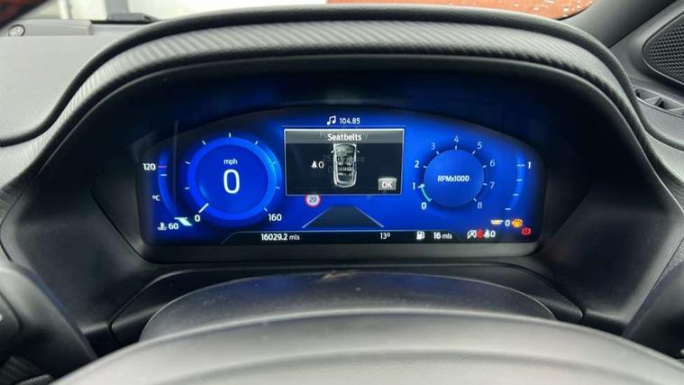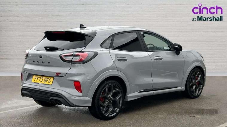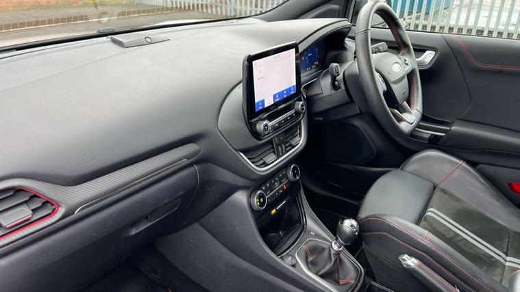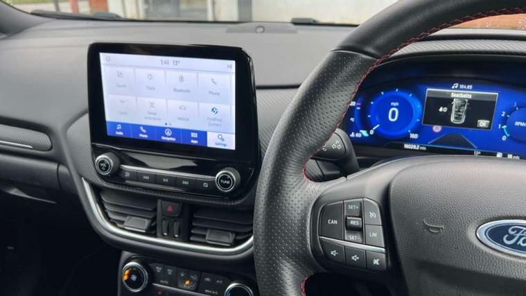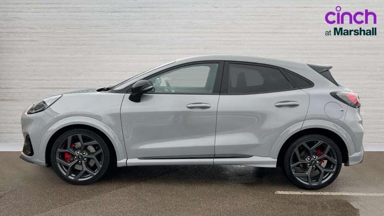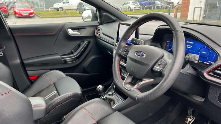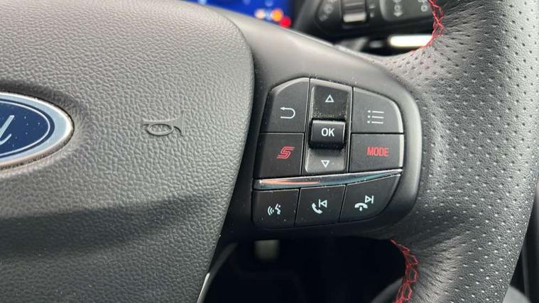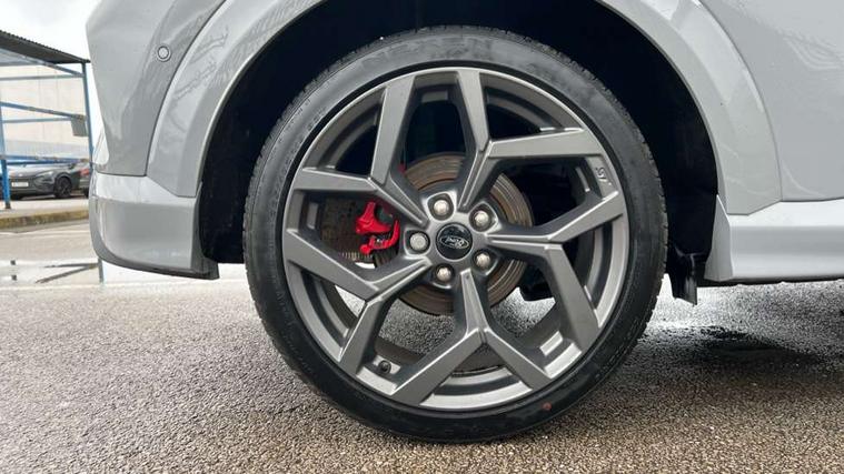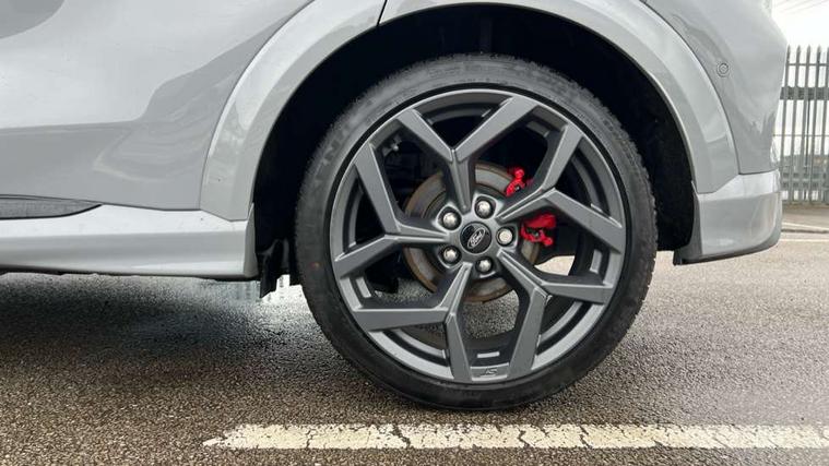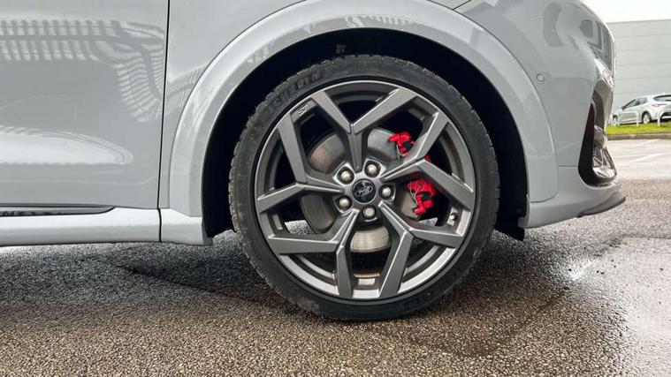 Cruise control with Intelligent speed assist, Driver impairment monitor, Emergency call service, Ford easy fuel, Front and rear parking sensors, Full digital 12.3" instrument cluster, Lane keeping aid with lane departure warning, Power assist steering, Selectable drive modes (normal, sport, eco, track), Speed sign recognition, Engine sound enhancer, ST suspension, Automatic headlights with auto high beam, Automatic rain sensing wipers, Dual chrome exhaust, Fixed LED signature headlamps, Front fog lamps, LED daytime running lights, LED rear lamps, Power foldable heated door mirrors with puddle lamps and puma logo protection, Privacy glass to side rear windows and tailgate glass, Quickclear heated windscreen, Rear side wing doors, Rear wiper, ST scuff plates, Third brake light, Unique ST body styling kit including contrast black roof, large rear spoiler and wing mirrors, plus Ford Performance embossed splitter, 3 seat bench in 2nd row, Alloy sports pedals, Centre console with armrest and stowage, Ford megabox extended bootspace, Ford Performance sensico partial premium leather upholstery with metal grey stitching, Front and rear floor mats, Front and rear head restraints, Manual 6 way driver seat adjust with lumbar adjustment, Manual 6 way passenger seat with lumbar seat adjustment, Single front passenger seat, ST flat bottomed steering wheel with metal grey stitching, ST logo projection, Unique ST gear shift knob, Wireless charging pad with electronic air temperature control (EATC), B&O Premium Audio system + Ford SYNC 3 navigation pack - Puma, Winter pack - Puma, 3 rear seatbelts, Child safety lock, Electronic stability control (ESC) and hill start assist, Pedestrian/cyclist detection & post-collision braking, Pre collision assist system, Red brake calipers, Tyre pressure monitoring system (TPMS), Keyless entry and power start button, Thatcham alarm, Carbon look interior deco spears, 19" 5 Spoke magnetite dark finished alloy wheel, Tyre inflation kit,
