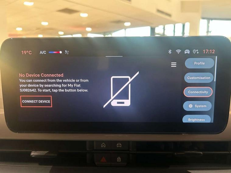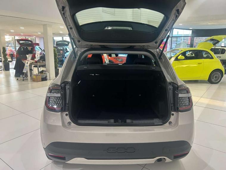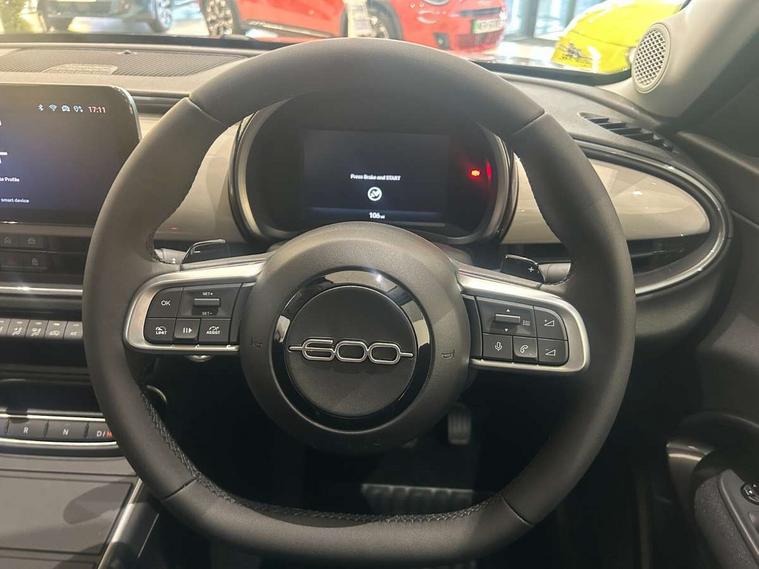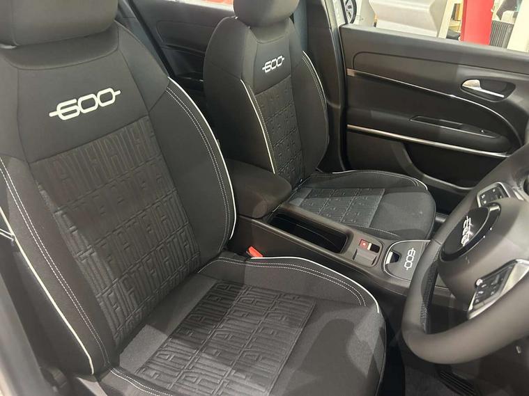 7" TFT digital cluster, Bluetooth connectivity, BSRF connectivity box, Connected services, Cruise control, Drowsy driver detection, Emergency E-call assist, Engine emission level default, GSR II step 1, Intelligent speed assist, Lane keeping assistant (LKA), Odometer, Power assist steering, Rain and dusk sensors, Rear parking sensors, Traffic sign recognition, Wireless apple car play/android Auto, Without drive mode selector, L2-AGM 12V battery, 1st Row USB type-A and USB type-C, 4 speaker audio system, Radio, Uconnect infotainment 10.25" touchscreen with DAB, All power windows express Up/Down, Auto dimming frameless rear view mirror, Automatic headlights, Body coloured door handles, Chrome day light openings, Electric adjustable door mirrors, Exterior chrome accents, Front and rear Chromed 600 logo, Gloss black finish B pillar, Gloss black shark fin antenna, Glossy black door mirrors, Heated windscreen wiper blade area, LED 3rd brake light, LED daytime running lights, LED Fog lamps with cornering function, LED front signature lighting, LED front turn indicators and position lights, LED rear lights, LED rear signature lighting, LED reflector headlamps, Matt black side skirts with 600 chromed logo, Rear bumper embossed 600 logo, Rear roof spoiler, Rear side wing doors, Rear wiper, 2 Spoke synthetic leather steering wheel with audio control, 3 rear headrests, 3 seat bench in 2nd row, 4 way manually adjustable passenger seat, 6 way manually adjustable drivers seat, Auxilliary 12V power socket, Body colour dashboard fascia, Chrome interior door handles, Dark metachrome dashboard ring, English handbook, Front centre armrest, Front headrests, Front passenger grab handle, Front seatback pockets, ISOFIX attachment on front passenger and rear passenger seats, Manual climate control, Metachrome central compartment bezel, Monogram fabric upholstery, Paddle shifts, Partial body cover for shipment, Predisposal for accessory upgrade to default tunnel pad cover (dedicated prnd bezel), Rear seat 40/60 split, Single front passenger seat, Smart 15L storage central tunnel with tunnel pad cover, Sunvisor label ciao Fiat, Sunvisors with vanity mirrors, 3x3 point rear seatbelts, 6 airbags, ABS, Autonomous Emergency Brake (AEB) & Vulnerable Road User (VRU) Protection, Child locks on rear doors, Electronic parking brake with auto hold, ESC (Electronic Stability Control), Front passenger airbag deactivation, Seatbelt reminder and pretensioners for all seats, Anti-theft volumetric alarm, Anti-theft wheel bolts, Keyless Go, 17" Diamond cut alloy wheels, Fix and go puncture repair kit,