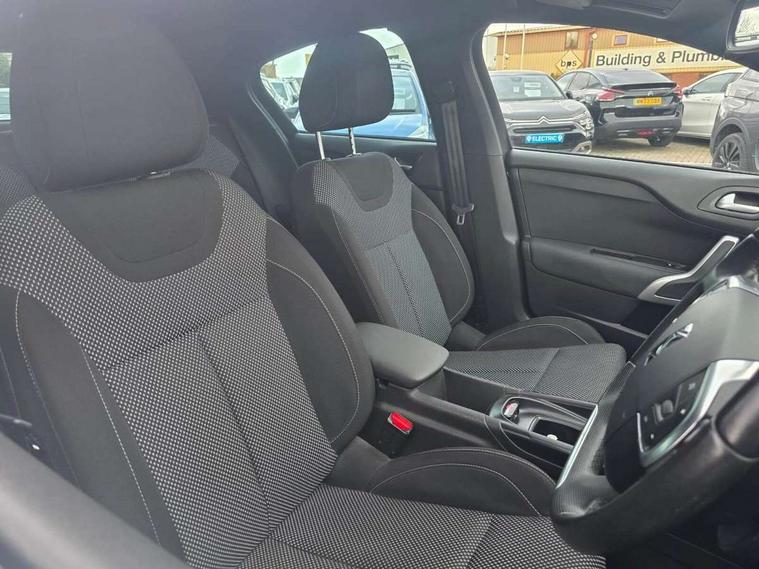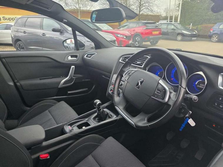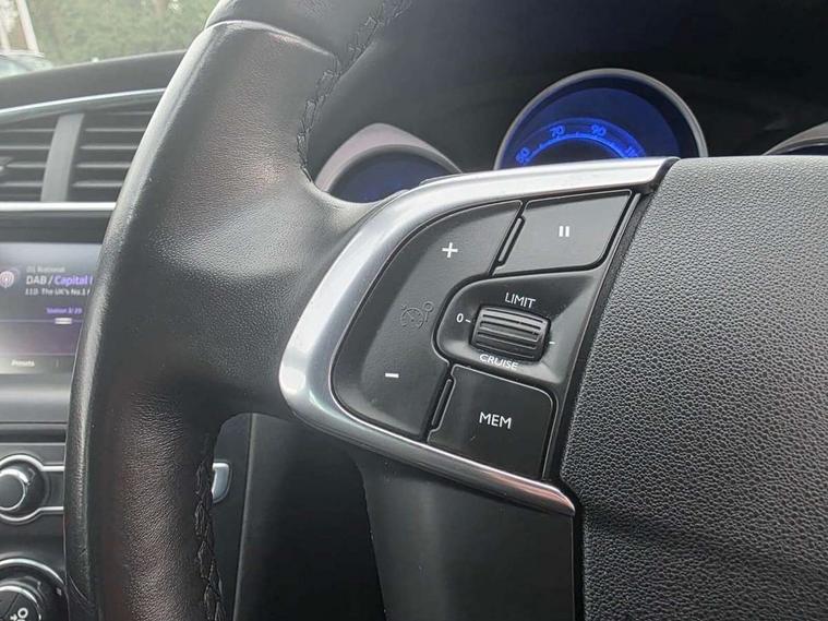 7" touch screen, Cruise control + speed limiter, DS connect box emergency assist system, DS Connect Nav with voice control, mirror link and apple car play, Electric fuel filler flap, MirrorLink, Multi function trip computer, Outside temperature display, Rear parking sensor, Variable PAS, Diesel particulate filter, 6 speakers, Auxiliary input socket, Bluetooth audio streaming, DAB Digital radio, RDS stereo radio/MP3/CD player with steering mounted controls, USB connection, 'Guide me home' headlamps, Automatic headlights, Automatic rain sensing wipers, Body colour door handles, Body colour rear spoiler, Body coloured bumpers, Chrome window surround, Cornering front fog lights, Dark tinted rear windows, Electric adjustable/heated/folding door mirrors, Electric front windows + drivers one touch/anti-trap, Electro-chrome auto-dimming rear view mirror, Front grille with chrome trim surround, Kerbside illumination, LED daytime running lights, Panoramic windscreen, Rear wiper, Twin chrome exhaust tailpipes, 1/3 to 2/3 split folding rear seats, 12V socket, Adjustable front armrest, Cup Holder, Dual zone automatic air conditioning, Footwell lights, Front and rear courtesy reading lights, Front and rear headrests, Front seat and rear pockets, Front seats with adj lumbar support, Front/rear floor mats, Height adjustable front seats, Height/reach adjust steering wheel, Illuminated and ventilated glove box, Isofix system on outer rear seats, Leather gear knob, Leather steering wheel, Passenger underseat drawer, Rechargeable torch, Storage drawer under driver's seat, 3 point inertia reel seatbelts on all 5 seats, ABS + EBD + EBA, Child lock indicator, Driver/Front Passenger airbags, Electronic parking brake, ESP, Front and rear curtain airbags, Front lateral airbags, Front seatbelt pretensioners with force limiters, Hill start assist, Intelligent Traction Control system, Seatbelt warning, Tyre pressure sensor, Automatic boot locking, Automatic door locking, Deadlocks, Immobiliser, Locking wheel nuts, Perimetric and volumetric anti theft alarm, Remote control central locking,
