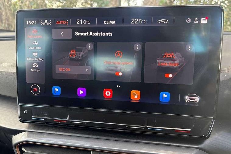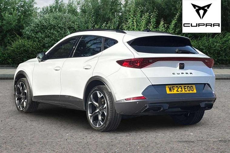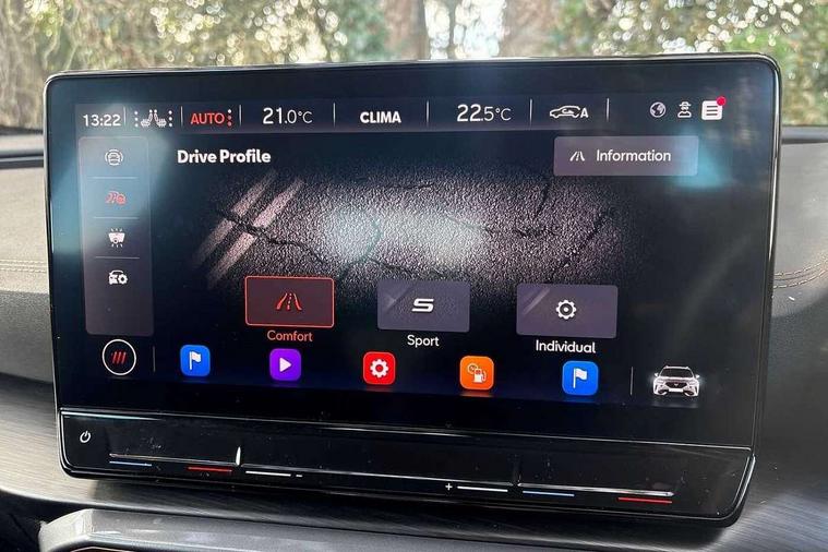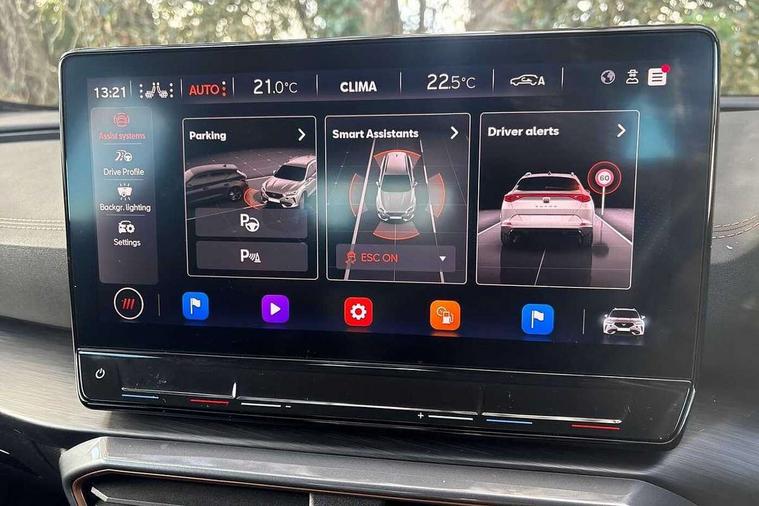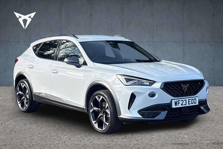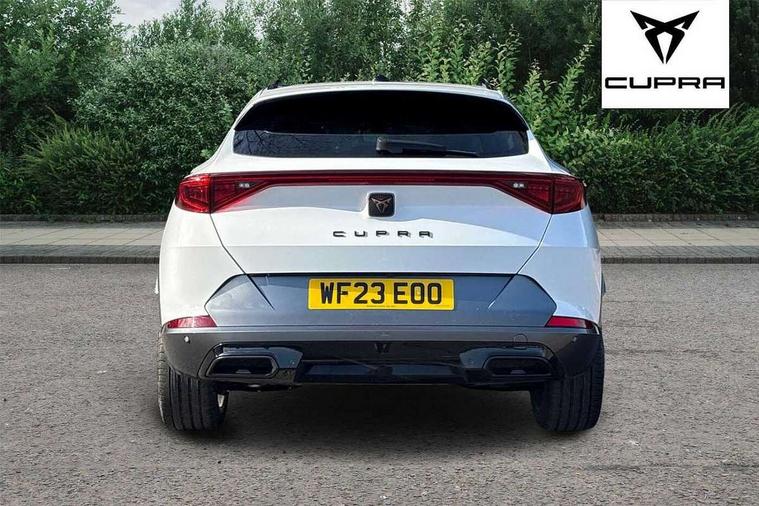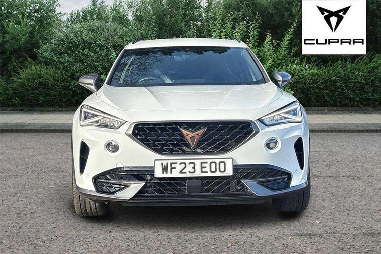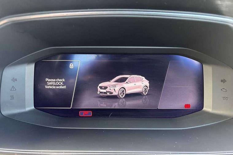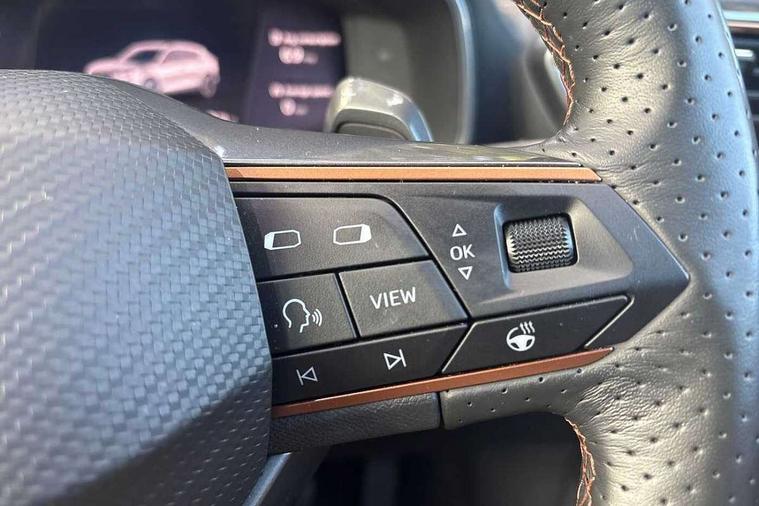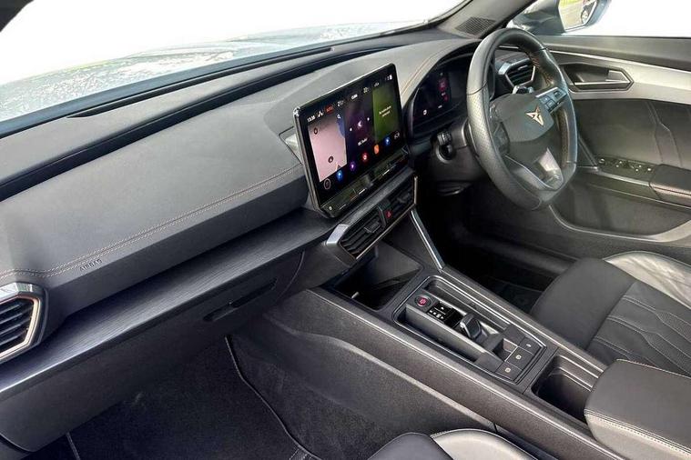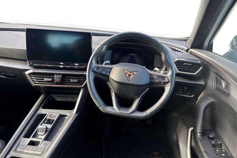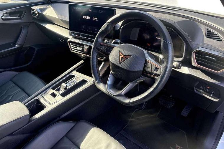 Digital cockpit and configurable dashboard, Driver alert system, Driving profile selection, Forward collision warning with automatic braking, Lane assist, Navigation system with 12'' Touchscreen Display, Park assist (inc front/rear parking sensors), PAS, Predictive adaptive cruise control with speed limiter, Rear view camera, RPM, trip computer, outside temp gauge, instrument light brightness, low fuel warning light, lights on reminder, gearshift indicator, Service interval indicator, Start/stop system with regenerative braking, Voice control system, Wireless apple carplay, Wireless phone charger, Electronic locking differential and dynamic traction support, Standard suspension, 2 front and 2 rear USB type C sockets, Auxiliary input socket, DAB radio, Auto dimming rear view mirror, Body colour door handles, Body coloured bumpers, Dark grey wing mirror, Daytime running light with automatic headlight control and coming home feature, Dynamic headlight range control, Electric front/rear windows, Electrically adjustable heated and folding door mirrors with memory function, Front fog lamps with cornering function, Gloss black roof rails and window surrounds, LED Headlights, LED Taillights with dynamic indicator, Rain sensing wipers, Rear diffuser with black simulated exhaust pipes, Rear side wing doors, Rear wash/wipe, Third brake light, Tinted rear windows, Welcome lights, 12v power supply in centre console, 12V socket, 12v socket in loadspace, 2 front and 2 rear reading lights, 230V socket, 3 seat bench in 2nd row, 60/40 split rear bench seat with armrest and mechanical seat release, Black headlining, Dust/pollen filter, Front and rear head restraints, Front centre armrest, Height/reach adjust steering wheel, Illuminated interior front door sills, Illuminated sunvisor with mirror, Isofix, Leather multi function heated steering wheel with gear shift paddles, Luggage tie-down hooks, Single front passenger seat, Three zone climate control with control panel in rear, Variable luggage/load compartment floor, Wraparound lighting, Genuine Nappa leather Pack - Cupra, 3 point seatbelts on all rear seats, ABS, Brake control system - ESC and brake booster, Child proof door locks, Driver and front passenger airbags with front passenger airbag de-activation, Electronic parking brake, Front and rear disc brakes, Front side curtain airbags, Hill hold control, Public e-call, Seat belt reminder for front and rear seats, Tyre pressure monitoring system, Anti theft alarm system, Keyless entry and start system (KESSY), Locking wheel bolts, Copper and aluminium interior detailing, 19" 'Exclusive' machined sport matte black and silver alloy wheels,