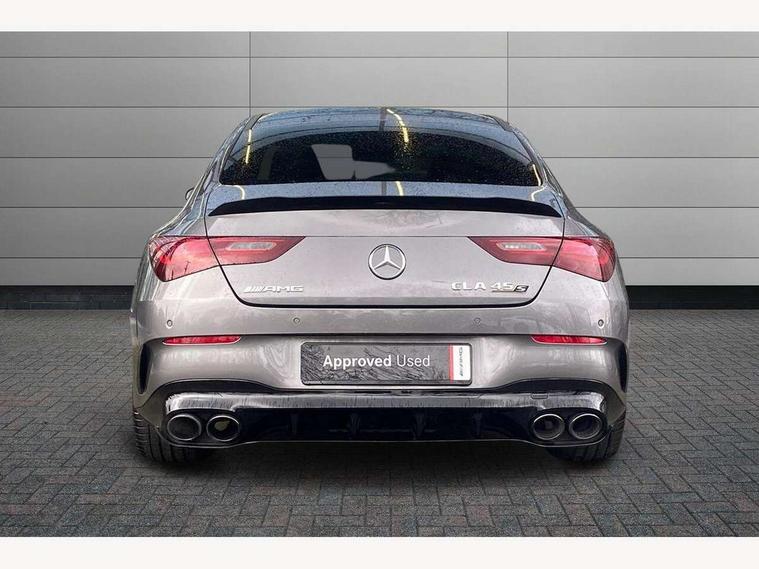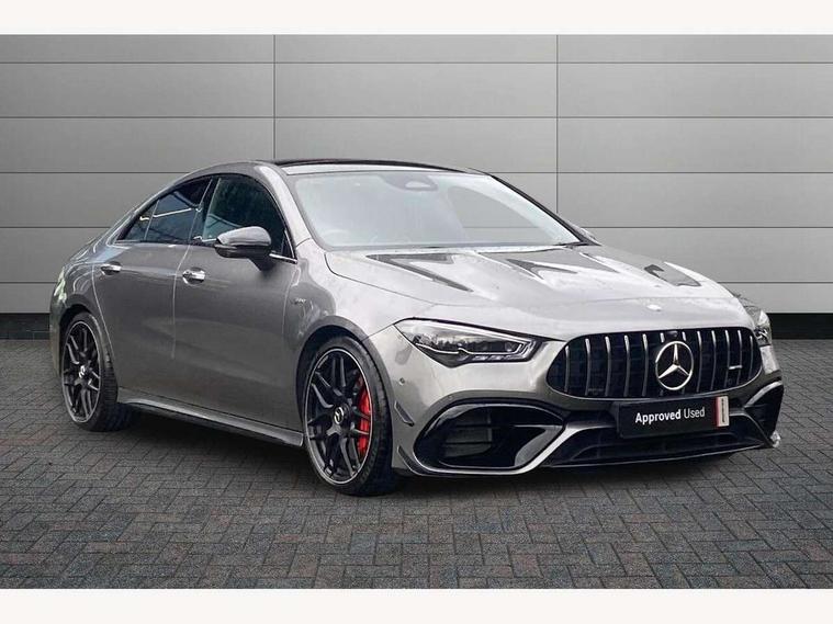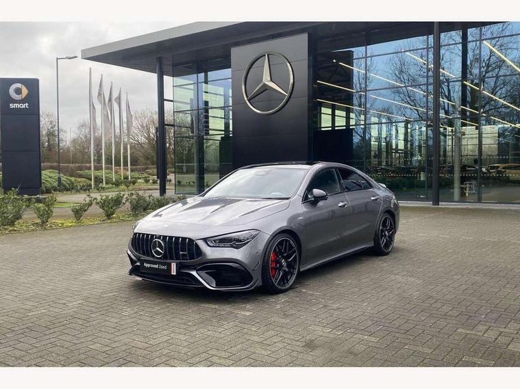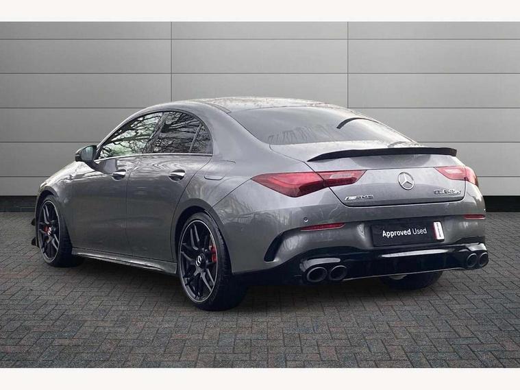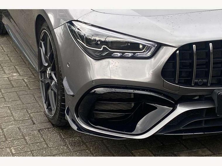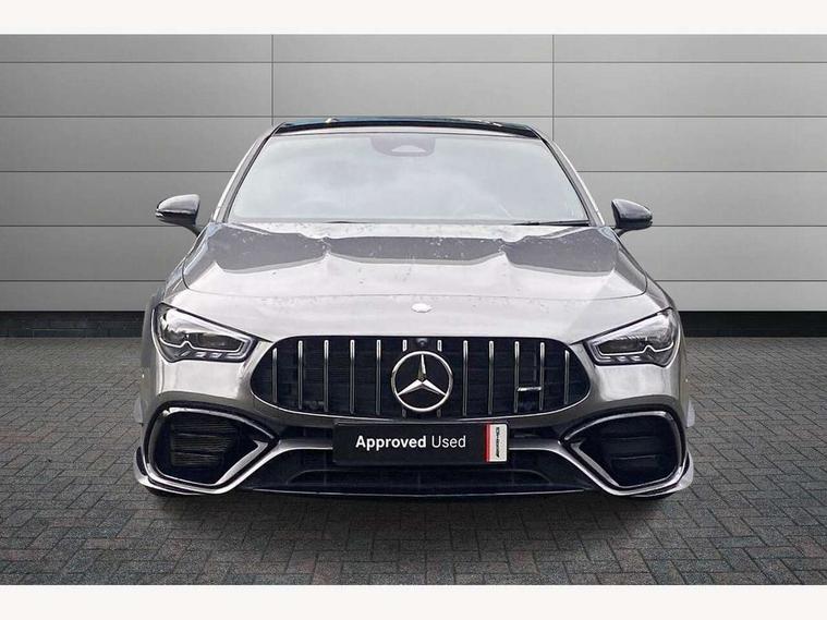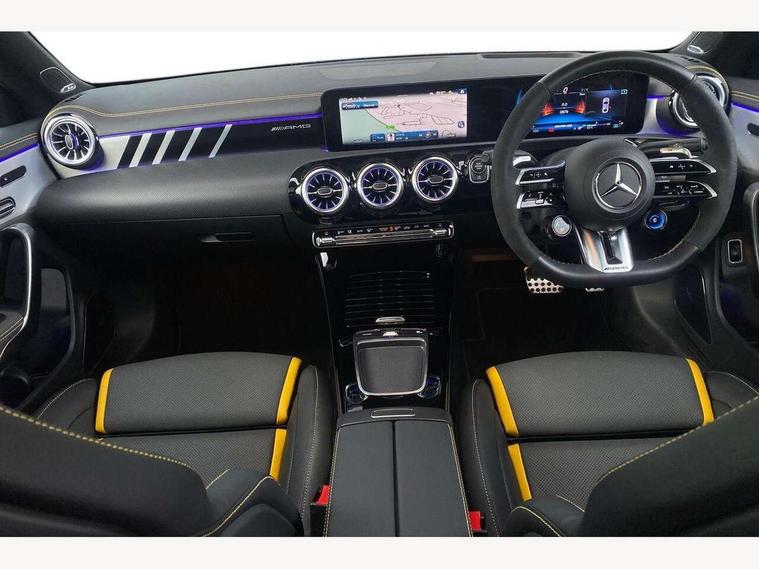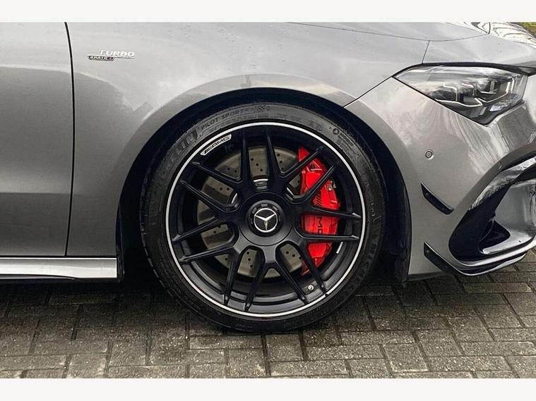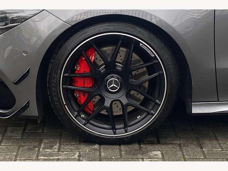 10.25 inch Instrument display with digital cockpit, 10.25 inch touchscreen central media display with AMG specific, AMG start up logo, visualisation of the AMG drive programs, vehicle and engine data, 360 degree parking camera, Active lane keeping assist, AMG DYNAMIC SELECT with drive modes(Slippery, Comfort, Sport, Sport+, Individual and Race) incl drift mode via steering wheel shift paddles+Race Start, AMG menu with sporty additional information - Gear indicator with yellow M symbol manual mode, Warm Up menu and Set Up menu, AMG speed sensitive power steering with two sets of steering characteristics, AMG track pace, Attention assist - Monitors steering behaviour and long journey fatigue, Bluetooth connection, Car wash mode, Cruise control with limiter, Direct steer system, ECO start/stop function, Fluid level warning indicator for fuel, oil, coolant and washer fluid, Hard-disk navigation, Head up Display, Hey Mercedes Voice activation, Lamp failure indicator, MBUX augmented reality for navigation, MBUX Interior assistant, Mercedes me connect including emergency call system, accident recovery, breakdown and maintenance management, Mercedes me remote services, Outside temperature gauge, Owners manual in English, Pre-installation of private car share, Radio aerial integrated into front and rear windshields, Service indicator (ASSYST), Smartphone integration with Apple CarPlay and Android auto, Traffic sign assist, Trip computer in multifunction display with current consumption indicator, Wireless charging in the front centre console, 4MATIC permanent four wheel drive, AMG performance 4MATIC+ with torque control distribution, AMG Ride Control suspension, Rear axle multi-link, Burmester lettering on the speakers, Burmester surround sound system (710W) with dolby atmos, speakers - 1 central, 1 woofer, 1 tweeter, 1 subwoofer with 60W, 2 in C pillar, DAB digital radio tuner, MBUX multimedia system, Pre installation for Mercedes Benz Link, USB (type C) ports (2) in stowage compartment and 1 in front of centre console, Adaptive brake lights, AMG body styling specific front apron, AMG side sill panels, AMG rear apron, AMG roof spoiler lip, Specific S labelling boot lid + front apron CLA 45, AMG emblem on the front instead of the "Mercedes-Benz" laurel wreath badge, AMG Front apron with flics as air deflector elements on the outer air intakes, AMG fuel filler cap in silver chrome with AMG lettering, AMG illuminated door sills with AMG lettering and with exchangeable cover, AMG specific radiator grille with vertical struts in high gloss chrome and AMG logo, AMG Sports exhaust system with two round tailpipes measuring 90 mm in diameter attached in rear apron, AMG lettering plus ribbing on the inside of the, Body colour bumpers, Body colour door handles, Electric panoramic sunroof with automatic tilt and convenience closing fuinctions, rain sensor auto closing and electronic roller sunblind, Electric windows, Electrically adjustable and heated door mirrors with integrated LED indicators, Exhaust system with AMG Real Performance Sound (Balanced or Powerful settings), Front splitter and trim elements on the louvres in the outer air inlets in silver chrome, Front wings with TURBO 4MATIC lettering, Hand free access, Headlamp assist automatic headlamp activation, Heated glass rear windscreen + timer control, High gloss beltline strips, High level LED third brake light, Integrated LED daytime running lights, Interior mirror with black reading lamps and frameless, LED tail lamp, Multibeam LED headlamps with adaptive highbeam assist plus, Privacy glass with dark tinting on rear side windows and rear window, Rain sensing windscreen wipers with two sensitivity settings, Rear boot, Rear fog lamp, Rear side wing doors, Surround lighting with projection of brand logo, Two round twin tailpipe trim elements each measuring 90 mm in diameter and AMG lettering plus ribbing on the inside of the pipe, Valve control dependent on drive program, Variable front intermittent wipers, 3 seat bench in 2nd row, 40:20:40 split folding rear seat backrests, Air conditioning - Two zone thermotronic luxury automatic climate control with display, Air vents with surround in silver chrome, AMG brushed stainless steel sports pedals with rubber studs, AMG centre console finished with trim in silver chrome, AMG Performance sportily shaped seats with power adjustable front seats, special seat cushions + AMG badge backrests, AMG Performance steering wheel in nappa leather/microcut microfibre, AMG steering wheel buttons, Automatic child seat recognition sensor, Black roof lining, Floor mats with stitched AMG lettering, Fluorescent jacket, Front centre armrest with stowage, Front head restraints, Heated front seats, Interior lighting - 64 colour Ambient lighting, Manually height and reach adjustable steering column, Rear armrest with two integral cup holders for drinks, Rear head restraints, Silver coloured aluminium gear shift paddles on steering wheel, Single front passenger seat, Stowage compartment in centre console with retractable cover, Sunvisors with illuminated vanity mirrors, Twin front cupholders, Two outer rear seat isofix and top tether child seat fixing points, Aerodynamics pack - CLA, AMG driver's package - CLA, AMG Multi contour seat pack - CLA, AMG Night package - CLA 35/45, AMG performance seat pack (High End) - CLA 45 S 4Matic+ Plus, Keyless go comfort pack - CLA, Light and sight pack - CLA, Mirror pack with Self dimming rear view mirror - CLA, Seat comfort pack - CLA, Active bonnet pedestrain safety measure which detects an impact and raises bonnet by 65mm, Adaptive brake assist with hold function and hill start assist, AMG high performance brake system with red painted brake callipers and black AMG lettering at the front, ventilated and perforated brake discs, Anti lock braking system (ABS) with brake assist, Black seat belts, Brake pad wear warning indicator, Childproof locks manually operated for rear doors and electric