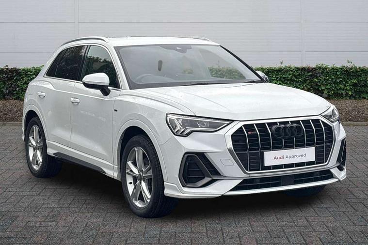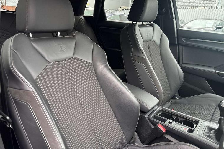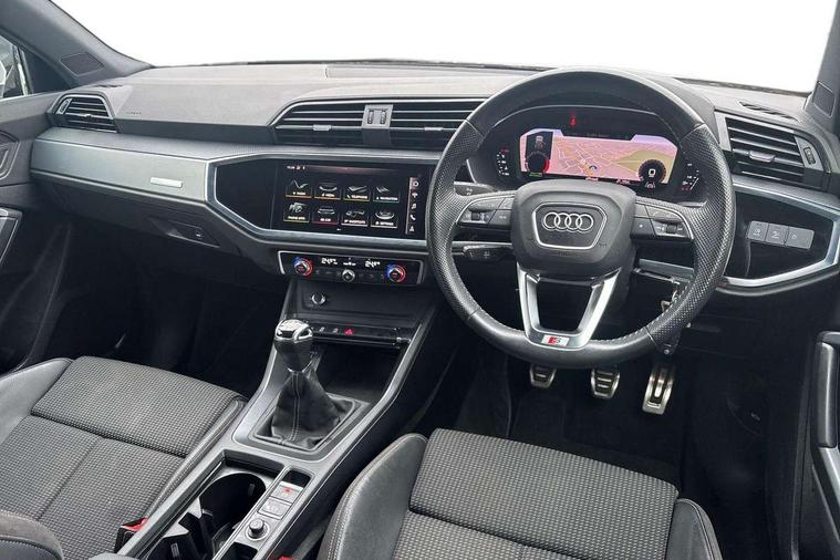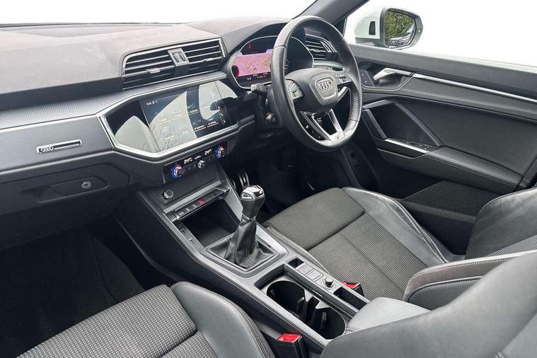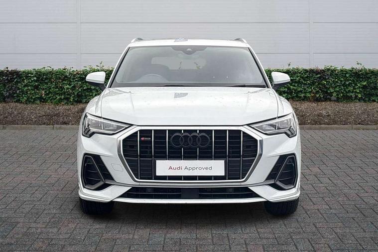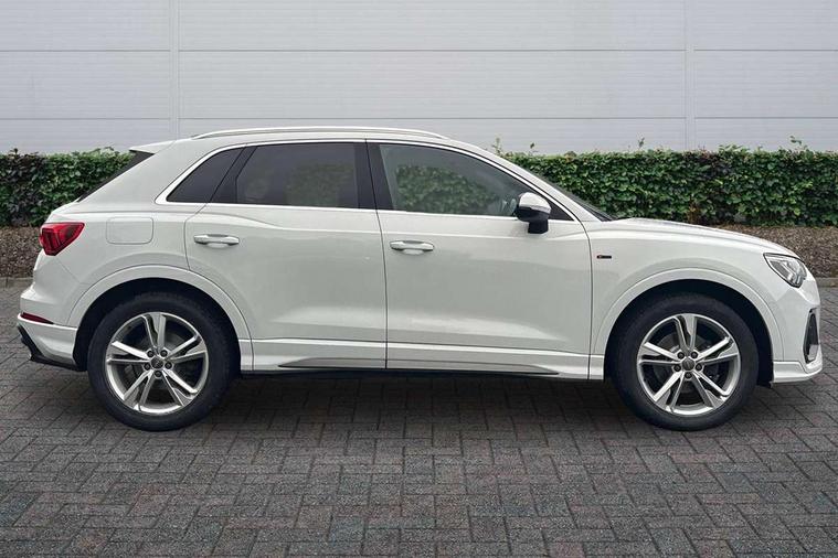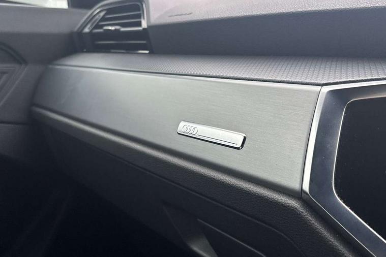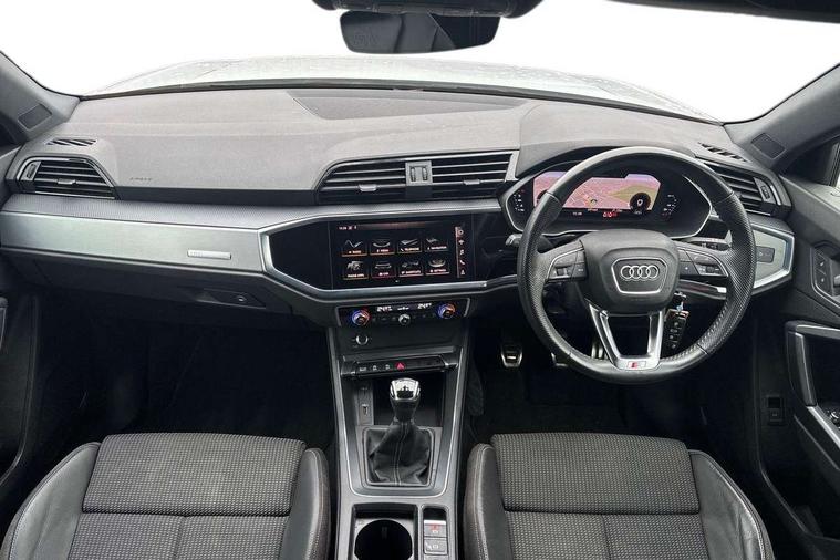 Audi connect safety and service (e-call), Audi drive select, Audi lane departure warning, Audi side assist, Audi smartphone interface, Audi Virtual Cockpit - 10.25" display, Bluetooth interface, Camera based traffic sign recognition, Cruise control + speed limiter, MMI navigation plus with MMI touch, Power opening/closing tailgate, Progressive steering, Rear parking sensors, Service interval indicator, Stop/start system, Voice control system, Sports suspension, 1 x USB type C and 1 USB type A charging points, 6 speakers, DAB digital radio module, Acoustic windscreen, Aluminium roof rails, Aluminium window trim, Auto dimming rear view mirror, Body coloured bumpers, Diffuser in matt Platinum grey, Electrically adjustable and heated door mirrors with integrated LED side indicators, Front and rear electric windows, Front fog lights, Front side air inlets in matt platinum grey, Front spoiler blade in matt platinum grey, Grille vertical bars in aluminium silver/Matt, High gloss black finish B and C pillars, LED headlights with LED daytime running lights and dynamic rear indicator, LED rear lights, Privacy glass, Rain and light sensors, Rear diffuser strip in matt titanium black, S Line badge on wings, S Line front and rear bumpers, Side skirt insert in matt Platinium grey, Titanium black radiator grille, 12V socket in rear centre console, 40:20:40 split folding rear bench seat, Adjustable rear seat bench/backrest with centre armrest and cupholder, Aluminium door sill trims, Black cloth headlining, Dual zone climate control, Front and rear black floor mats with contrast stitching in rock grey, Front and rear headrests, Front and rear roof module including reading lights, Front centre armrest with storage compartment and angle adjustment, Glove compartment lighting, Height and reach adjustable steering wheel, Illuminated door sill trims with S logo, ISOFIX child seat mounting and Top Tether with front passenger airbag deactivation, Luggage compartment light, Manual front seats with height adjustment, Perforated leather gearknob, Stainless steel luggage compartment sill finisher, Stainless steel pedals, Non smoking pack - Q3, 3x3 point rear seatbelts, 6 airbags - Driver, front passenger, curtain and side windows, Audi pre-sense front with pedestrain and cyclist recognition, Electrically operated child locks on rear doors, Electromechanical parking brake, Electronic stabilisation control including ABS, ASR and EDL, Hill descent control, Hill hold assist, Pre sense basic, Seatbelt monitoring, Tyre pressure warning, Warning triangle and first aid kit, Anti theft alarm, Anti theft wheel bolts, Remote central locking, Dark matt brushed aluminium inlay, MMI touch colour display in gloss black with aluminium surround,