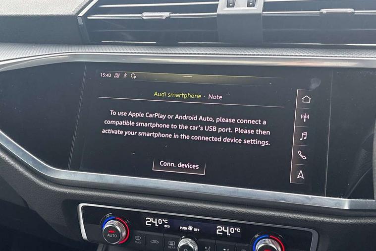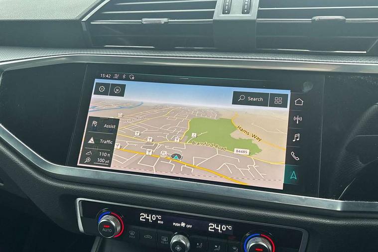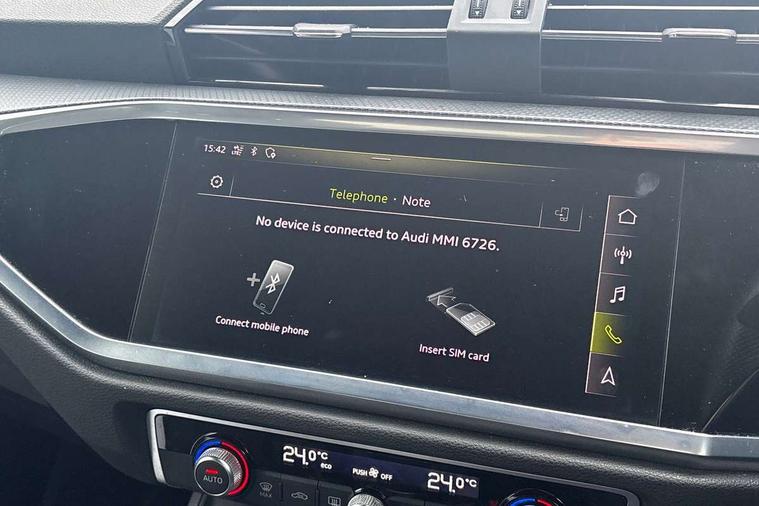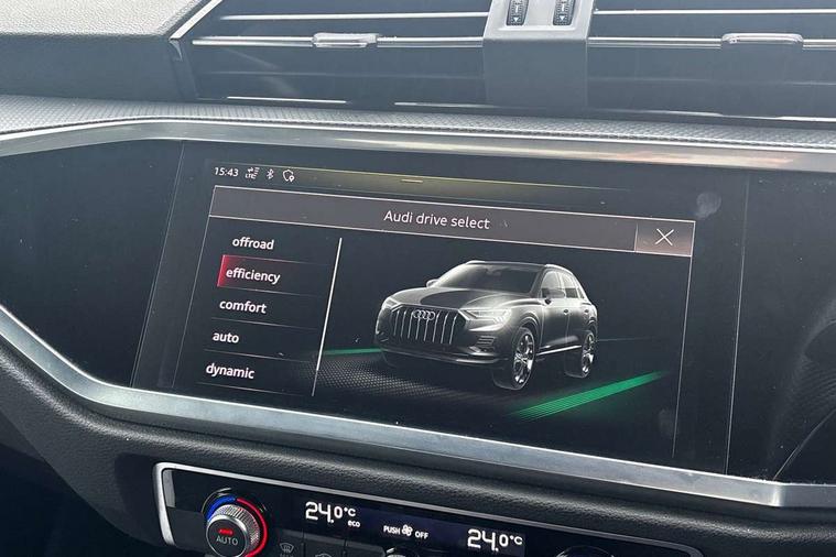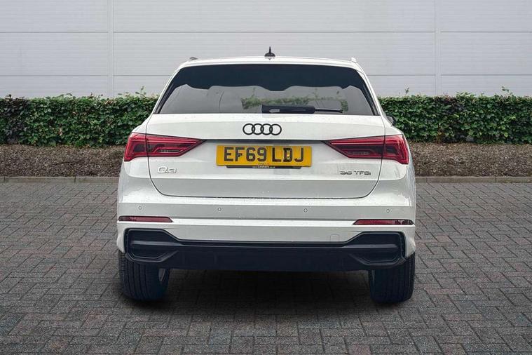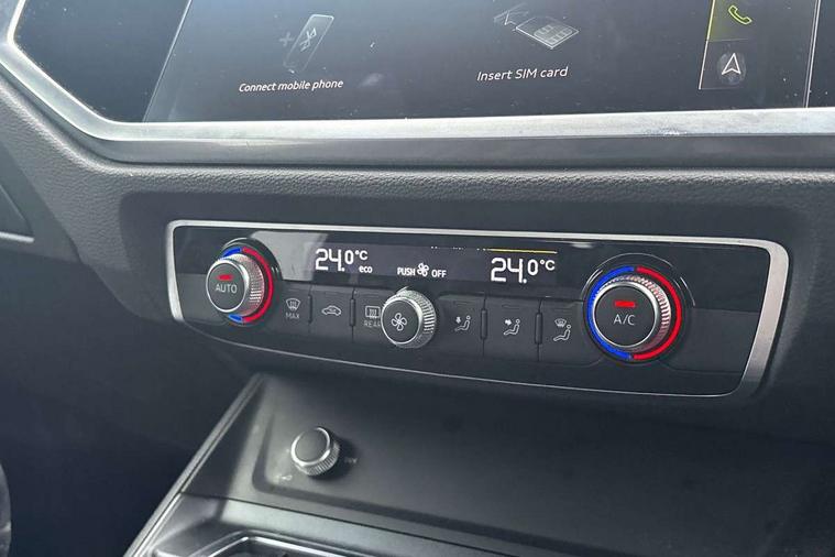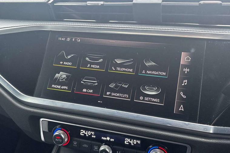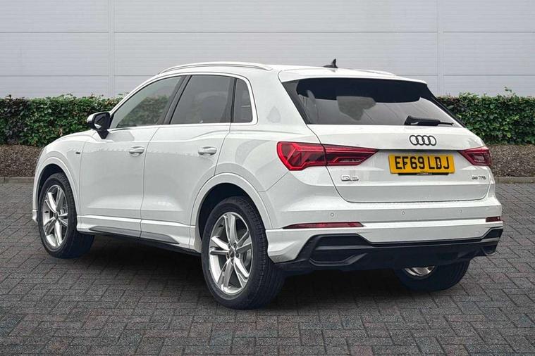 Audi connect safety and service (e-call), Audi drive select, Audi lane departure warning, Audi side assist, Audi smartphone interface, Audi Virtual Cockpit - 10.25" display, Bluetooth interface, Camera based traffic sign recognition, Cruise control + speed limiter, MMI navigation plus with MMI touch, Power opening/closing tailgate, Progressive steering, Rear parking sensors, Service interval indicator, Stop/start system, Voice control system, Sports suspension, 1 x USB type C and 1 USB type A charging points, 6 speakers, DAB digital radio module, Acoustic windscreen, Aluminium roof rails, Aluminium window trim, Auto dimming rear view mirror, Body coloured bumpers, Diffuser in matt Platinum grey, Electrically adjustable and heated door mirrors with integrated LED side indicators, Front and rear electric windows, Front fog lights, Front side air inlets in matt platinum grey, Front spoiler blade in matt platinum grey, Grille vertical bars in aluminium silver/Matt, High gloss black finish B and C pillars, LED headlights with LED daytime running lights and dynamic rear indicator, LED rear lights, Privacy glass, Rain and light sensors, Rear diffuser strip in matt titanium black, S Line badge on wings, S Line front and rear bumpers, Side skirt insert in matt Platinium grey, Titanium black radiator grille, 12V socket in rear centre console, 40:20:40 split folding rear bench seat, Adjustable rear seat bench/backrest with centre armrest and cupholder, Aluminium door sill trims, Black cloth headlining, Dual zone climate control, Front and rear black floor mats with contrast stitching in rock grey, Front and rear headrests, Front and rear roof module including reading lights, Front centre armrest with storage compartment and angle adjustment, Glove compartment lighting, Height and reach adjustable steering wheel, Illuminated door sill trims with S logo, ISOFIX child seat mounting and Top Tether with front passenger airbag deactivation, Luggage compartment light, Manual front seats with height adjustment, Perforated leather gearknob, Stainless steel luggage compartment sill finisher, Stainless steel pedals, Non smoking pack - Q3, 3x3 point rear seatbelts, 6 airbags - Driver, front passenger, curtain and side windows, Audi pre-sense front with pedestrain and cyclist recognition, Electrically operated child locks on rear doors, Electromechanical parking brake, Electronic stabilisation control including ABS, ASR and EDL, Hill descent control, Hill hold assist, Pre sense basic, Seatbelt monitoring, Tyre pressure warning, Warning triangle and first aid kit, Anti theft alarm, Anti theft wheel bolts, Remote central locking, Dark matt brushed aluminium inlay, MMI touch colour display in gloss black with aluminium surround,
