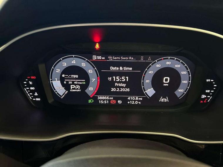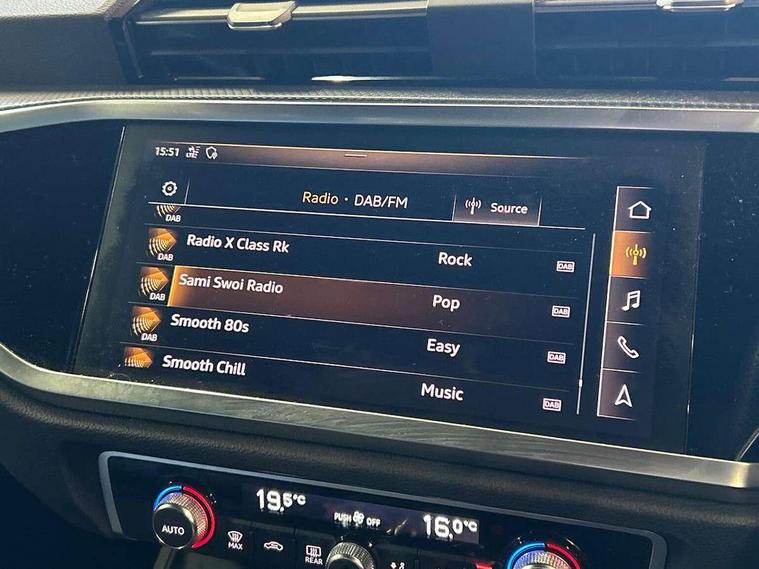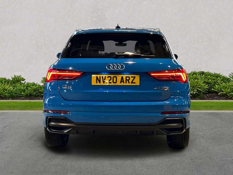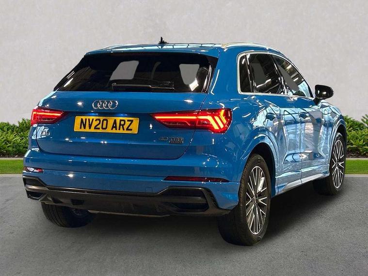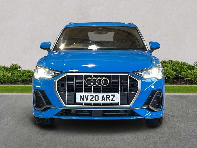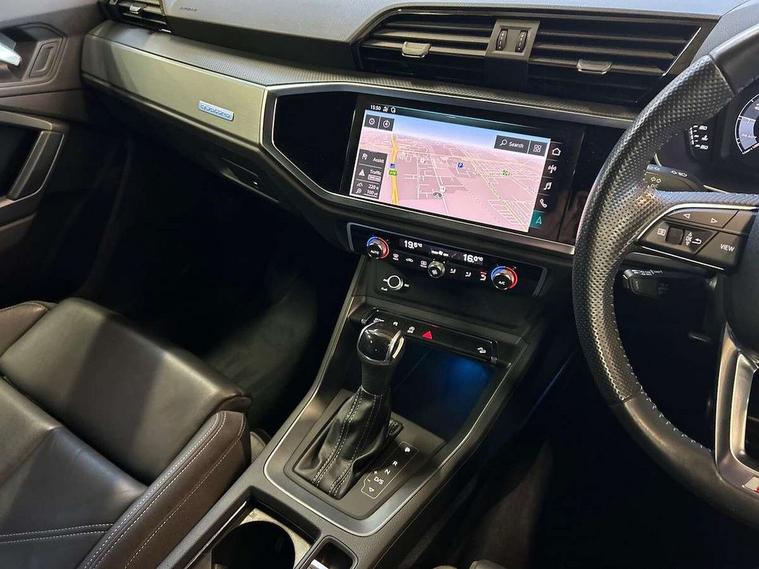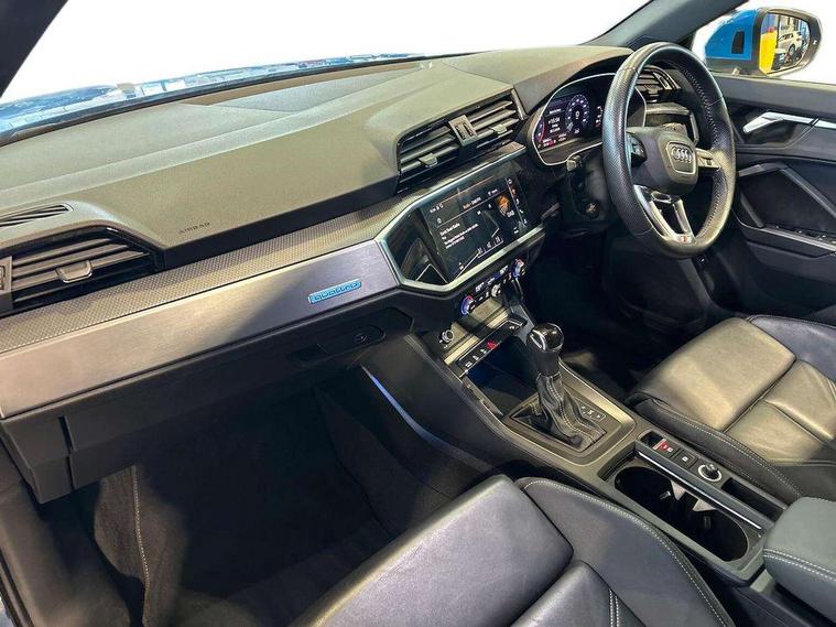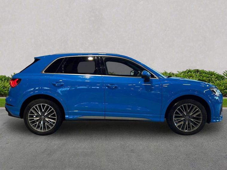 Dark matt brushed aluminium inlay, Leatherette door armrest, MMI touch colour display in gloss black with aluminium surround, Non smoking pack - Q3, Anti theft alarm, Anti theft wheel bolts, Audi pre-sense front with pedestrain and cyclist recognition, Remote central locking, 1 x USB type C and 1 USB type A charging points, 6 speakers, DAB digital radio module, 3x3 point rear seatbelts, 6 airbags - Driver, front passenger, curtain and side windows, Electrically operated child locks on rear doors, Electromechanical parking brake, Electronic stabilisation control including ABS, ASR and EDL, Hill descent control, Hill hold assist, Pre sense basic, Seatbelt monitoring, Tyre pressure warning, Warning triangle and first aid kit, Acoustic windscreen, Aluminium roof rails, Aluminium window trim, Auto dimming frameless rear view mirror, Body coloured bumpers, Electrically folding, adjustable and heated door mirrors with integrated LED side indicators and kerb view function for passenger side, Front and rear electric windows, Front fog lights, Front side air inlets in matt platinum grey, Front spoiler blade in matt platinum grey, Grille vertical bars in aluminium silver/Matt, High gloss black finish B and C pillars, LED headlights with LED daytime running lights and dynamic rear indicator, LED rear lights, Privacy glass, Rain and light sensors, Rear diffuser strip in matt titanium black, S Line badge on wings, S Line front and rear bumpers, Side skirt insert in matt Platinium grey, Silver chrome grille surround, Titanium black radiator grille, 12V socket in rear centre console, 40:20:40 split folding rear bench seat, 60:40 forwards/backwards position and backrest angle, Adjustable rear seat bench/backrest with centre armrest and cupholder, Aluminium door sill trims, Black cloth headlining, Dual zone electronic climate control, Front and rear black floor mats with contrast stitching in rock grey, Front and rear headrests, Front and rear roof module including reading lights, Front centre armrest with storage compartment and angle adjustment, Glove compartment lighting, Height and reach adjustable steering wheel, Illuminated door sill trims with S logo, ISOFIX child seat mounting and Top Tether with front passenger airbag deactivation, Luggage compartment light, Manual front seats with height adjustment, Perforated leather gearknob, Stainless steel luggage compartment sill finisher, Stainless steel pedals, Apple CarPlay, Audi connect safety and service (e-call), Audi drive select, Audi lane departure warning, Audi side assist, Audi smartphone interface, Audi Virtual Cockpit - 10.25" display, Bluetooth interface, Camera based traffic sign recognition, MMI Navigation Plus with high resolution 10.1 inch touchscreen colour display, Power opening/closing tailgate, Progressive steering, Service interval indicator, Start stop system with recuperation, Voice control system with natural language interaction, Sports suspension,