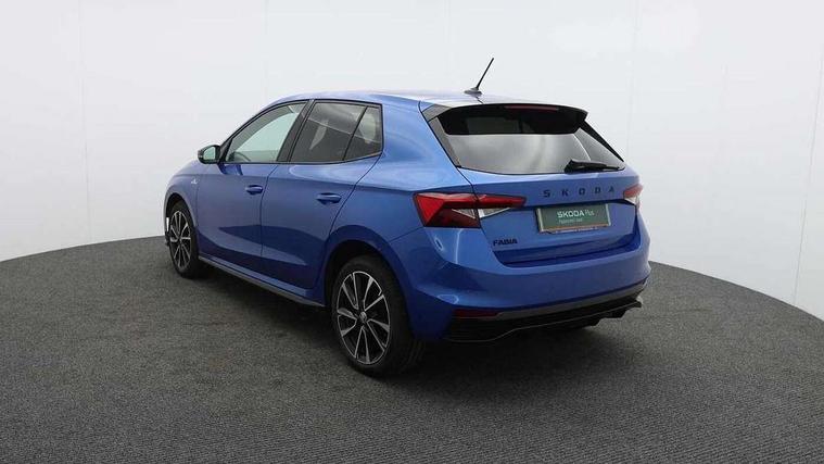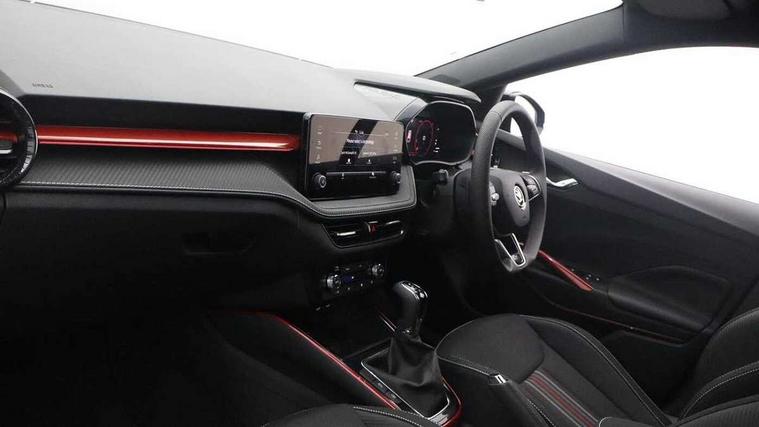Advanced driver attention and drowsiness monitor, Bluetooth connection, Electromechanical power steering, Exterior temperature gauge, Service interval indicator, Traffic sign recognition, Virtual cockpit with 10.25" colour display, Wireless SmartLink for Apple CarPlay and Android Auto, 6 Speakers (4 in front and 2 in rear), Auxiliary socket for external MP3 player, DAB digital radio reception, Auto dimming rear view mirror, Black radiator grille, Body coloured bumpers, Door mirror integrated indicators, Front and rear electric windows, Front window wiper intermittent control, Headlight range control - Automatic, Ice scraper in fuel cap, LED daytime running lights with coming and leaving home feature, LED rear lights, Monte Carlo badging, Privacy glass, Rear LED fog light, Rear side wing doors, Rear window wiper with washing nozzles, Roof mounted spoiler, SKODA tailgate lettering in black, Sports bumpers, Third brake light, 2 reading lights in front and 2 reading lights in rear, 3 rear headrests, Aluminium pedals, Backrest split and folding, Black headlining, Central console with removable cup holder and storage box, Chrome handbrake release button, Door sills with fabia badging, Dual zone air conditioning with climatronic electronic control, Fabric/artificial leather upholstery, Front centre armrest, Front sports seats, Gearshift knob/handle in leather, Hand brake lever handle in leather, Height adjustable front headrests, Height adjustable front seats, Height adjustable steering wheel, ISOFIX and TopTether anchorage points to the outer rear seats, ISOFIX and TopTether on the front passenger seat, Luggage compartment lighting, Manually adjustable lumbar support in front seats, Metallic painted red central console cover, Metallic red interior door handles, Pollen filter, Rear seat bench unsplit, Single front passenger seat, Sun visors with mirror and airbag label on passenger side, Textile floor mats, Ticket holder, Umbrella in drivers door, 3-point height adjustable front seats belts with pretensioner and force limiter, Automatic warning lights in case of crash, Driver and passengers airbag with switch off function, e-Call+, ESC including ABS, MSR, ASR, EDS, HBA and XDS, Front and rear seat belt warning, FRONT ASSIST (AEB City and AEB Inter Urban), Front side airbags, Head airbags, Hill hold control, One tone horn, Pedestrian protection, Three rear 3-points safety seat belts with pretensioner and force limiter including stop function for outer rear seat belts, Tyre pressure monitoring system, Anti-theft alarm system including immobiliser, interior monitoring, backup horn, and towing protection, Central locking with radio remote control, interior controls, SAFE function and 2 foldable keys, Carbon effect door and side trim panels, Carbon effect lower decorative trim with white stitching, Monte carlo air vents, Red metallic upper decorative trim, Anti-theft wheel bolts protection, Super-low rolling resistance tyres,