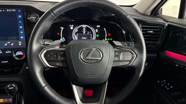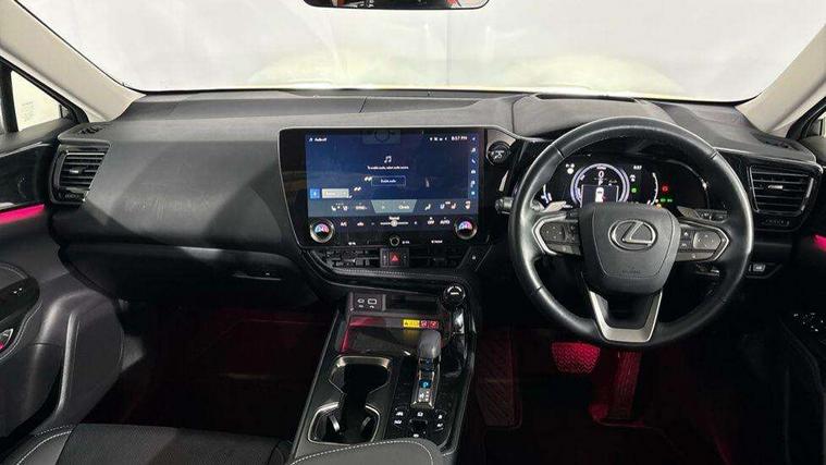 4 driving modes EV/Eco/Normal/Sport, 7" display in instrument binnacle, Blind spot monitoring with rear cross traffic alert, Bluetooth telephone connectivity, eCall emergency system, Electric speed sensitive power steering, Intelligent parking sensors - 4 front and 4 rear, Lane change flasher function, Lexus link connect - Cloud based navigation, cloud based voice assistant, always online and 9.8" VGA touchscreen, Push button starter, Reversing camera with back guidelines, Service interval indicator, Tailgate, Wireless Apple CarPlay/Android Auto, Wireless Smartphone charger, 6.6 kW onboard charger, All Wheel Drive (AWD), Hybrid automatic transmission, Vehicle Dynamics Integrated Management (VDIM), Vehicle Stability Control (VSC), 10 speakers, 4 USB ports - 2 front, one USB C, 2 rear USB C, DAB Digital radio, Auto dimming interior rear view mirror, Automatic headlights, Bi LED headlights, Double hidden exhaust pipes, Front and rear one touch power windows, with anti-jam protection, Heated, auto-folding, auto-dimming outside mirrors with reverse tilt function and turn indicators, Illuminated door handles with puddle light, LED brake lights and rear lights with emergency brake signal, LED cornering lights, LED daytime running lights, LED front fog lights, LED Indicators, Power back door with kick sensor, Privacy glass, rear doors and tailgate, Rain sensor windscreen wipers, Rear side wing doors, Rear wiper, Roof rails, 12V accessory port centre console and luggage compartment, 2 cupholders in front centre console, 2 way electrical lumbar adjustment for driver, 2 x fixed shopping bag hooks in boot, 2 x sun visors with vanity mirror and lamp, 3 seat bench in 2nd row, 4 x tie down hooks in the boot, 60/40 split folding rear seat, 8 way driver/passenger electrically adjustable front seats, Adjustable rear seat backrest, Card holder installed in driver and passengers sun visors, Centre armrest with storage box, Dual climate control air conditioning system, Front and rear head restraints, Front and rear textile carpet mats, Front passenger seat, Heated front seats, Heated steering wheel, Leather gear lever, LED interior illumination, Power adjustable leather steering wheel with paddle shifts, Premium Tahara leather upholstery, Rear centre armrest with 2 cupholders, Whiplash Injury Lessening (WIL) feature (active headrest) for seats, 2 x Isofix child rear seat restraints, 3 point ELR front seatbelts with pretensioners, 3x3 point rear seat belts, ABS, Adjustable seat belt anchor points, Driver and front passenger 2 stage airbag, Driver/front passenger side airbags, Drivers knee airbag, E-Latch with safe exit assist, EBD + Brake Assist, ECB (Electronically Controlled Brake System), Electronic parking brake, Front and rear curtain shield airbags, Front center airbag, Front passenger seat cushion airbag, Hill assist control, Lexus safety system - dynamic radar cruise control, pre collision system day and night, lane tracing assist, road sign, automatic high beam, OTA, Manual rear child locks, Passenger airbag cut-off device, Traction control, Tyre pressure warning, Anti-theft system with alarm, intrusion sensor, glass breakage sensor, tilt sensor and engine immobiliser, Locking wheel nuts, Smart keyless entry, Speed sensitive auto door locking, Two motion door lock with double lock, Ultra Wide Band (UWB) Anti-theft system, VIN Window etching, 3D prism black Inlay, Organic inlay, Tyre repair kit,