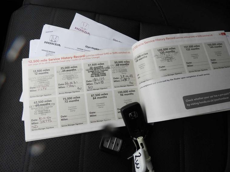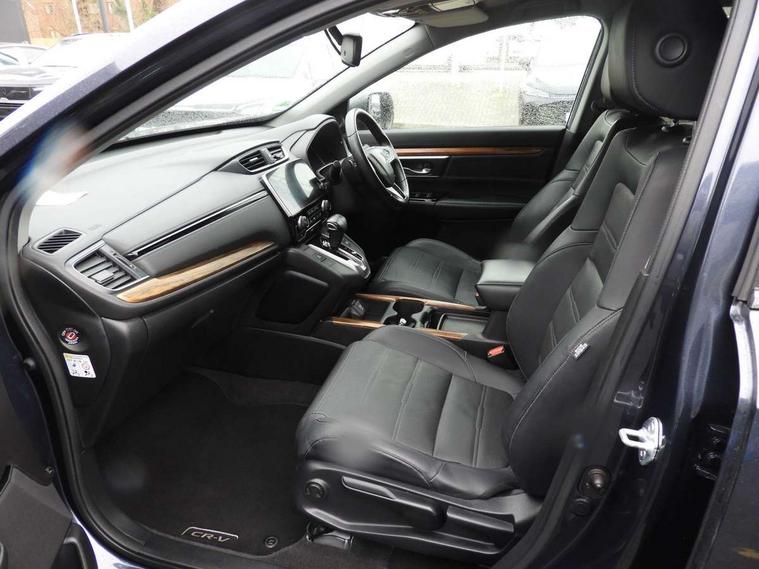 Adaptive cruise control, Agile handling assist, BLIS (Blind Spot Information System) with dual power heated blind spot mirrors, Bluetooth hands free telephone connection, Economy mode, Electric power steering, Emergency stop signalling system, Forward collision warning, Front and rear parking sensors, Honda CONNECT with GARMIN Navigation + 7" touchscreen, DAB radio, Apple CarPlay, Android Auto, Aha app integration and internet browsing, Intelligent multi info display, Lane departure warning system, Lane keep assist system, Low speed following, Rear view camera, Road departure mitigation, Speed limiter, Traffic sign recognition, Vehicle stability assist, 2 USB sockets in rear, 2x USB sockets in front, 8 speakers, DAB Digital radio, Steering wheel mounted controls, Subwoofer, Aspheric door mirrors, Auto dimming rear view mirror, Automatic headlights with dusk sensor, Body colour bumpers, Body colour door handles, Cornering light, Door mirrors tilt when reversing, Electric front windows/one touch facility, Electric rear windows + one touch facility, Electrically adjustable and heated door mirrors, Electrically retractable door mirrors, Front windscreen de-icer, High beam assist, LED daytime running lights, LED front fog lights, LED Headlights, LED rear lights, Rain sensor, Rear privacy glass, Rear wiper, Roof rails, Shark fin roof aerial, Trailer stability assist, Welcome home function, 60/40 split folding rear seat, Accessory sockets, Ambient interior lighting, AWD emblem rear, Cargo hooks, Courtesy lights, Driver's electric adjustable lumbar support, Driver/passenger front seatback pockets, Driver/passenger sunvisors with illuminated vanity mirrors, Dual zone automatic climate control, Electric lumbar adjustment on passenger's seat, Footwell ambient lighting, Front centre armrest, Front map lights, Front passenger seat height adjust, Heated front seats, Height adjustable driver's seat, Illuminated glovebox, Instrument panel with garnish wood film, Isofix child seat preparation, Leather steering wheel, Leather upholstery, Paddle shift controls, Rear air vents, Rear centre armrest, Rear headrests, Rear reading lights, Rear seat conversation mirror, Silver interior door handles, Sunglasses holder with mirror, Tilt/telescopic adjustable steering wheel, Tonneau cover, Trunk light, 5 x 3 point seatbelts, ABS/EBD, Anti-whiplash front headrests, Brake assist function, Collision mitigation braking system, Deflation detection system, Driver airbag, Electronic parking brake with auto hold, Front and rear curtain airbags, Front side airbags, Hill start assist, Passenger airbag deactivate switch, Honda super locks, Immobiliser, Remote keyless entry, Security alarm, Ultrasonic sensor and tilt sensor, Temporary spare wheel,