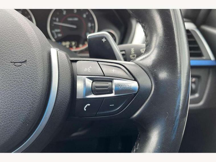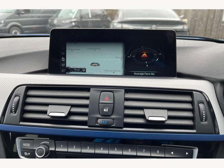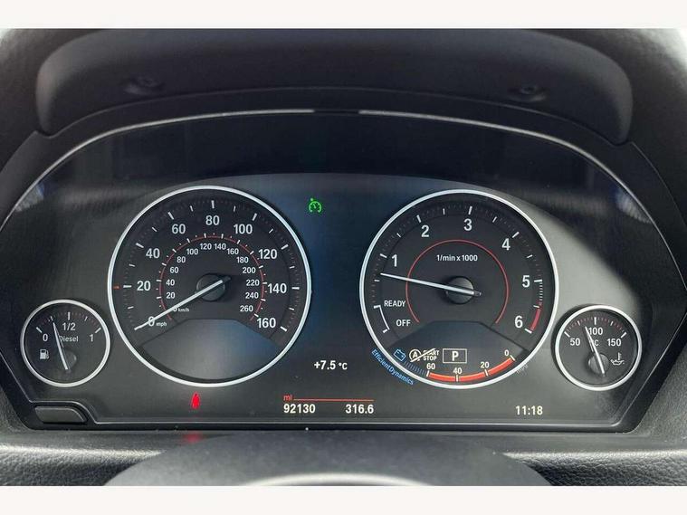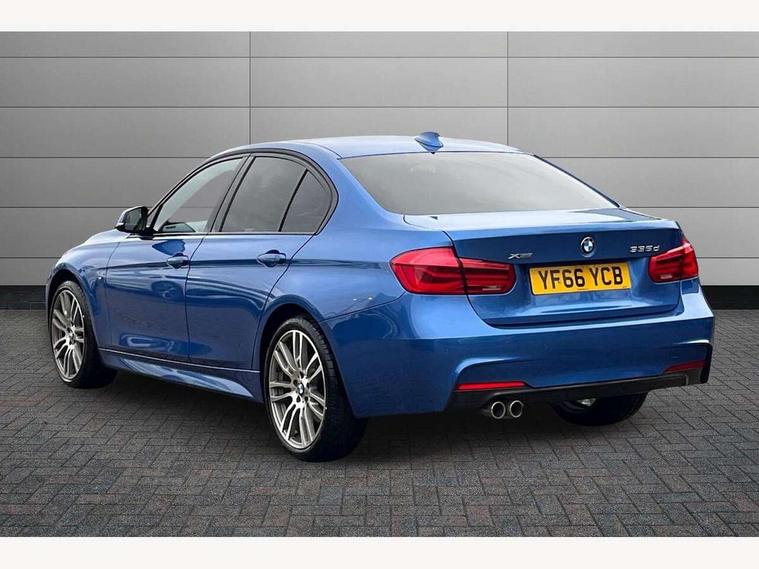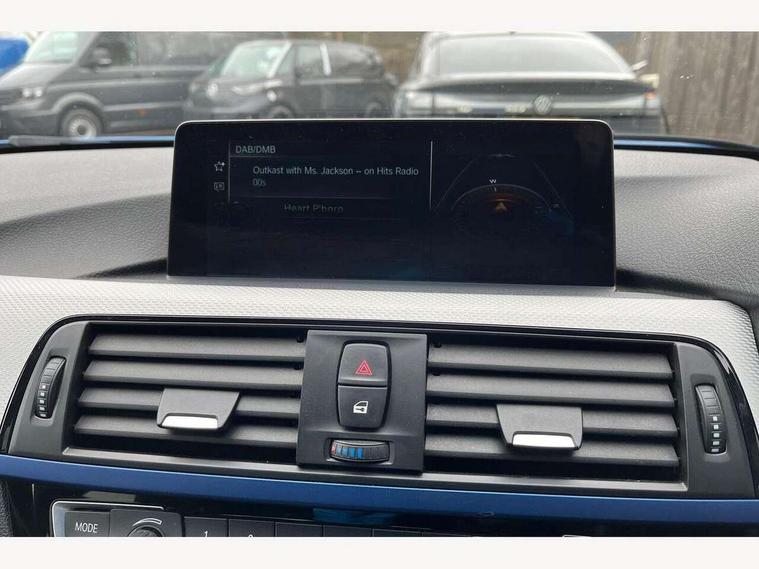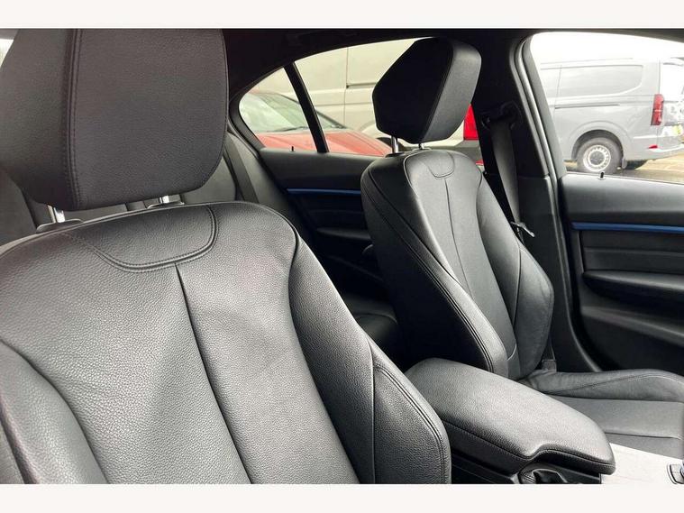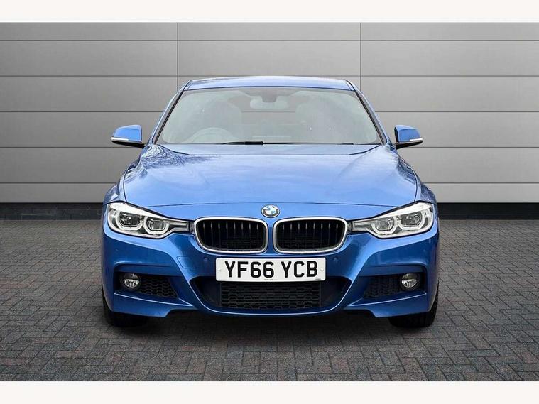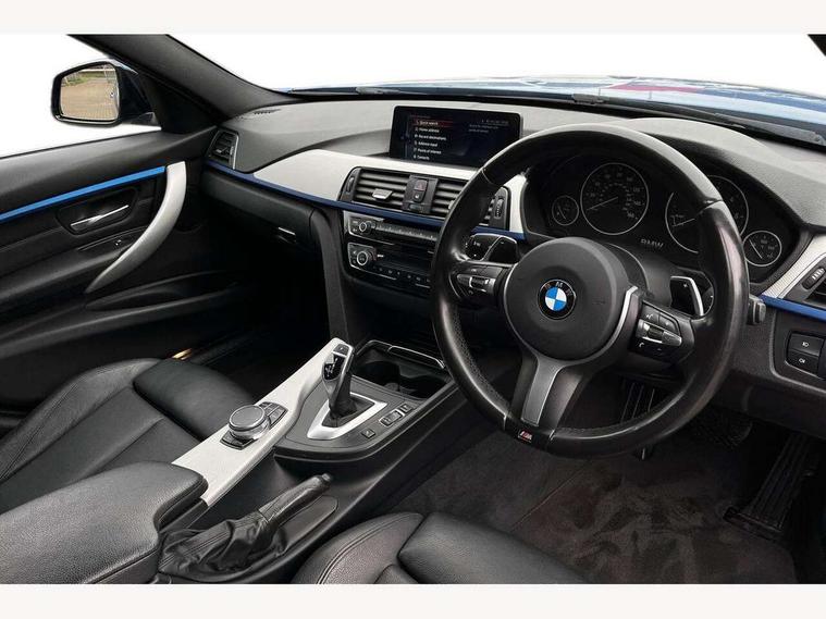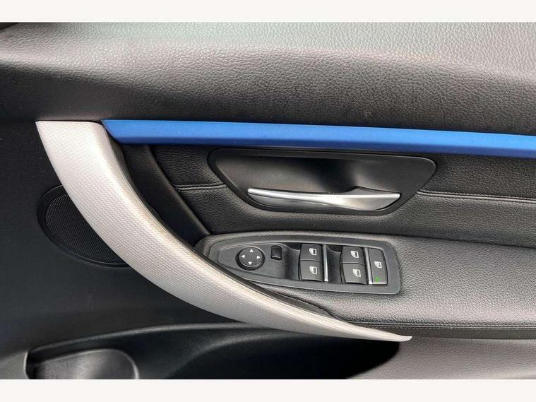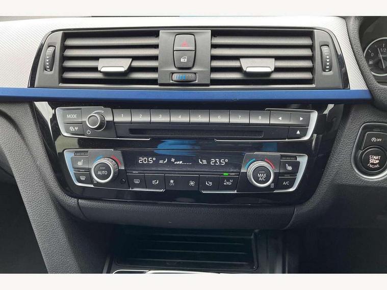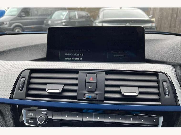 BMW Online services, BMW Teleservices, Brake force display, Brake pad wear indicator warning light, Check control system, Digital clock, Door/boot open warning light, Front/rear park distance control, Lights on warning, Oil temperature gauge, On board computer, On board diagnostics, Operation warning of all exterior lights, Outside temperature display, Push button starter, Run flat tyre indicator, Service interval indicator, Traffic message channel (TMC), Diesel particulate filter, Drive Performance Control, Electronic differential lock, Sports function on gearbox with steering wheel mounted gearshift paddles, Auxiliary point for auxiliary devices, BMW professional radio/CD/MP3, CD Changer preparation, DAB Digital radio, 'Guide me home' headlamps, 2 speed adjustable intermittent wipers with wash/wipe function, Auto dimming rear view mirror, Automatic headlight beam throw control, Body colour bumpers, Body colour door handles, Body colour electric adjustable door mirrors, Body colour roof mouldings, Chromed finished twin exhaust, Clear indicator lenses, Door sill finishers, Dynamic brake lights, Electric front and rear windows with one touch/convenient open/close function, Front ornamental grille with chrome plated kidney bars and chrome bezel, Green tinted heat insulating glass, Heated rear window with automatic switch off, Heated windscreen washer jets, High gloss shadow line, LED daytime running lights, LED fog lights, Rain sensor + automatic driving lights control, Shark fin roof aerial, 12V sockets in front centre console and passenger footwell, 2 x folding cupholders in instrument panel above glovebox, 3 rear seat head restraints, 4 foldable grab handles - rear with clothes hook, 4 lashing points to secure luggage, Automatic interior light soft on/soft off system, Driver and passenger sunvisors with vanity mirrors + slide cover, Dual zone automatic air conditioning, Folding front centre armrest + storage, Front and rear door armrests, Front and rear velour floor mats, Front door storage bins with bottle holder, Front sports seats with electric side bolster adjustment, Glovebox light, Height adjustable front headrests, Indirect front interior illumination - soft-light function, Individual anthracite headlining, Isofix system on outer rear seats, Leather gear knob, Leather gear selector lever handle, Leather handbrake grip, Lockable glovebox, Luggage compartment lighting, M sports leather steering wheel, Multi-function controls for steering wheel, Reach + rake adjustable steering column, Rear centre armrest with 2 cupholders, Rear storage compartment in multifunction centre console with sliding cover, Storage compartment in rear doors, Toolkit located in luggage compartment, Extended lighting package - 3 Series, 3 point inertia reel seatbelts + pre-tensioners on outer rear seats, ABS, Automatic Stability Control (ASC), BMW emergency call, Cornering brake control (CBC), Crash sensor, Driver and passenger airbags, DSC+, Dynamic brake control, Dynamic Traction Control - DTC, Front and rear head airbags, Front passenger airbag deactivation, Front seat side impact airbags, Front seatbelt pretensioners + load limiters, Hill start assist, Rear child proof door locks, Seatbelt warning, Three 3 point rear seatbelts, Twin horns, Tyre pressure monitor, Warning triangle and first aid kit, Automatic drive away locking facility, Central locking fuel filler cap, Centre lock switch, Electronic immobiliser, Key integrated remote control central locking, Remote control alarm, Low rolling resistance tyres, Run-flat tyres,