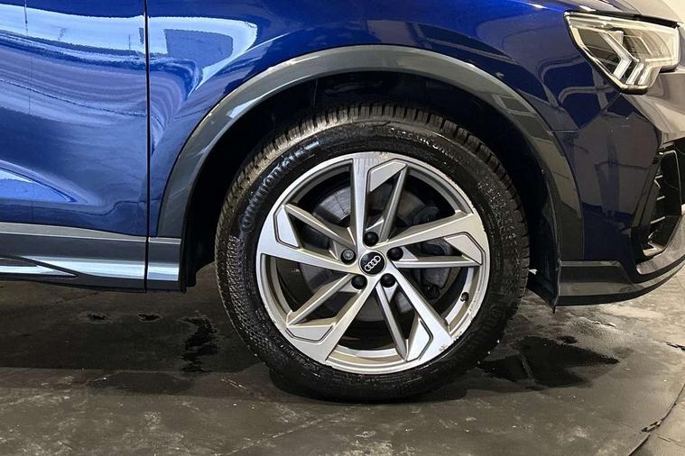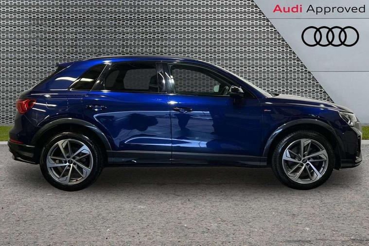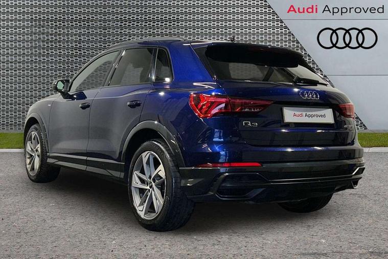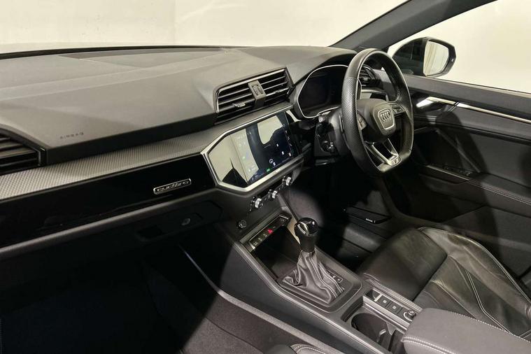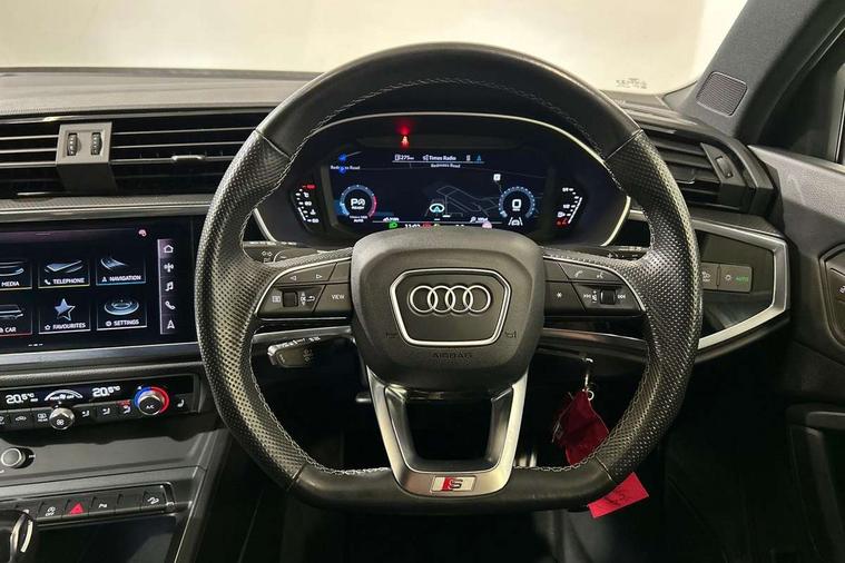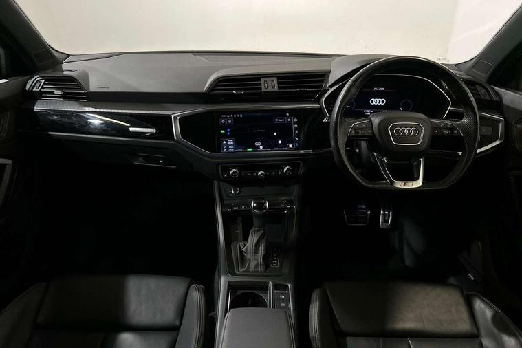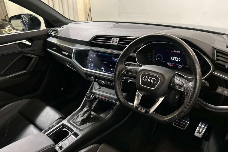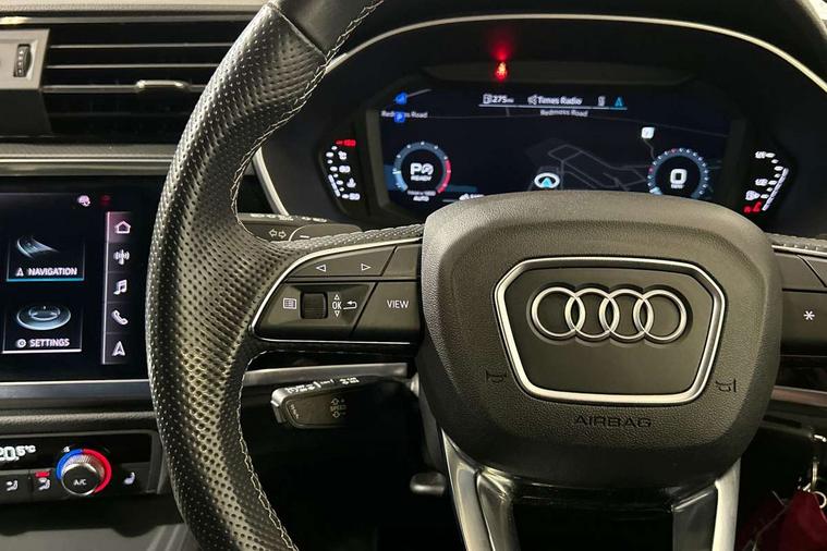 Amazon alexa Integration, Audi connect safety and service (e-call), Audi drive select, Audi lane departure warning, Audi Virtual Cockpit - 10.25" display, Bluetooth interface, Camera based traffic sign recognition, MMI Navigation Plus with high resolution 10.1 inch touchscreen colour display, Power operated tailgate, Progressive steering, Service interval indicator, Smartphone interface includes wireless Apple carplay/Android Auto, Start stop system with recuperation, Voice control system with natural language interaction, Sports suspension, 2 USB-C ports with charge and data functions, 6 passive loudspeakers, DAB digital radio module, Acoustic windscreen, Auto dimming frameless rear view mirror, Black roof rails, Electrically folding, adjustable and heated door mirrors with integrated LED side indicators and kerb view function for passenger side, Front and rear electric windows, Front fog lights, Grille vertical bars in aluminium silver/Matt, High gloss black finish B and C pillars, LED headlights with LED daytime running lights, LED rear lights, LED third brake light, Privacy glass dark tinted rear and rear-side windows (from B-pillar backwards), Rain and light sensors, Rear diffuser strip in matt titanium black, Rear side wing doors, Rear wiper, S line bumpers in contrasting Manhattan grey, Tinted rear windows, Variable front intermittent wipers, 12V socket in rear centre console, 3 seat bench in 2nd row, 40:20:40 folding with manual adjustment for 60:40 forwards/backwards position and backrest angle, Adjustable rear seat bench/backrest with centre armrest and cupholder, Black cloth headlining, Dual zone electronic climate control, Front and rear black floor mats with contrast stitching in rock grey, Front and rear headrests, Front and rear roof module including reading lights, Front centre armrest, Glove compartment lighting, Height and reach adjustable steering wheel, Illuminated door sill trims with S logo, ISOFIX child seat mounting for front passenger with airbag deactivation and outer rear seat including top tether attachment point for outer rear seats, Luggage compartment light, Manual front seats with height adjustment, Perforated leather gearknob, Single front passenger seat, Stainless steel luggage compartment sill finisher, Stainless steel pedals, Black styling pack - Q3, Non smoking pack - Q3, 3x3 point rear seatbelts, 6 airbags - Driver, front passenger, curtain and side windows, Audi pre-sense front with pedestrain and cyclist recognition, Electrically operated child locks on rear doors, Electromechanical parking brake, Electronic stabilisation control including ABS, ASR and EDL, Front seatbelt reminder, Hill descent control, Hill hold assist, Pre sense basic, Seatbelt monitoring, Tyre pressure warning, Warning triangle and first aid kit, Anti theft alarm, Anti theft wheel bolts, Immobiliser, Remote central locking, Detail dashboard around MMI touch colour display in glass look, black with surround in aluminium look, Leatherette door armrest, Piano black inlay,