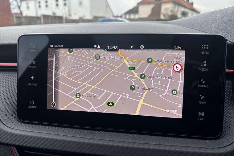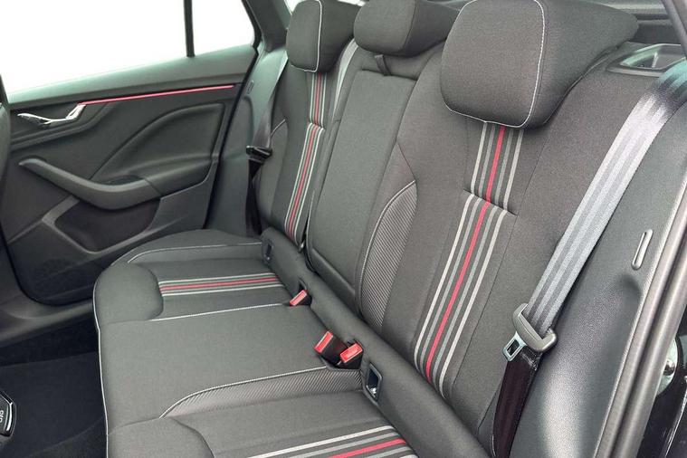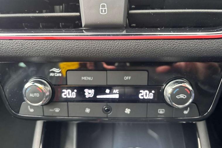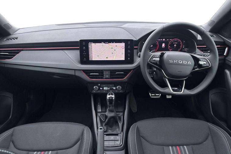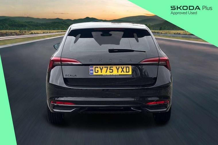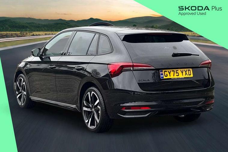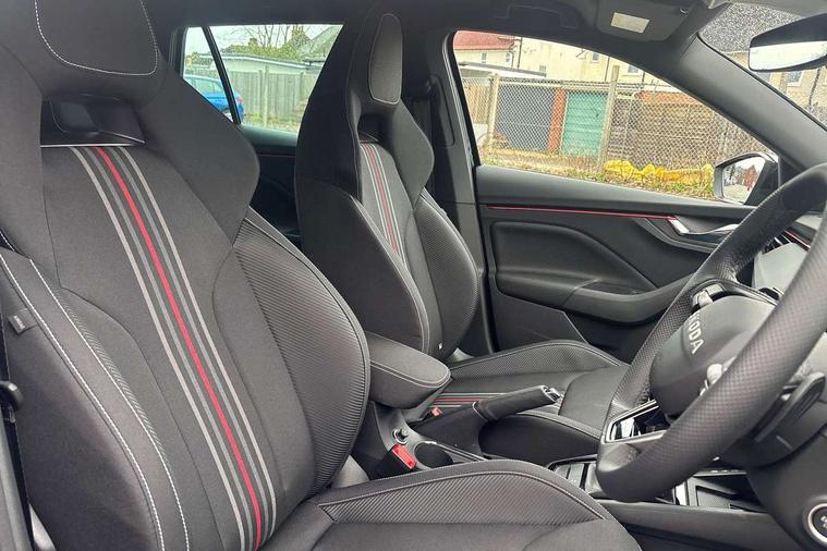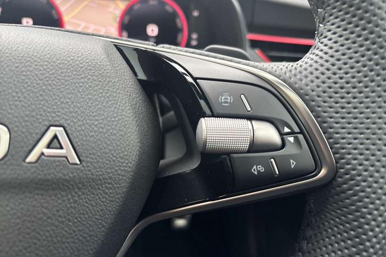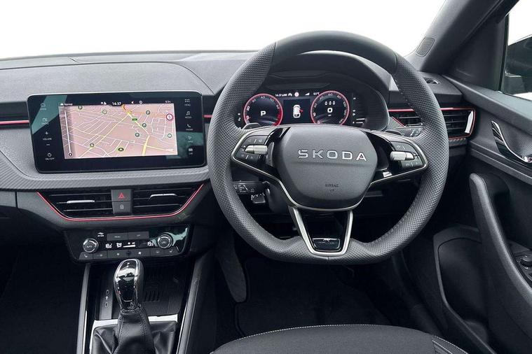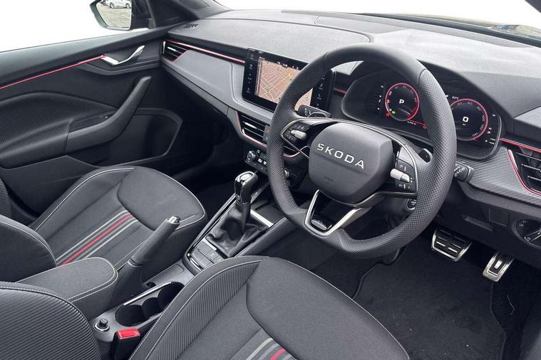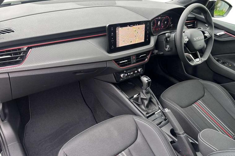 Advanced driver attention and drowsiness monitor, Bluetooth, e-Call (emergency call), Front assist system, PAS, Rear parking sensors, Rear view camera, Speed limiter, Tailgate, Traffic sign recognition, Virtual Cockpit - 10.25" digital display, Voice control system, Wireless smartlink, Drive mode select with Sport Chassis Control and ECO mode, 4 USB C ports, 8 Speakers, 9.2" Skoda navigation display, DAB radio, Auto dimming rear view mirror, Automatic headlight control with manual coming and leaving home feature, Automatic intermittent wipers, Black door mirrors, Black lettering on boot lid, Black radiator grille, Black rear diffuser, Black roof spoiler, Black window frames, Body colour bumpers, Body colour door handles, Extended tailgate glass, Front and rear electric windows, Heated rear window, LED 3rd brake light, LED daytime running lights, LED high beam, LED low beam, Light sensors, Monte carlo plaque, Panoramic glass roof, Privacy glass, Rear LED fog light, Rear side wing doors, Rear wiper, Tinted windows, Unique dark chrome design logo on alloy wheels, 12V socket in luggage compartment, 3 seat bench in 2nd row, Aluminium pedals, Ambient lighting in white/red, Black / White armrest stitching, Black roof headlining, Cargo elements, Chrome inner door handles, Door inserts in art.leather carbon, Driver and passenger sun visors with vanity mirror, Dual zone climate control, Front and rear roof lights, Front centre armrest, Front head restraints, Height adjustable driver seat, Height adjustable passenger seat, Ice scraper, Illuminated glove compartment, Inner circulation control with pollen filter, ISOFIX for front passenger seat, Isofix preparation for back seats, Leather gearknob and handbrake lever, Luggage net under rear parcel shelf, Manual lumbar support for front seats, Monte Carlo cloth upholstery, Net package and top tether hooks in boot space, Pocket on the back of both front seats, incl. mobile phone pockets, Rear centre armrest, Red hotstamping, Single front passenger seat, Skoda lettering on steering wheel, Sport seats, Textile floor mats, Third rear headrest, Ticket holder, Top tether for front passenger seat, Umbrella in driver's door, Light and view plus pack - Scala, 3x3 point rear seatbelts, ABS, Child locks, Curtain airbags and front side airbags, Disc brakes, Driver and front passenger airbags, ESP, Hill hold control, Manual leather parking brake, One tone horn, Passenger airbag switch off function, Seatbelt reminder for driver and front passenger, Tyre pressure monitoring system, Anti theft alarm system with interior monitoring, backup horn and towing protection, Anti-theft wheel bolts, Remote central locking with 2 remote folding keys, SAFE function for remote central locking, Carbon effect decorative inserts, 18" Ursa black diamond cut alloy wheels,