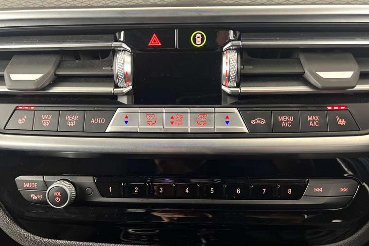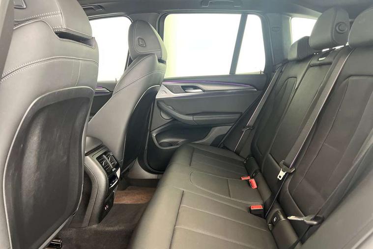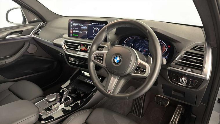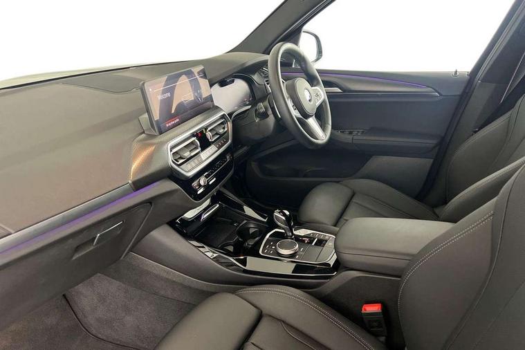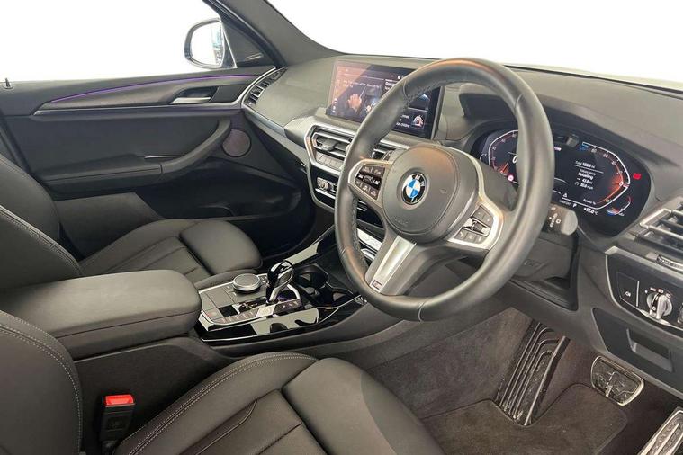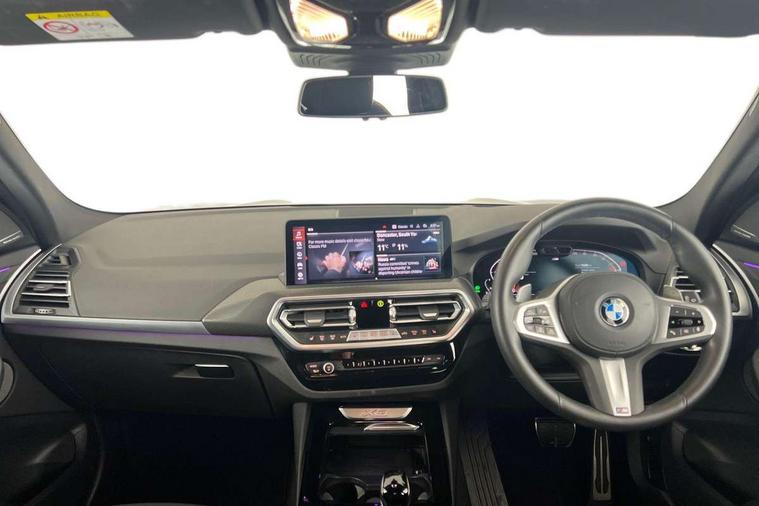 Active Guard, Attentiveness assist, BMW Live Cockpit Professional nav system including 12.3" instrument display + 12.3 high resolution control display, BMW Online services, BMW Teleservices, Brake pad wear indicator in front and rear, Check Control warning system for monitoring of lights and door/luggage compartment open warning, Condition based service - BMW service history, electronic service booklet, integrated owner's handbook, Connected drive services, Electric boot lid, Front/rear Parking distance control, iDrive touch controller with 8 favourite buttons, Instrument cluster with speedometer with mph readout, tachometer, fuel gauge and oil temperature gauge, Lights on warning by audio warning signal when ignition is switched off, Oil sensor for level and grade, warning by check control system, On board computer - average speed+fuel consumption, service interval, clock/date, odometer/trip meter, outside temperature display and ice warning, Optimum shift indicator, Personal Profile - automatic lock when driving away selectable, Run flat indicator, Stop/start system, Variable sports power steering with drive performance control Sport+ mode, Automatic transmission with gearshift paddles, Incorrect fuelling protection, M sport suspension, Multi-link rear suspension, BMW professional radio/CD/MP3, DAB tuner, Acoustic glazing, Automatic windscreen wipers and automatic headlight, Black finish on B pillars, Body colour door handles, Body colour electric adjust heated aspherical door mirrors, Body colour roof mouldings, Body coloured bumpers, Direction indicator, side repeaters, integrated in exterior mirrors, Dynamic brake lights, Exhaust tailpipes - dual, round, split left and right with chrome finisher, Fingertip control / anti-trap function on electric window, Folding wing mirrors with auto dimming, Follow me home headlights, Front and rear bumper system with replaceable deformation elements, Front and rear electric windows, Gloss chrome tailpipes finishers, Green tinted heat insulating glass, Heated windscreen washer jets, High beam assistant, High gloss black shadow line roof rails, High gloss shadowline exterior trim in decorative moulding side frame/recess cover/guide rail/B, C pillars/mirror frame and triangle with mirror base, High level 3rd brake light incorporating LED Technology, Interior rear view electrochromatic mirror with automatic anti dazzle function, LED tail lights, Lightweight engineering, M aerodynamic bodystyling, M Sport entry door sill strips, Model designation, Rain sensor, Rear side wing doors, Rear wing door, Rear wiper, Shark fin antenna, Side exterior M designation badges, Visible VIN plate, Welcome lighting, Windscreen wipers with adjustable interval, 12V power point in luggage area, 12V power socket in front centre console, 2 x USB Type C ports for charging and data transmission (front centre console) and 2 x USB Type C ports for charging (rear centre console), 3 rear headrests, 3 seat bench in 2nd row, 3 zone automatic air conditioning, 4 lashing points to secure luggage, 40:20:40 split folding rear seat with loading system, Ambient lighting, Anthracite headlining, Automatic interior light when door is opened/ignition switched off or via remote key, Floor mats in velour, Foldable storage floor with compartment, Four grab handles integrated in roof lining, Front and rear bottle holders integrated into door trim storage compartments, Front and rear side armrests integrated into door trim, Front centre armrest with storage compartment, Front footwell lights, Front head restraints, Front passenger seat, Front sports seats, Front/rear courtesy lights with soft on/off dimming, Front/rear reading lights, Heated front seats, Isofix rear child seat preparation, Leather gear knob, Lockable glove compartment, Luggage area underfloor compartment, Luggage compartment lighting, M sport leather steering wheel, Multifunction steering wheel, Parcel shelf removeable and storable under boot floor, Reach and rake adjustable steering column, Rear centre armrest with 2 cupholders, Removable / retractable luggage cover, Slope adjustable rear seats, Storage compartment in rear centre console and front/rear door trims, Sun visors with vanity mirrors and ticket pocket, Toolkit located in luggage compartment, Two front cupholders with removable oddments tray/lid, Connected pro pack - X3, ADB - Automatic Differential Brake, Anti-lock braking system (ABS) with brake assist, Automatic Stability Control (ASC), Battery safety cut-off, BMW emergency call, Brake drying, Brake energy regeneration, Braking pre-tensioning, Child locks on rear doors, Cornering brake control (CBC), Crash Sensor - activation of central locking release, hazard warning light and interior lighting, Deactivation of fuel pump in the event of a crash, Driver and front passenger front and side airbags with passenger deactivation and ITS front and rear head airbags, Driver and front passenger knee airbag, DSC+, Dynamic brake control, Dynamic Traction Control - DTC, Electromechanical parking brake, Hill descent control, Hill start assist, Seatbelt security check for front seats, Side impact protection, Three point seatbelts to all seats with front and outer rear pyrotechnic belt tensioners and seat belt force limiters, Two tone horn, Tyre pressure sensor, Ventilated front and rear disc brakes, Warning triangle and first aid kit, Central locking switch for all doors, fuel filler cap and luggage compartment, Electronic engine immobiliser, Locking wheel nuts, Remote control including two integrated key - one button for open/close all lockable content, windows and separate button for open luggage compartment, Remote control Thatcham category 1 alarm, Start/stop button with Comfort Go keyless engine start and auto Start/stop deactivation button, Low rolling resistance tyres,