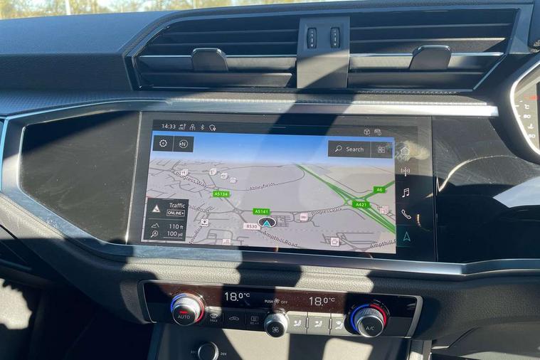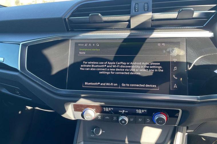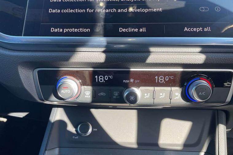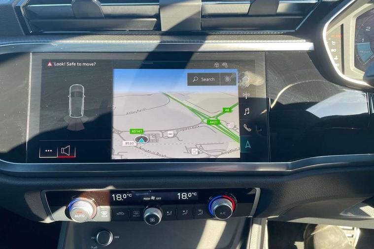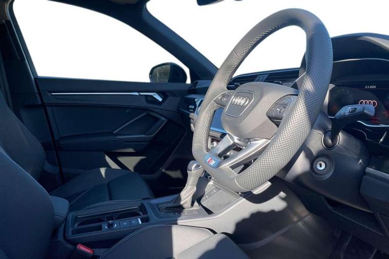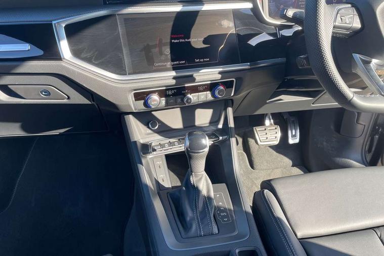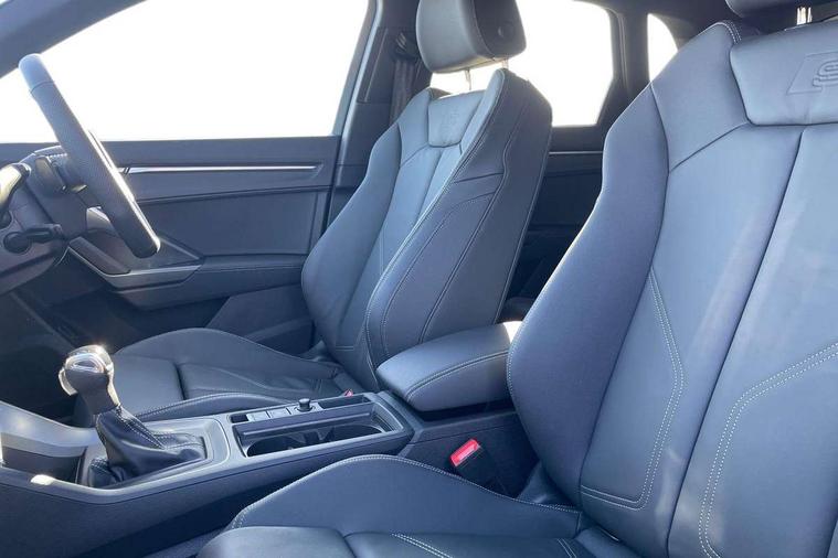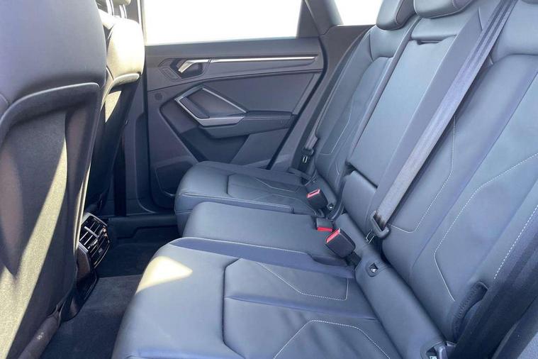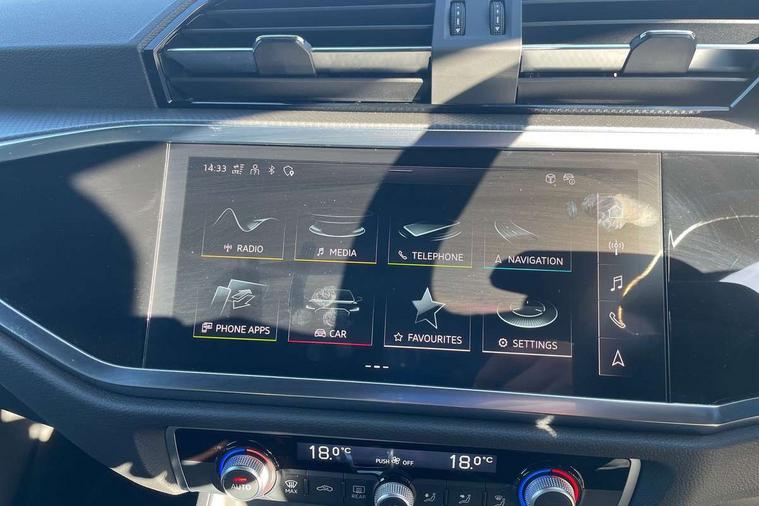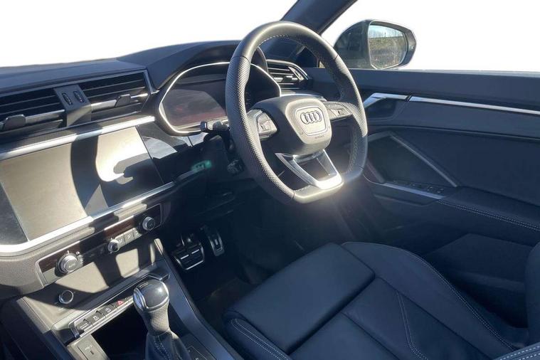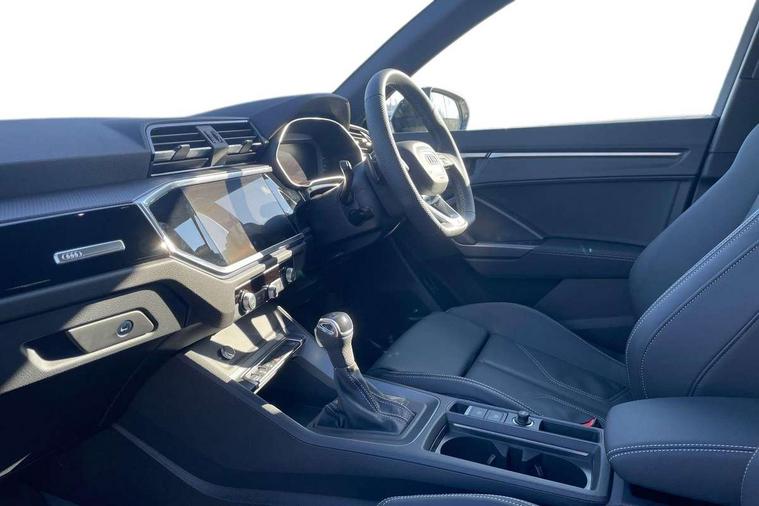 Amazon alexa Integration, Audi connect safety and service, Audi drive select, Audi lane departure warning, Audi Virtual Cockpit - 10.25" display, Bluetooth interface, Camera based traffic sign recognition, Distraction and Fatigue warning, Legal emergency call, MMI Navigation Plus with high resolution 10.1 inch touchscreen colour display, Power operated tailgate, Progressive steering, Service interval indicator, Smartphone interface includes wireless Apple carplay/Android Auto, Start stop system with recuperation, Voice control system with natural language interaction, Sports suspension, 2 USB-C ports with charge and data functions, 6 passive loudspeakers, DAB digital radio module, Acoustic windscreen, Anthracite black radiator grille, Audi Beam uses LEDs to project the Audi logo onto the ground as you exit your Q3, Auto dimming door mirrors, Auto dimming frameless rear view mirror, Black roof rails, Electrically folding, adjustable and heated door mirrors with integrated LED side indicators and kerb view function for passenger side, Front and rear electric windows, Front fog lights, Grille vertical bars in aluminium silver/Matt, High gloss black finish B and C pillars, LED Dynamic rear indicators, LED headlights with LED daytime running lights, LED rear lights, LED third brake light, Privacy glass dark tinted rear and rear-side windows (from B-pillar backwards), Rain and light sensors, Rear diffuser grille in grained matt black, Rear diffuser strip in matt anthracite black, Rear side wing doors, Rear wiper, S line bumpers in contrasting Manhattan grey, Variable front intermittent wipers, 12V socket in rear centre console, 3 seat bench in 2nd row, 40:20:40 folding with manual adjustment for 60:40 forwards/backwards position and backrest angle, Adjustable rear seat bench/backrest with centre armrest and cupholder, Black carpet mats, Black cloth headlining, Dual zone electronic climate control, Electric lumbar support, Front and rear black floor mats with contrast stitching in rock grey, Front and rear headrests, Front centre armrest, Height and reach adjustable steering wheel, Illuminated door sill trims with S logo, ISOFIX child seat mounting for front passenger with airbag deactivation and outer rear seat including top tether attachment point for outer rear seats, Luggage compartment sill protection in stainless steel, Manual front seats with height adjustment, Perforated leather gearknob, Single front passenger seat, Stainless steel pedals, Twin leather upholstery with front sport seats + S embossing, Black styling pack - Q3, Non smoking pack - Q3, 3x3 point rear seatbelts, 6 airbags - Driver, front passenger, curtain and side windows, Audi pre-sense front with pedestrain and cyclist recognition, Electrically operated child locks on rear doors, Electromechanical parking brake, Electronic stabilisation control including ABS, ASR and EDL, Front seatbelt reminder, Hill descent control, Hill hold assist, Pre sense basic, Seatbelt monitoring, Tyre pressure warning, Warning triangle and first aid kit, Anti theft wheel bolts, Immobiliser, Remote central locking, Thatcham approved category 1 anti theft alarm, Aluminium look interior elements, Detail dashboard around MMI touch colour display in glass look, black with surround in aluminium look, Leatherette door armrest, Piano black inlay,