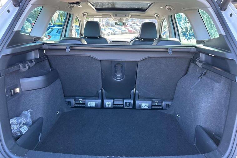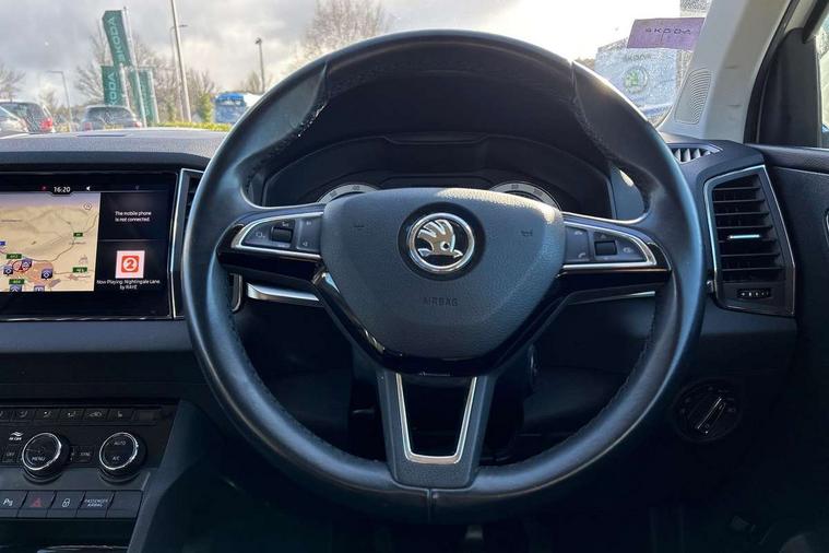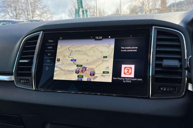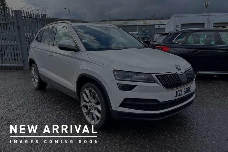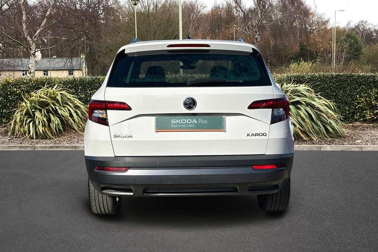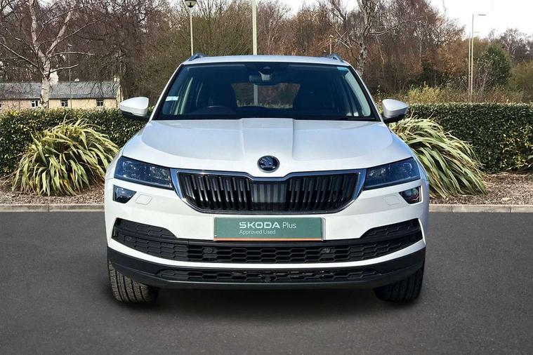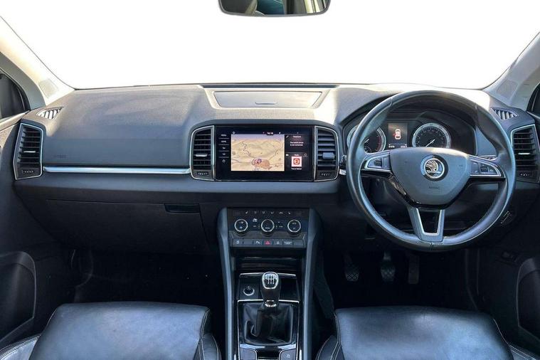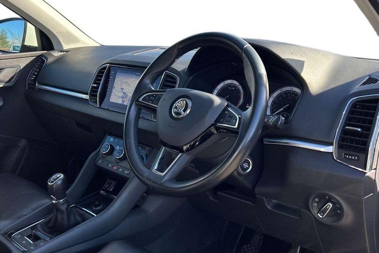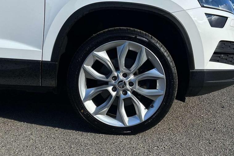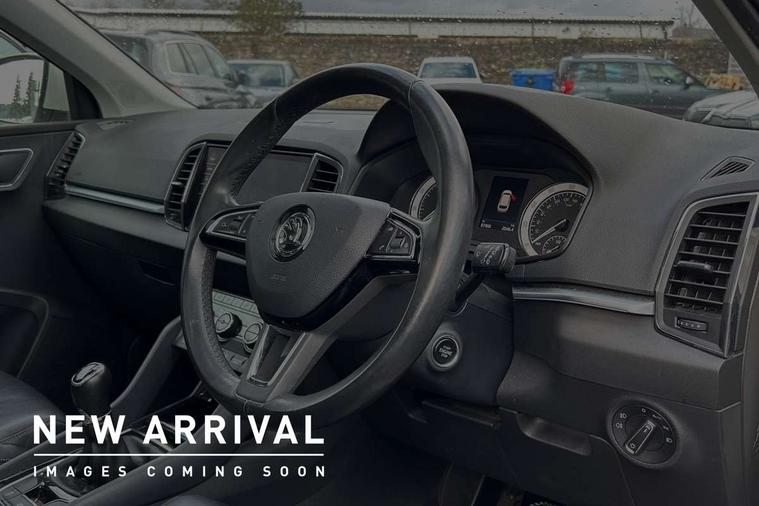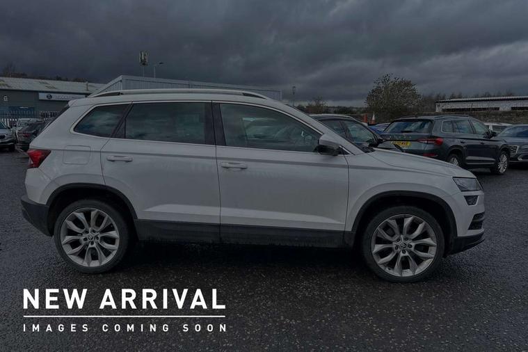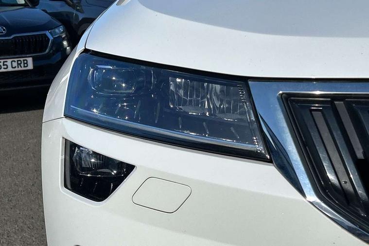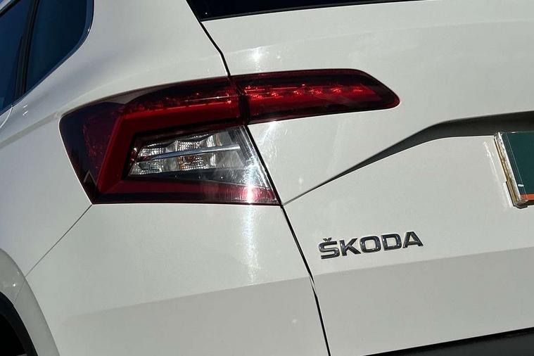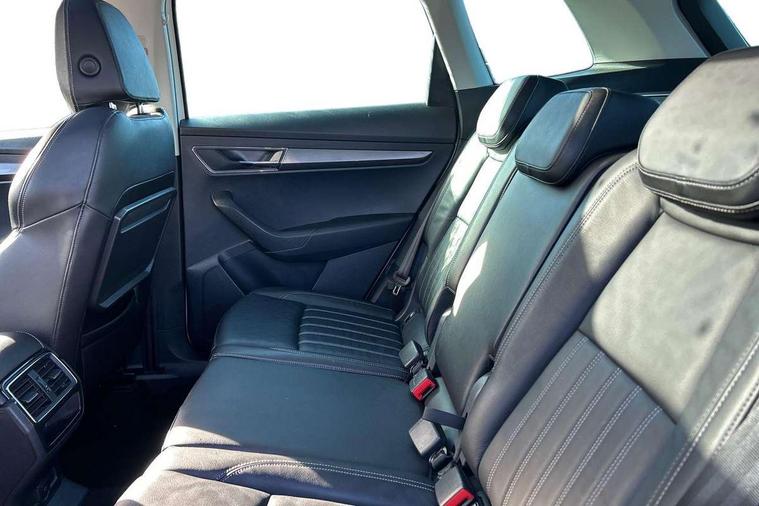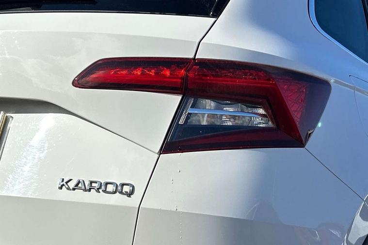 Chrome air vent surrounds, LED Interior lighting pack - Karoq, 19" Crater silver alloy wheels, Alarm with interior monitoring and tilt sensor, Anti-theft wheel bolts, Electronic immobiliser, Keyless entry and keyless start, Remote central locking, Bolero Radio, DAB Digital radio, SD card slot, USB connection, 3 point front/outer rear seatbelts+pre-tensioners, 3x3 point rear seatbelts, ABS, Automatic unlocking of doors in case of impact, Curtain airbags, Driver and passenger airbags, Driver and passenger side airbags, Drivers knee airbag, Electronic parking brake, ESP including MBA, MSR, ASR, EDL, HBA, Front assist including city emergency braking, Fuel supply cut off, Head airbags, Hill hold control, Passenger airbag deactivate switch, Seatbelt warning lamp, Two tone horn, Tyre pressure monitor, Aero wiper + intermittent function, Aluminium window surround, Automatic headlight control system, Body colour door handles, Body colour door mirrors, Body coloured bumpers, Chrome roof rails, Electric adjustable heated door mirrors with boarding spots and memory function, Electric folding door mirrors, Electric front windows, Electric rear windows with child safety lock, Front doors reflectors, Full LED headlights + adaptive front light system + LED daytime running lights and front cornering fog lights, Headlight washers, Heated rear window, Light assistant (coming home/tunnel light), Panoramic sunroof, Privacy glass, 12V Accessory socket in centre console, 12V power point in luggage area, 3 rear height adjustable headrests, 4 lashing points on luggage floor, 60/40 split fold rear seat back, Bottle holders, Chrome inner door handles, Driver's lumbar support, Dual zone automatic air conditioning with humidity sensor and control, Electrically adjustable front seats + drivers door mirror with memory, Floor mats, Folding tables on the front seat backrests, Front centre armrest with storage compartment, Front seat and rear pockets, Front/rear reading lights, Height adjustable front head restraints, Height/reach adjust steering wheel, Illuminated air conditioned glovebox, Illuminated luggage compartment, Isofix system on outer rear seats, Leather upholstery, Luggage compartment cover, Parcel shelf - retractable, Passenger lumbar support, Passenger side net compartment on centre console, Pollen filter, Removable LED light in boot, Storage box in dash, Storage under front passenger seat, Sunglasses storage, Sunvisors with illuminated vanity mirrors, Umbrella under front passenger seat, Varioflex individually removeable/folding rear seats, Columbus satellite navigation with 9.2" touch screen and integrated Wi-Fi, Drive mode selector, Driver alert system, Driver profile selection, Electro-mechanical PAS, Fatigue detection system, Front and rear parking sensors, Lane change assist and blind spot monitor, Multifunction colour trip computer, Outside temperature gauge, Power boot opening and closing, Rear view camera, Service interval indicator, Speed limiter, Travel assist with traffic sign recognition, Voice control system,
