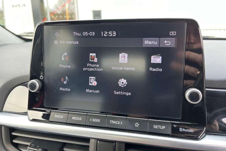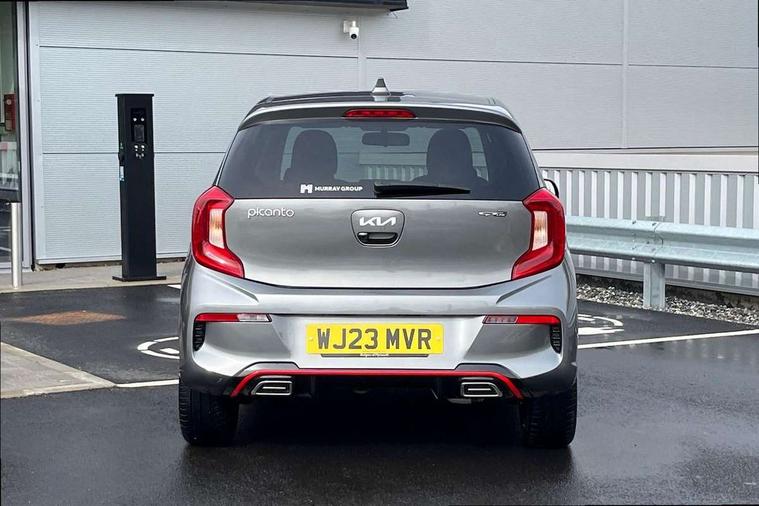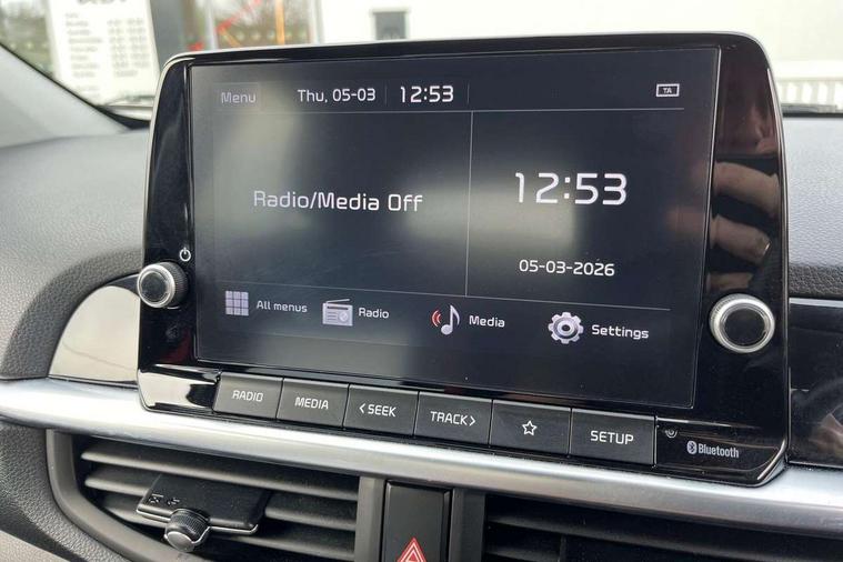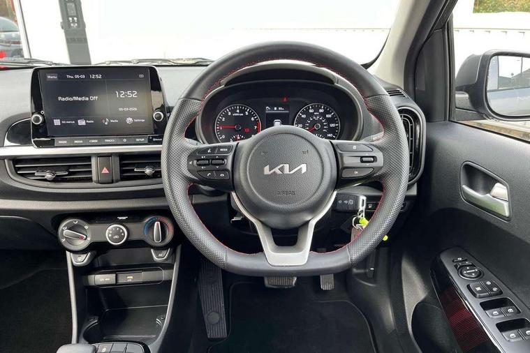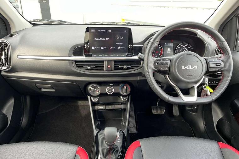 8" touchscreen display with RDS and DAB, Apple car play/Android Auto with voice control, Emergency call service, Emergency stop signalling system, External temperature gauge, Motor driven power steering, Reversing camera system with dynamic guidelines (Integrated into centre fascia screen), Tachometer, Trip computer, 6 speaker audio system, Bluetooth with music streaming, Steering wheel mounted controls, USB ports for connection of a media device, Automatic headlight control system, Bi-function projection headlights, Black beltline mouldings, Black grille with silver surround, Body colour B pillars, Body colour bumpers, Body colour mirrors and door handles, Body colour side sill mouldings, Day/night rear view mirror, Electric adjustable/heated/folding door mirrors with LED indicators lights, Front and rear electric windows with drivers's auto up/down function, Front fog lights, Headlamp levelling, Heated rear window, High mount brake light, LED daytime running lights, LED rear fog lights, LED rear lights, Privacy glass - Rear windows and tailgate, Rain sensor, Rear side wing doors, Rear wash/wipe, Speed variable front wipers, Sports front and rear bumpers with gloss black skid plates twin exhaust, Tinted glass, Visible VIN plate, Welcome and follow-me home light functionality, 1 x rear coat hook, 12V power point front, 2 seat bench in 2nd row, 3 x passenger assist grips, 60/40 split/folding 2nd row of seats, All round height adjustable headrests, Black and red accents front door armrest, Centre Console with Storage Box and Sliding Armrest, Cupholders in centre console, D-cut steering wheel with red stitching, Driver and front passenger sunvisor with vanity mirror, Driver seat height adjust, Faux leather upholstery, Front cabin lights, Glovebox, High gloss lower centre fascia trim, door armrest and air vents, ISOFIX Child seat top tethers and anchor fixings, Leather trimmed steering wheel and gearshift, Luggage area light, Luggage area parcel shelf, Manual air conditioning, Passenger front seatback pockets, Satin chrome interior door handles, Single front passenger seat, Slide/reclining front seats, Tilt adjustable steering wheel, Advanced Driver Assistance Pack - Picanto, 2 x 3-point rear seatbelts, ABS/EBD, Automatic unlocking of doors in case of impact, Dual front airbags, ESC + BAS + VSM + HAC, Front passenger airbag cut-off switch, Front seatbelt height adjusters, Front seatbelt pretensioners + load limiters, Hill hold control, Knee airbags, Rear child proof door locks, Seatbelt warning, Side impact protection, Torque vectoring brake based and straight line stability (SLS), Traction control, Twin curtain airbags, Twin front side airbags, Tyre pressure monitoring system, Anti theft alarm, Engine immobiliser, Folding key, Locking wheel nuts, Remote central door locking, 16" alloy GT-Line wheels, Tyre mobility kit,