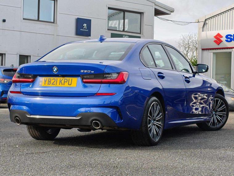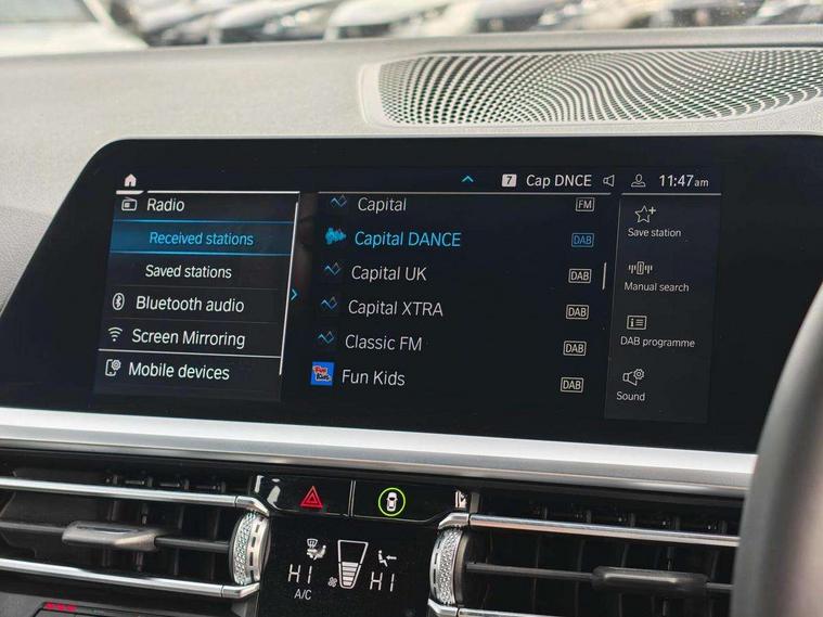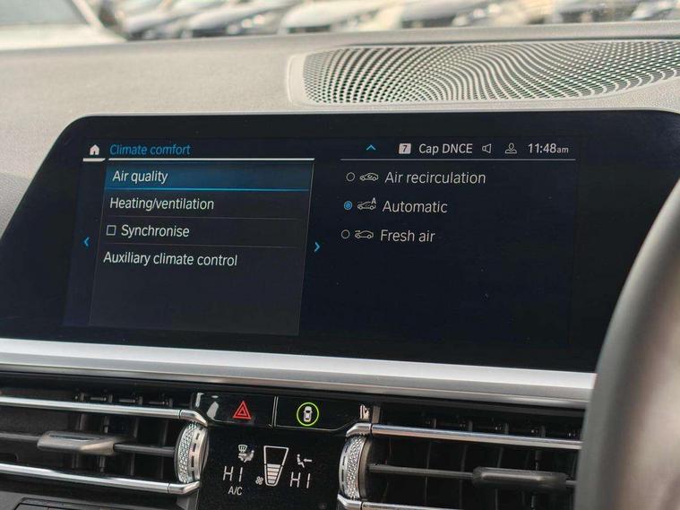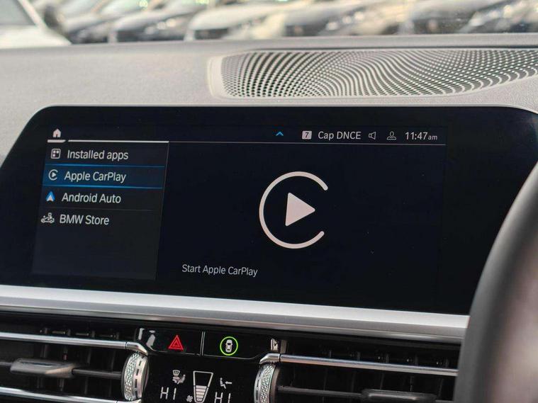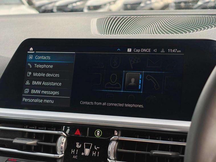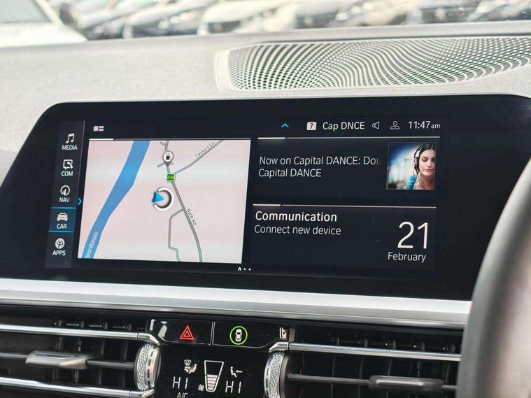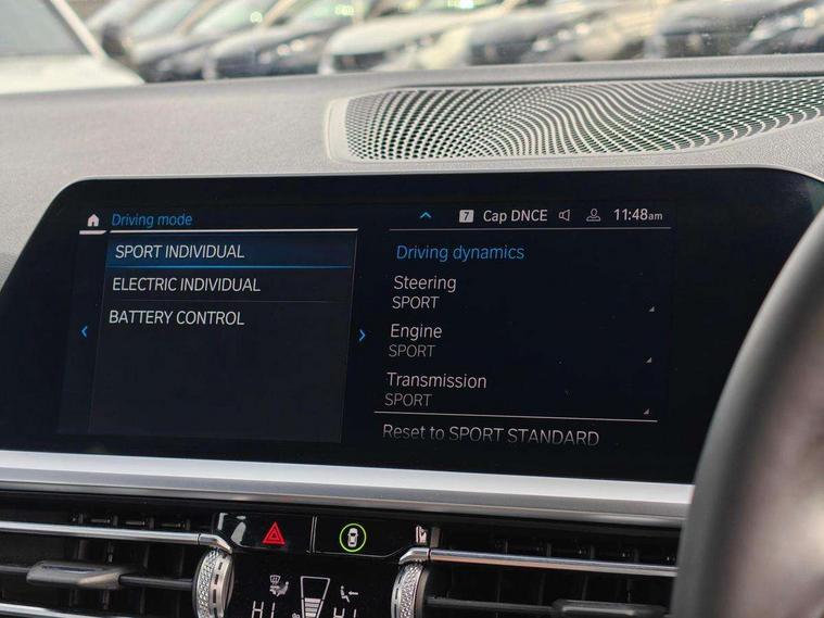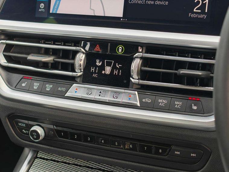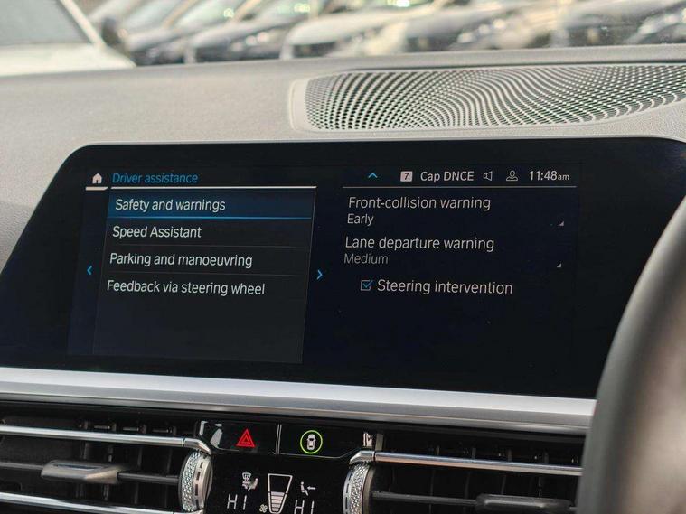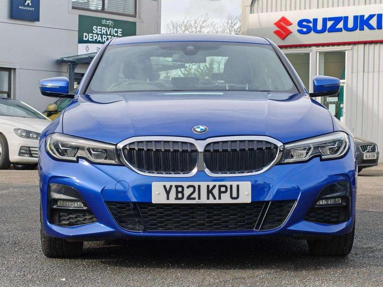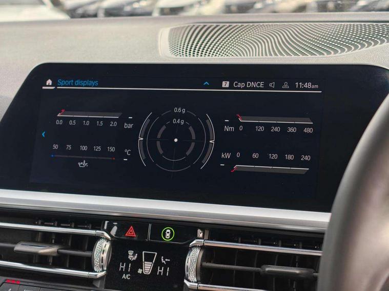 Active guard plus, Attentiveness assist, Auto start-stop, BMW iDrive controller on centre console, BMW Live Cockpit Professional Nav with 12.3" instrument display + 10.25" display, Intelligent Voice Assist, BMW OS 7, HDD, 2USB, 4G LTE connect, BMW service history, BMW Teleservices, Brake pad wear indicator in front and rear, Check Control warning system for monitoring of lights and door/luggage compartment open warning, Condition based service, Electric power steering with Servotronic steering optimised at all speed ranges, Instrument cluster with speedometer with mph readout, tachometer, fuel gauge and oil temperature gauge, Integrated owners handbook, Oil sensor for level and grade, warning by check control system, On board computer - average speed+fuel consumption, service interval, clock/date, odometer/trip meter, outside temperature display and ice warning, Optimum shift indicator, Personal Profile - automatic lock when driving away selectable, Balanced 50/50 weight distribution, Battery cut-out switch, Drive performance control - ECO PRO, comfort and sport modes, Electronic differential lock control (EDLC), Petrol Particulate Filter, Stroke dependent dampers, DAB tuner, Electronic service booklet, Acoustic glazing, Active airstream chrome frame kidney grille with 8 high gloss black vertical slats, Automatic headlight beam throw control with load dependent regulating reaction, dynamic compensation of braking dive and acceleration squat, Black roof mouldings, Body colour door handles, Body colour front and rear bumpers, Body colour fuel filler flap, Body colour mirror caps with bottom segment in matt black, Dynamic brake lights, Electric windows - front and rear, with open/close fingertip control, anti-trap facility and comfort closing, Exhaust tailpipe - split left and right, Exterior mirrors - electrically folding with anti-dazzle, Fading support, Front and rear bumper system with replaceable deformation elements, Front black door sill finishers with BMW designation, Green tinted heat protection glazing, High gloss shadow line exterior trim, Interior rear view electrochromatic mirror with automatic anti dazzle function, LED daytime running lights, LED front fog lights, Lightweight engineering, M designation on front side panels, left and right, Matt black exterior B pillar, Model designation on right side of tailgate, Rain sensor with automatic headlight activation, Shark fin antenna, Two part LED tailights in L-shape with components in smoked glass, brake light, LED turn indicator and rear fog light, Visible VIN plate, Welcome lights in interior and door handle area, Windscreen wipers with integrated washing jets, 12V power socket in front storage compartment, 2 front cupholder in centre console with clamping elements and matt black inlay, 3 rear seats with non folding headrests with 3 point seat belts, 3 zone automatic air conditioning, 4 pieces lashing eyelets in luggage compartment, 40:20:40 split folding rear seat with loading system, Ambient lighting with welcome carpet light, Anthracite headlining, Armrest integrated in front and rear door trim + front centre console armrest, Centred top Luggage compartment lights, Four grab handles integrated in roof lining, Front and rear door exit lighting (left / right), Front and rear door pockets, Front and rear reading lights, Front and rear velour floor mats, Front head restraints, Front sport seats, Heated driver and front passenger seats, Height adjustable mechanically and infinitely variable steering column, Illuminated armrest storage compartment, Illuminated glove compartment with separate small compartment, Interior lighting - front centre over interior mirror with soft light, rear centre and front and rear footwell lighting, M sport leather steering wheel, Make-up mirror lights, Rear centre armrest with 2 cupholders, Rear centre console with storage compartment and ventilation grille, Sunvisors with vanity mirrors and ticket pocket, Toolkit located in luggage compartment, Connected pack professional - 3 Series Saloon/Touring, M sport exterior styling pack - 3 Series Saloon/Touring, 2 tone horn, BMW emergency call, Brake energy regeneration, Braking pre-tensioning, Child proof locking system in rear door, Child seat ISOFIX attachment rear outer seats, Coasting in idle in ECO PRO mode, Crash sensor activating of airbags, Unlocking doors, hazard warning lights, interior light, safety battery terminal, Driver and front passenger side airbags, integrated in the door side seat backrest bolsters for all seat variants, Driver/Front Passenger airbags, Dry braking, Dynamic brake control, Dynamic stability control + (DSC+) - Anti-lock Braking System (ABS) with brake assist and cornering brake control + Automatic Stability Control (ASC), Dynamic Traction Control - DTC, Electric parking brake including automatic hold function and automatic release of the parking brake when driving off, Front passenger manual airbag deactivation, Head airbags for all 4 outer seats, Hill start assist, Seat belt security check for driver and front passenger, Side impact protection, Three 3 point seat belts on all seats including front belt stopper, pyrotechnic belt tensioners and belt force limiters, Tyre pressure monitoring with three level warning strategy, Ventilated front and rear disc brakes, Warning triangle and first aid kit, Alarm system (Thatcham 1) with remote control and electronic engine immobiliser, Central locking switch for all doors, fuel filler cap and luggage compartment, Remote control with integrated key one button open/close vehicle and windows, sole opening of the luggage compartment lid and panic mode, Start/stop button with Comfort Go keyless engine start and auto Start/stop deactivation button, Vehicle key with M specific designation, Reduced rolling resistance tyres,