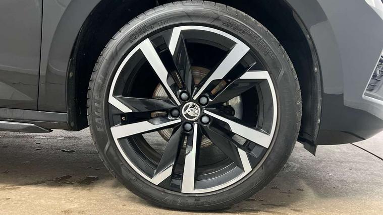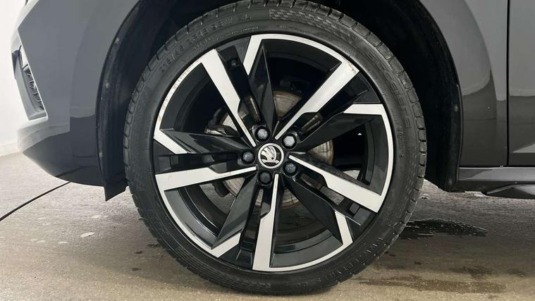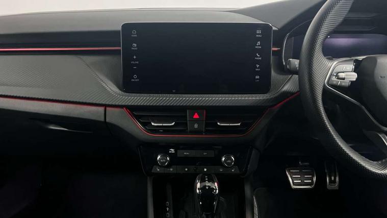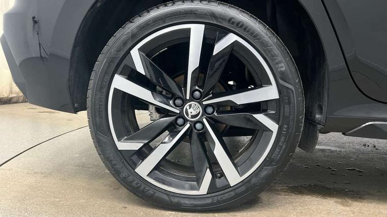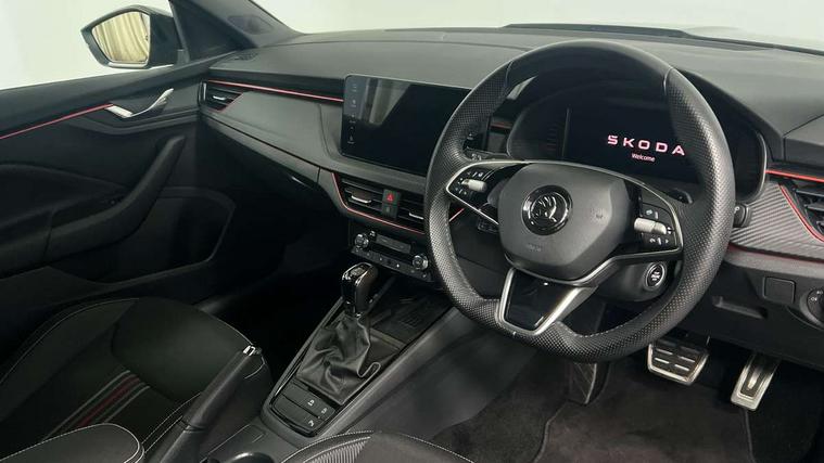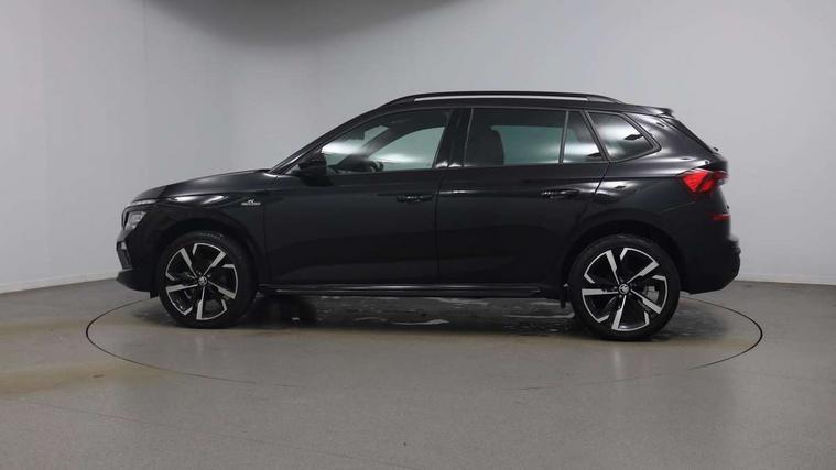 Advanced driver attention and drowsiness monitor, Bluetooth system, E-call, Front assist system, PAS, Rear parking sensors, Rear view camera, Service indicator, Speed limiter, Traffic sign recognition, Virtual cockpit with 10.25" display, Voice control system, Wireless smartlink, 4 USB C ports, 8 Speakers, 9.2" Skoda navigation display, DAB Digital radio, Auto dimming rear view mirror, Automatic headlight control with coming home and leaving home feature, Black door mirrors, Black radiator grille, Black rear diffuser, Black roof spoiler, Body colour bumpers, Body colour door handles, Boot lettering in black, Extended tailgate glass, Fixed panoramic sunroof with black roof rails, Front and rear electric windows, Heated rear window, LED daytime running lights, LED high beam, LED low beam, LED third brake light, Light sensors, Monte carlo plaque, Privacy glass, Rear side wing doors, Rear wiper, Ticket holder inside windscreen, 12V socket in luggage compartment, 3 seat bench in 2nd row, Aluminium pedals, Ambient lighting in white/red, Art leather carbon decor inserts, Art leather carbon door inserts, Black roof lining, Cargo elements, Chrome inner door handles, Driver and passenger sun visors with vanity mirror, Dual zone climate control, Front and rear roof lights, Front centre armrest, Front head restraints, Glove compartment with illumination, Height adjustable driver seat, Height adjustable front passenger seat, Ice scraper, Inner circulation control with pollen filter, ISOFIX on front passenger seat, Isofix preparation for back seats, Leather gearknob and handbrake lever, Manual lumbar support for front seats, Monte Carlo cloth upholstery, Net package and top tether hooks in boot space, Net under rear shelf, Pocket on the back of both front seats include mobile phone pockets, Rake/reach adjustable steering wheel, Reading lights, Rear centre armrests, Red hotstamping, Single front passenger seat, Sports seats, Textile floor mats, Third rear headrest, Top tether for front passenger seat, Umbrella in driver's door, Light and view plus package - Kamiq, 3x3 point rear seatbelts, Airbags - driver and front passenger, Disc brakes, ESP, Extended and predictive pedestrian/cyclist protection, Front passenger airbag deactivation switch, Front side airbags with curtain airbags, Hill hold control, Manual leather parking brake, Manual rear child locks, One tone horn, Seatbelt reminder for driver an co-driver, Traction control, Tyre pressure monitor, Anti-theft alarm system with interior monitoring, backup horn, towing protection and remote central locking with SAFE system, Anti-theft wheel bolts, Electronic engine immobilizer, 18" Ursa black diamond cut alloy wheels,