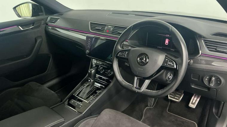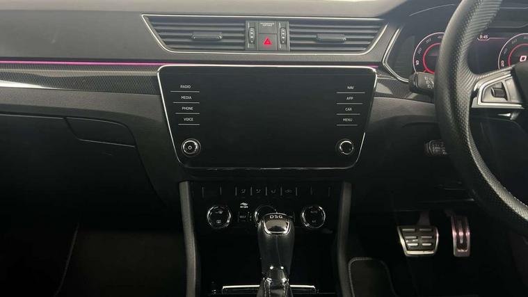 Adaptive cruise control, Bluetooth system, CareConnect and Emergency Call, Drive mode selection including HMI sport, Driver fatigue sensor, Electromechanical power steering, External temperature gauge, Front assist including automatic braking function, Multifunction colour trip computer, Remote fuel cap release, Service interval indicator, Speed warning indicator, Stop/start engine system and energy recovery, Voice control system, XDS+, In-car voice enhancement, Aero wiper + intermittent function, Auto dimming rear view mirror, Bi-Xenon headlights with AFS + integrated headlight washers + LED daytime running lights, Black gloss door mirror housings, Body colour bumpers, Body colour door handles, Cornering front fog lights, Electrically adjustable/heated/folding door mirrors with puddle lights/Integrated indicators and memory function, Front and rear electric windows, Fuel filler cap, Gloss black exterior door mirrors with sports styling including front grill, side strip and window surrounds, Gloss black roof rails, LED brake lights, Privacy glass, Rain sensor, Rear exhaust diffuser styling elements, Rear wiper, Sportline badging, 12v power point in centre console, 12V power point in luggage area, 3 rear height adjustable headrests, Alcantara/leather upholstery sports seats, Auxiliary heater, Black door trim, Black roof headlining, Electrically adjustable driver's seat with memory and lumbar support, Front armrest with storage box, Front passenger seat electric height adjust, Height adjustable front and rear head restraints, Height/reach adjust steering wheel, Illuminated air conditioned glovebox, Illuminated luggage compartment, Interior lights with control switches, Isofix child seat fittings on outer rear seats, Leather gearknob and handbrake lever, Overhead glasses storage compartment, Rear centre armrest with cupholders, Removable LED light in boot, Split folding rear seats, Textile floor mat set, Ticket holder, Umbrella compartments in front doors with umbrellas, LED interior light pack - Superb, LED package plus - Superb, LED rear pack - superb, 3 point height adj front seatbelts + pretensioners, 3 rear 3 point seatbelts + pretensioners, 7 airbags - Front, front side, curtain, driver's knee airbag with front passenger deactivation switch, Door open warning, Driver and passenger seatbelts with warning light, Electronic parking brake, ESC including ABS, EBV, MSR, ASR, EDS, HBA, DSR, RBS, CBC, multi-collision brake (MKB) and Auto hold, Hill start assist, Rear door child safety locks, Tyre pressure monitor, Alarm with interior monitoring tilt sensor and back up horn, Electronic engine immobiliser, Keyless entry and start/stop, Remote central locking with SAFE system, Carbon interior trim, 19" Vega alloy wheels with anti theft wheel bolts,