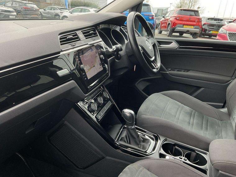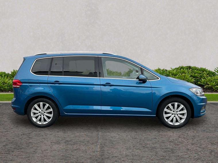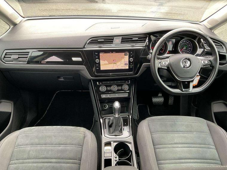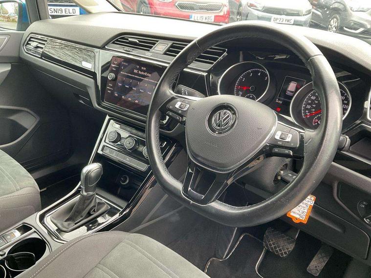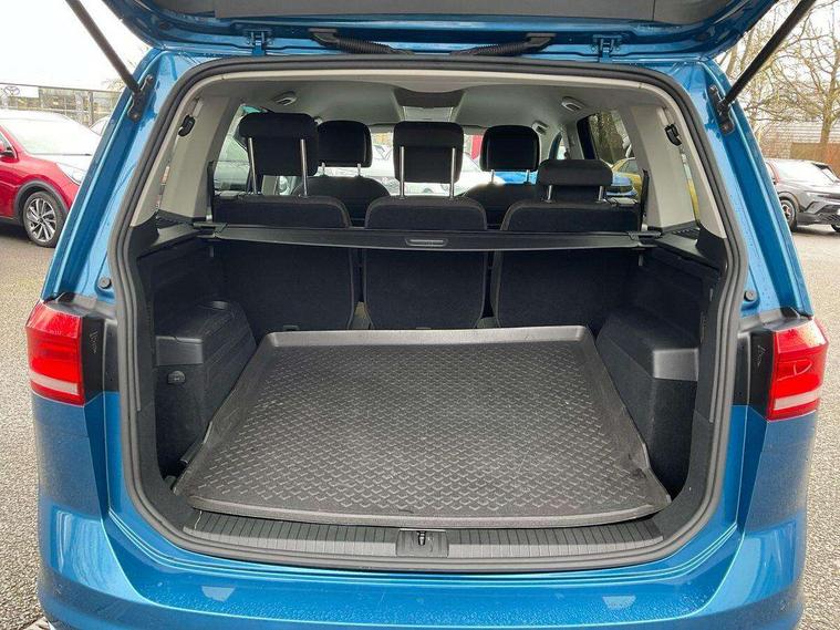 Adaptive cruise control, Audible lights on warning, Car information display, Driver alert system, Driver electronic voice amplification function, Electronic odometer, External temperature gauge, Flat tyre indicator, Front and rear parking sensors, Mobile pairing with SMS function, Multi function computer, Multifunction colour display, Rev counter with fuel gauge, Speed limiter, Speed sensitive power steering, Stop/start system, Think blue trainer driver tips and journey analysis, Trip and service interval display, Petrol Particulate Filter, XDS electronic differential lock, 4x20 watt output, 8 Speakers, Audio Connectivity System, DAB Digital radio, MP3/WMA compatability, Multi device interface, SD card slot, Title and cover art display, Aerial integrated into side window, Body colour bumpers, Body colour door handles, Body colour door mirrors with integral indicators, Chrome fog light surround, Chrome lower front bumper insert, Chrome trimmed front air intake surrounds, Chrome trimmed radiator grille louvre inserts, Chrome trimmed side windows, Daytime running lights, Dusk sensor + auto driving lights, Electric heated + adjustable door mirrors, Front and rear electric windows, Front fog lights with static cornering function, Fully galvanised body, Gloss black finish B pillar, Green tinted heat insulating glass, High level third brake light, Range adjustable headlights, Rear tinted glass from B-pillar backwards approx 65% tinted, Rear wash/wipe with intermittent wipe setting, Silver roof rails, Tailgate wiper- reverse gear activation, Twin chrome exhaust tailpipes, Windscreen wipers intermittent wipe, 12V power point for Row 2, 12V socket in luggage compartment, 2 individual fold flat 3rd row seats, 2 three point seatbelts in 3rd row, 2nd row centre armrest, 2nd row centre seat converts into table, 3 single slide/fold/removable 2nd row seats, 3 spoke steering wheel, 3 Zone electronic climate control with automatic air recirculation, 3x3 point seatbelts on 2nd row with height adjust on outer seats, 4 boot load lashing points, 4 way adjustable front head restraints, 4 way driver/front passenger adjustable head restraints, 5 headrests, Ambient lighting in door trim, Driver and front passenger under seat drawer, Dust/pollen filters, Foldable front passenger seat backrest, Front + rear carpet mats, Front and rear reading lights, Front centre armrest with storage compartment, Front cupholders x 2, Front passenger seat height adjust, Front seat storage pockets, Front seatback folding tables, Height adjustable driver's seat, Height/reach adjust steering wheel, Illuminated glovebox, Illuminated vanity mirrors, Instrument lighting white adjustable panel illumination with red night time illumination, Interior light with delay, Isofix on 3rd row seats, Leatherette on rear of front seats, Low tunnel 2nd row seat, Luggage compartment lighting, Media box in dashboard on passenger side, Multi storage in passenger/luggage areas, Multi-function centre console with storage facilities, Retractable luggage cover, Split folding rear seat backrests, Storage bins on all doors, Storage in roof console, Convenience Pack - Touran, Mirror pack - Touran, 3 point height adjustable front seatbelts, Auto hold function, Automatic post collision braking system, Door open warning reflectors, Driver/Front Passenger airbags, Drivers knee airbag, EDL + ASR, Electronic parking brake, Energy recovery system, ESC with ABS, First aid kit, Front and rear (row 2) curtain airbags, Front assist including city emergency braking, Front seat side impact airbags, Front/rear disc brakes, Hill hold control, Hydraulic Brake Assist (HBA), Loose wheel warning function, Manual passenger airbag deactivation function, Pre crash preventive occupant protection, Seatbelt warning lamp and buzzer, Traction control, Two tone horn, Warning triangle, Alarm with remote central locking and interior protection, Electronic engine immobiliser, Chrome plated instrument surrounds, Piano black decorative inserts,