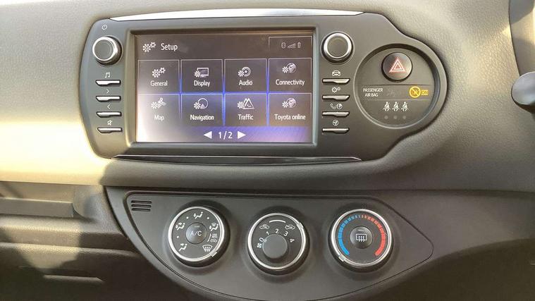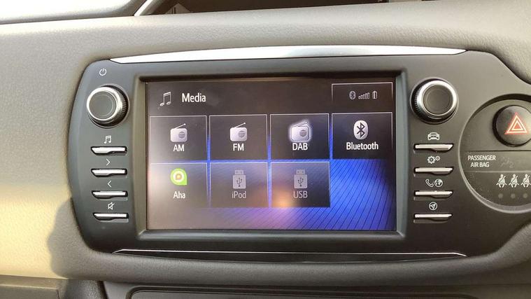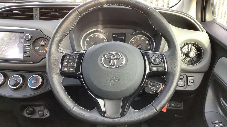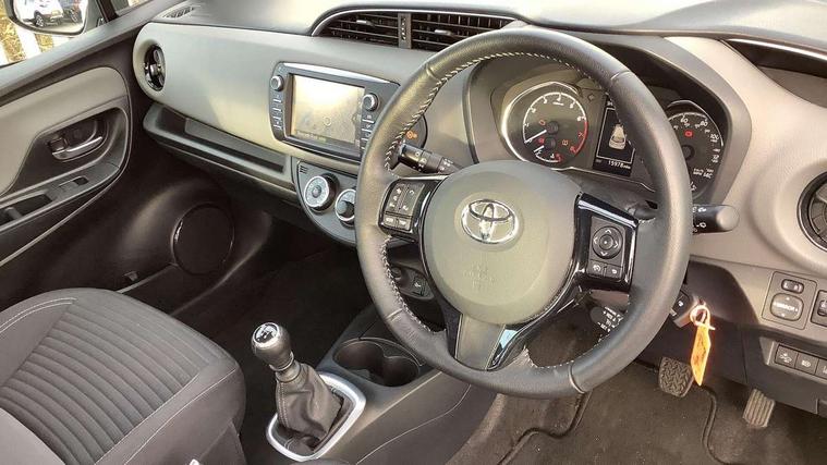 Instrument panel in grey, Space saver spare wheel, Engine immobiliser, Remote central locking, 6 speakers, Auxiliary input socket, DAB Digital radio, Steering wheel mounted audio/telephone controls, Touch 2 touchscreen Radio with iPod connectivity, USB connection, 3 point seatbelts on all rear seats, ABS+EBD+Brake assist, Active headrests, Collision mitigation braking system, Curtain airbags, Driver and passenger airbags, Drivers knee airbag, Emergency brake light system (EBS), Front passenger airbag on/off switch, Front seatbelt reminder, Front side airbags, Height adjustable front seatbelts with pre-tensioners and load limiters, Hill start assist control (HAC), Passenger airbag deactivate switch, Rear child proof door locks, Rear seat belt reminder, Road sign information display, Seatbelt warning lamp and buzzer, Toyota safety sense including Road sign assist, Pre collision system, auto high beam and lane departure alert), Tyre pressure monitoring system, Vehicle stability control VSC + traction control, 2 speed front wipers + intermittent wipe, Auto high beam, Auto up and down function on drivers window, Body colour bumpers, Body colour door handles, Body coloured door mirrors, Chrome fog light surround, Daytime running lights, Door mirror integrated indicators, Drivers window one touch up/down, Electric adjustable heated door mirrors, Electric front windows, Follow me home headlights, Front fog lights, Green tinted glass, Heated rear windscreen, Projector headlights, Rain sensitive windscreen wipers, Rear wiper, Turning signal integrated indicators in door mirrors, 3 spoke leather steering wheel, 60/40 split folding rear seat, Boot light, Cloth upholstery, Driver seat height adjust, Driver/passenger vanity mirrors with covers, Front cupholders x 2, Front map reading lights, Front seats with lumbar support, Glovebox, Height adjustable front head restraints, Height adjustable rear seat head restraints (x3), Isofix system on outer rear seats, Leather gear knob, Manual air conditioning, Rear cupholder, Removable rear parcel shelf, Sliding front seats, Tilt/telescopic steering column, Bluetooth system, Cruise control, External temperature gauge, Fuel indicator with low level warning, Lane departure warning system, Lights on warning, Multi-information display, Power Steering, Rear parking sensor, Rear view camera, Road sign assist - RSA, TFT display screen, Touch 2 Go navigation system, Trip computer,