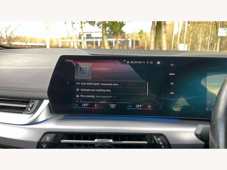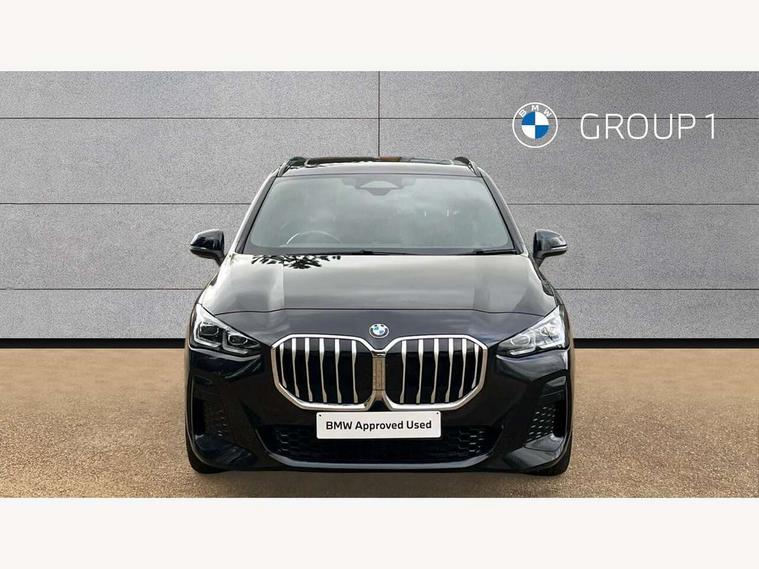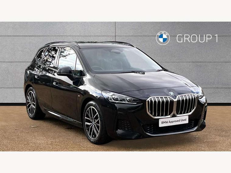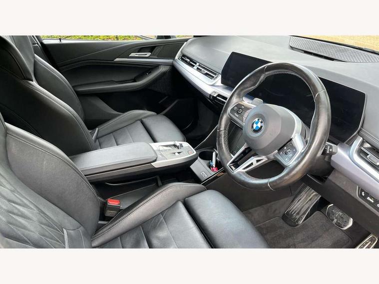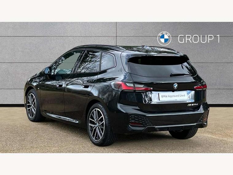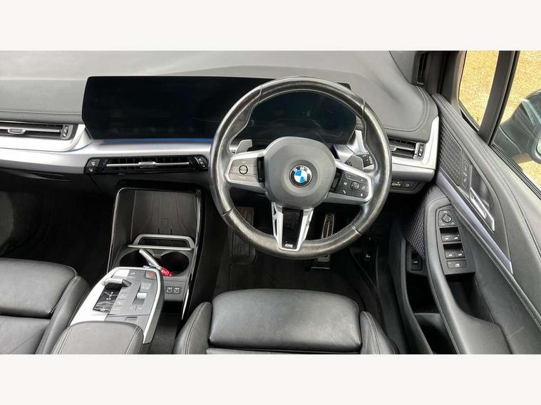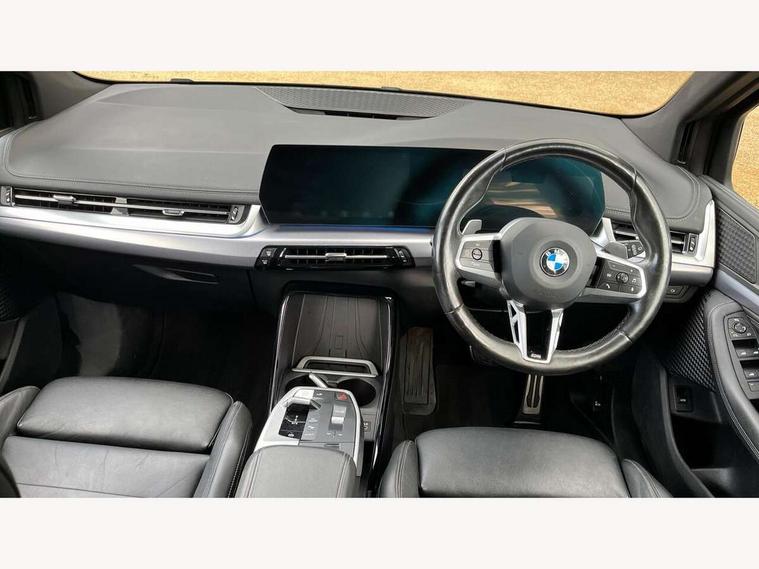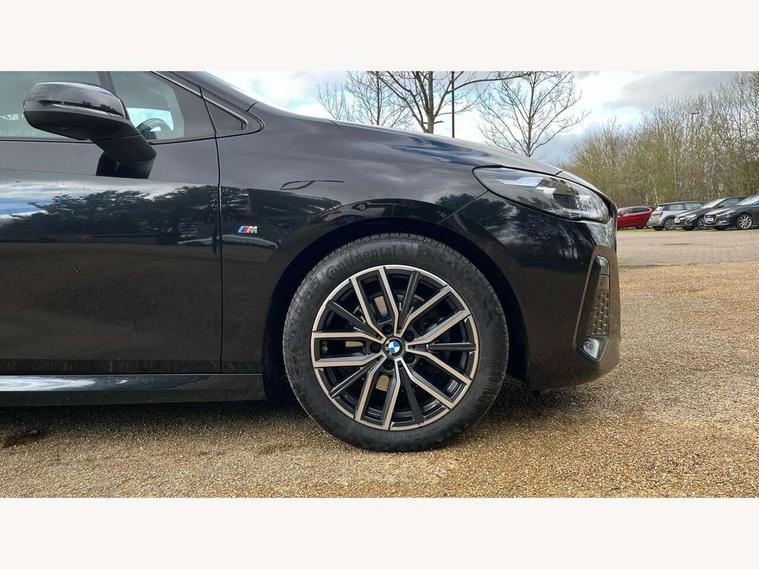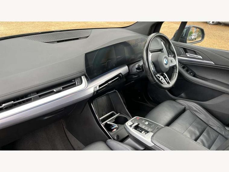Active Guard incl speed limiting and lane departure functions with auto steering, and front collision warning with brake intervention, Automatic powered tailgate, Automatic start/stop function, BMW Online services, BMW Teleservices, Brake pad wear indicator in front and rear, Condition based service, Drive off assistant, Flat air vents on instrument panel in high gloss black, adjustable slats with elements in pearl chrome, iDrive controller, Language version English, On board computer - average speed+fuel consumption, service interval, clock/date, odometer/trip meter, outside temperature display and ice warning, Parking assistant with active park distance control, reversing assistant, lateral parking aid and rear view camera, Servotronic variable electric power steering (EPS), Smartphone integration, Widescreen display, Diesel particulate filter, Diesel with SCR emission control system, Drive performance control with ECO PRO comfort + sport mode, Gear selector switch with toggle operation, M Adaptive suspension, Steptronic sport transmission with double clutch and gear shift paddles, 2x USB Type C ports in front centre console for charging and data transfer, 2x USB Type C ports in rear centre console for charging, DAB Digital radio, Welcome sound upon opening of the front driver or passenger door, Air inlet middle part on front apron in lines specific design with trim strip in satinised aluminium, Automatic headlights, BMW emblem, engine compartment lid and tailgate, Body colour roof mouldings, Body coloured door mirror caps, Contoured rear roof spoiler in vehicle colour with side aeroblades in black high-gloss, Driver side exterior mirror lighting with BMW logo projection, Dynamic brake lights, Electric adjustable heated door mirrors, Electric windows - front and rear, with open/close fingertip control, anti-trap facility and comfort closing, Folding door handles integrated flush with surface, Front and rear windscreen wipers with heated front washer nozzles, Front bumper cover with independent design in body colour with inserts in black high gloss, Front bumper design elements in satinised aluminium, Front door exit lights, Front door sill finishers aluminium inserts with M inscription, Front entry sills with aluminium inserts + BMW inscription, Front oramental grille with radiator grille bars in satinised aluminium, Heated rear window, Hidden exhaust pipe, High gloss shadow line, High gloss shadowline roof rails, Key with M identification, LED Daytime running lights and parking lights with turn indicators, LED number plate light, LED third brake light in rear spoiler, M identification on sides, Manual headlight range control, Model inscription on right tailgate, Rain sensor, Rear bumper cover with independent design in body colour with inserts in black high gloss, Rear bumper trim strip in satinised aluminium, Rear side wing doors, Shark fin antenna, Side sill covers with independent design in Body colour, Trailer stabilisation logic, Trims on front and rear bumper covers colour-coordinated with side window graphic, Visible VIN plate, Welcome lighting, Window washer nozzle for rear view camera, 12V socket in right side trim panel, 2 bag hooks in luggage compartment, 2 front reading lights, 2 open cup holders in front centre console, 2x 12V power socket in luggage compartment and front centre console, 3 seat bench in 2nd row, 40:20:40 split folding rear seat backrests, Ambient lighting front and rear, Automatic two zone climate control air conditioning, Bottle trays in all doors, Child seat ISOFIX attachment for two outer rear seats and front passenger seat with anchorage points, Driver and front passenger sports seats, Four grab handles integrated in roof lining, Front and rear door pockets, Front and rear footwell lighting, Front and rear side armrest integrated into door trim, Front centre console storage compartment, Front head restraints, Glovebox with light, Heated front seats, Height adjustable 3 rear head restraints, Interior door handle recess light on all doors, Luggage compartment lighting, M Anthracite headlining, M specific floor mats, M sport leather steering wheel, Map pockets, Mechanical rear seats with fore/aft adjustment, Multi-function controls for steering wheel, One piece parcel shelf opens together with tailgate and removable, Rear cloth hooks, Single front passenger seat, Sliding rear seat bench, Stainless steel pedals, Steering wheel column manual adjustment, Storage compartment lighting in centre console and storage tray in centre stack, Storage compartment net in left side trim panel, Storage compartment with folding cover under centre console armrest cushion, Storage tray in right side trim panel, Sunvisors with illuminated vanity mirrors, Three spoke sport leather steering wheel, Connected pack professional - 2 Series Active Tourer, Technology pack - 2 Series Active Tourer - MY22, 3 point seatbelts on all seats, front pyrotechnic belt tensioners, stopper and belt force limiters, rear coded belt buckles, Airbag - Front driver and passenger, front and rear head, front side, curtain head protection, manual deactivation of front passenger airbag possible, Anti lock braking system (ABS) with brake assist, Automatic hold function, BMW emergency call, Brake drying, Braking readiness, Child proof locking system in rear door, Cornering brake control, Crash Sensor - activates hazard/interior lighting + unlocks doors, DSC - Dynamic Stability Control, Dynamic brake control, Dynamic Traction Control - DTC, Electromechanical parking brake, Energy recovery system, Front disc brakes, Integrated braking system, PC iBrake PostCrash approach control warning with light braking function, Rear disc brakes, Tyre pressure monitoring system, Warning triangle and first aid kit, Anti theft alarm system, Closing system with central locking, Engine immobiliser, Locking wheel bolts, Front centre console trim in high gloss black with my mode expressive, Reduced rolling resistance tyres,