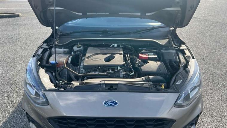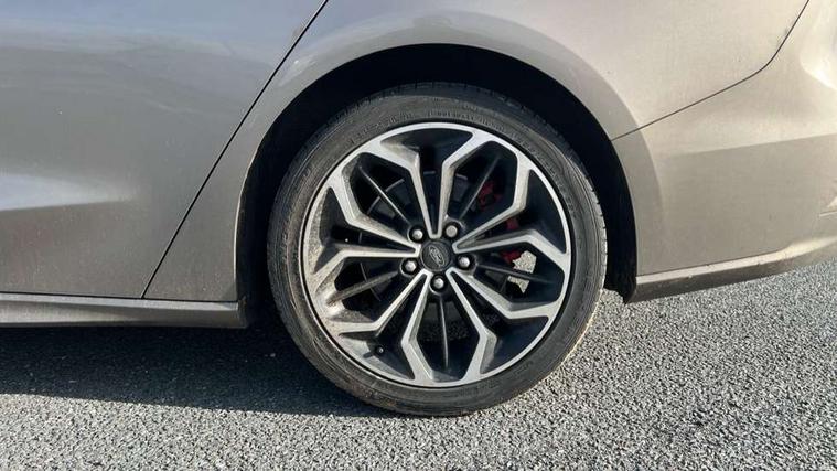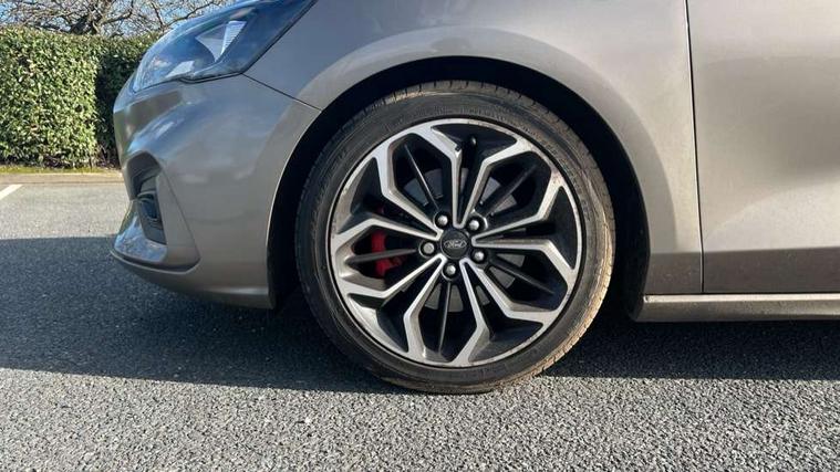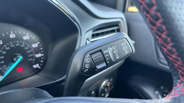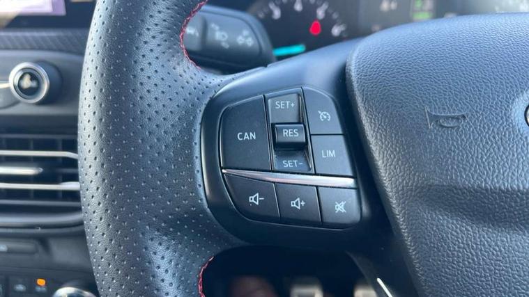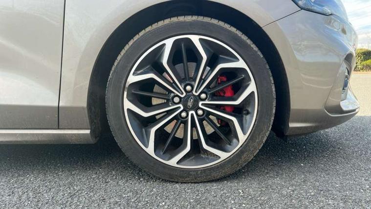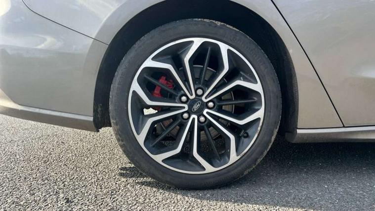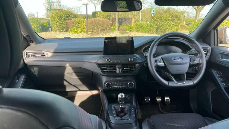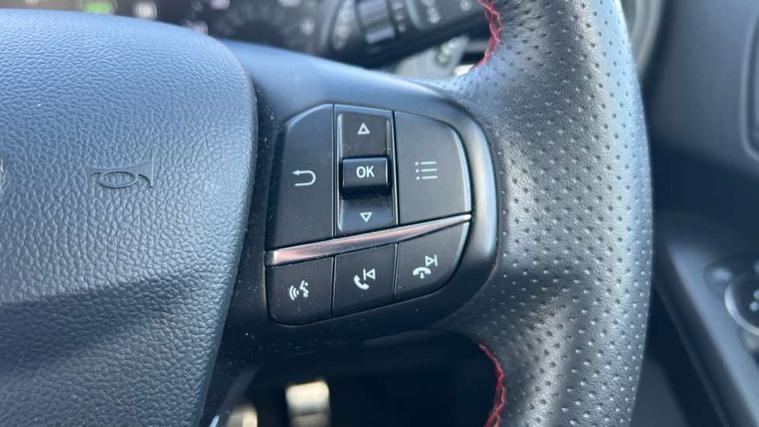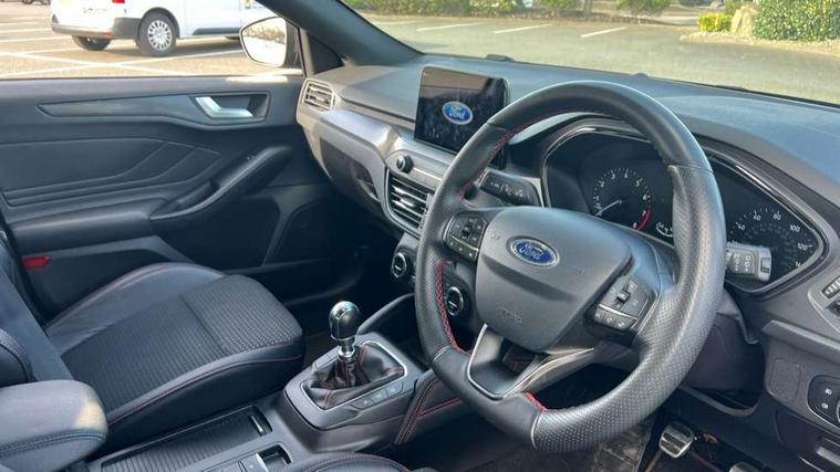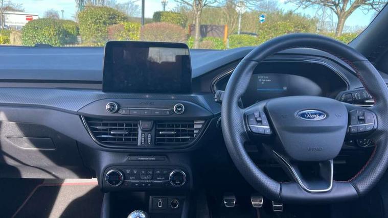 4" TFT coloured cluster screen, Bluetooth system, Digital clock, Easy fuel capless refuelling system, Eco mode, Ford pass connect, Ford SYNC 3 nav system with DAB radio, 8" colour touch screen, voice control, app link, Apple car play/Android auto and 4.2" TFT coloured cluster, Lane keeping aid with lane departure warning, PAS, Selectable drive mode, Trip computer, Sports tuned suspension, 2 USB ports, Aux input, 'Quickclear' heated windscreen/heated washer jets, Auto dimming rear view mirror, Auto headlamps (on/off), Automatic rain sensing wipers, Body colour large rear spoiler, Body colour side skirt, Body coloured bumpers, Body coloured door handles, Body coloured electrically operated and heated door mirrors with side indicators, Electrically operated front and rear windows with one touch opening and closing, Front variable intermittent wipers with electric wash, Heated rear window, LED daytime running lamp, LED front fog lamps with cornering function, Polished twin tailpipe, Power folding door mirrors with puddle lights, Rear privacy glass, Roof rails, ST-Line upper and lower grille with full body styling kit and wing badges, Tailgate wash/wipe, Unique door and instrument panel inserts, 3 spoke flat bottomed leather steering wheel with red stitching, 6 way power adjustable driver seat, 60/40 split back and cushion rear seats with 2 height adjustable headrests, Alloy finish pedals, Aluminium gear knob, Auto fold rear seats, Centre console with armrest, Dark headliner, Dual zone electronic air temperature control, Front and rear floor mats with red stitching, Front passenger seat manual height and lumbar adjust, Heated front seats, Height adjustable front headrests, Isofix child seat preparation, Part leather upholstery with red stitching, Reach + rake adjustable steering column, Rear centre headrest, Red stitching on steering wheel, Soft console knee pads with red stitching, ABS+Electronic Brake force Distribution, Auto hold function, Driver airbag, Electronic parking brake, Electronic stability control, Front and rear seatbelt reminder, Front inertia reel height adjustable seatbelts with pre-tensioners, Front passenger airbag, Front side airbags, Hill start assist, Passenger airbag deactivate switch, Post collision braking, Pre collision assist with autonomous emergency braking and pedestrian/cyclist detection, Red brake calipers, Side curtain airbags, Three rear inertia reel lap/diagonal seatbelts, Tyre pressure monitoring system, MyKey system, Remote central locking & engine immobiliser, Thatcham category 1 alarm, Contrast stitching - Red, 18" 5x2 spoke matt black machined finish alloy wheels, Mini steel spare wheel,