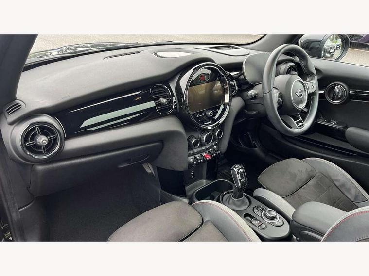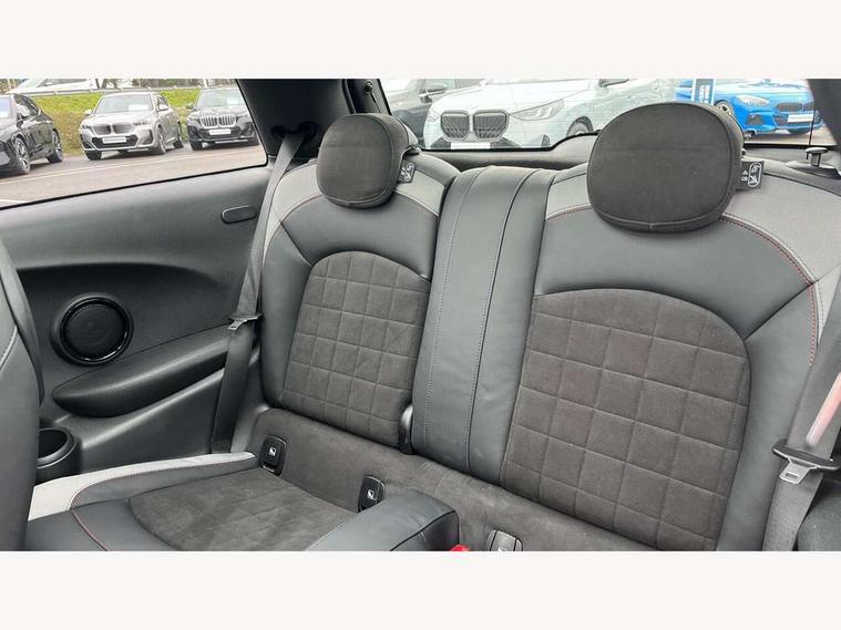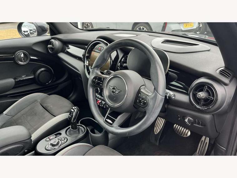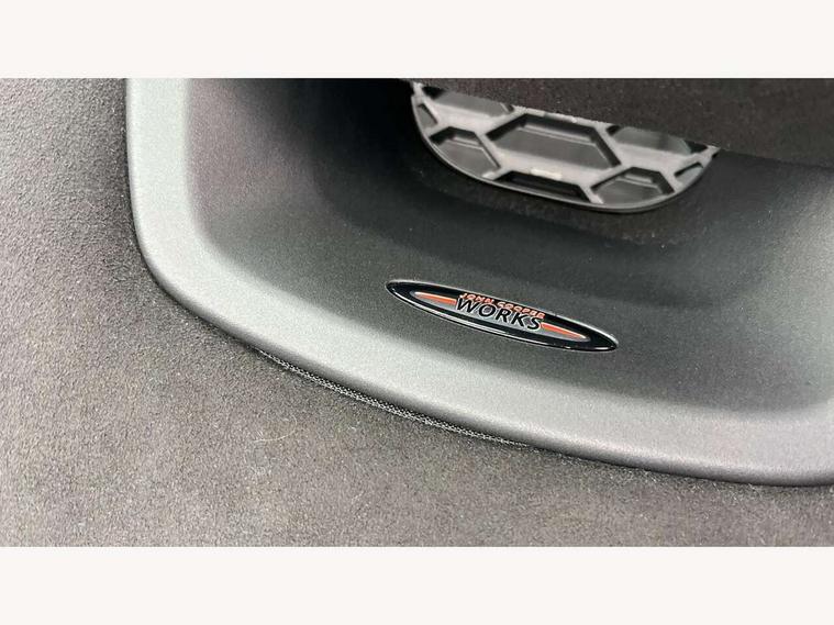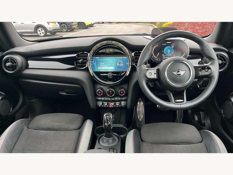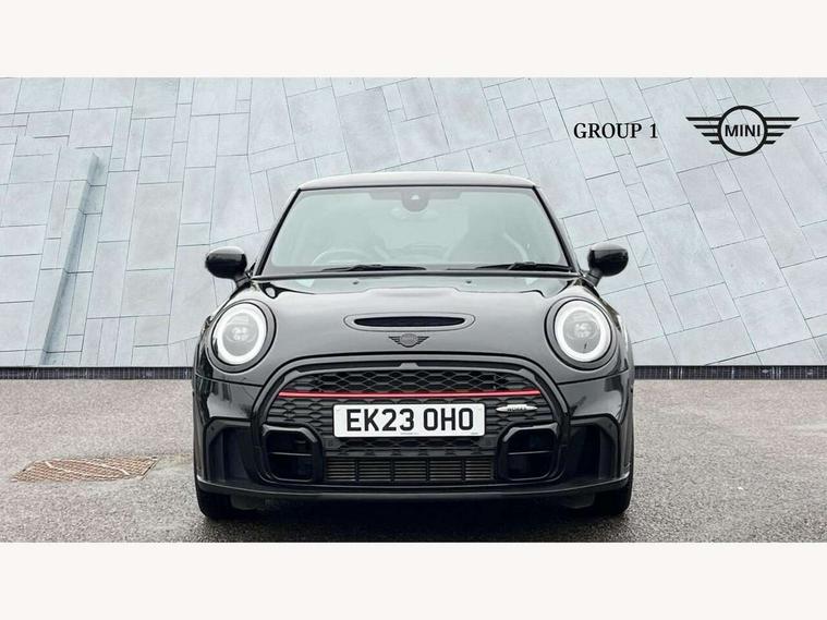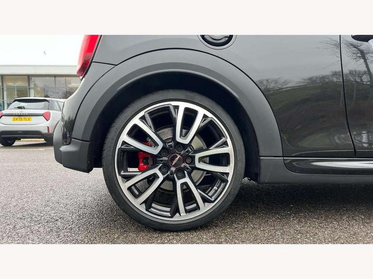 Apple CarPlay, Automatic start/stop function with brake energy recuperation, Compatible mobile phone bluetooth with audio streaming, Cruise control with brake assist, Electro-mechanical speed dependant steering assistance, Flexible car sharing preparation, Instrument cluster, MINI Driving Modes - centre toggle switch to control driving setting (sport, mid and green), Mini E-call, MINI TeleServices, On board computer, Rear park distance control, Service interval indicator, Double Vanos system, Eight speed steptronic sport transmission, with gearshift paddles, Fully variable valve control, High precision injection, Performance Control, 8.8" touchscreen with LED ring, FM tuner and DAB digital radio, 3rd brake light, Automatic headlight activation switch, Bonnet scoop, Dynamic brake lights, Electric front windows, Heated rear window, Heated windscreen washer jets, JCW Aerodynamic kit - Front and rear bumpers with sporty JCW styling and part-painted side sills with MINI John Cooper Works door sill finishers, John Cooper Works logo above an individual grille strut in Chilli Red, John Cooper Works rear spoiler, LED headlight with closed ring and daytime driving lights, Radiator grille piano black border with honeycomb structure in black matt, Rain sensor window wipers, Rear fog lights, Rear LED lights with union jack design, Rear window wiper, Side scuttle panel with integrated indicator, Side scuttle with MINI John Cooper Works logo in black high-gloss with red border, Sun/heat protection glass, Two central exhaust tailpipes with chrome finisher, White indicator lenses, 12V Accessory socket in centre console, 2 seat bench in 2nd row, 4 lashing eyes in luggage compartment, 60/40 split folding rear seat, Anthracite headliner including grab handles and clothes hooks, Carbon black colour line - Knee roll and door armrest, Chrome interior highlights, Cupholders, Front and rear isofix with front passenger airbag deactivation, Front floor mats in velour, Glove compartment, Height and length steering column adjustment, Interior lighting with 12 different colours across the dashboard, underneath door bezel with illuminated laser-engraved design on central display, JCW Sport seats with integrated headrests, adjustable thigh support and John Cooper Works logo, Leatherette gearshift lever and handbrake gaiters, LED reading lights, vanity mirror lights, front foot well light and spotlight on front seats, Manual air conditioning, Mechanical seat adjustment - forward/back & backrest for front seats and driver seat height adjust, Multifunction steering wheel, Passenger seat height adjuster, Rubberised stainless steel pedals, Single front passenger seat, Storage compartments in doors, Storage pocket on back of front seats, Sunvisors with vanity mirrors, Walknappa leather steering wheel with grey seam and John Cooper Works badge on Piano Black lower steering wheel spoke, Navigation pack without Apple Carplay - Mini Hatchback, Piano black exterior pack - JCW, 3 point seatbelts on all four seats, 4-piston fixed-calliper brakes front, 6 Airbags - front, side, head and seat belt tensioners, Anti-lock braking system (ABS), DSC - Dynamic Stability Control, Front and rear disc brakes, Red brake callipers with John Cooper Works logo, Single tone fanfare horn, Tyre pressure monitoring system, Alarm system with tilt sensor, monitoring doors, bonnet interior and tailgate, Electronic vehicle immobiliser, Start/stop toggle with keyless go, Tool kit,