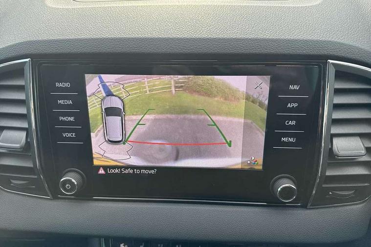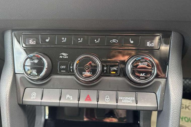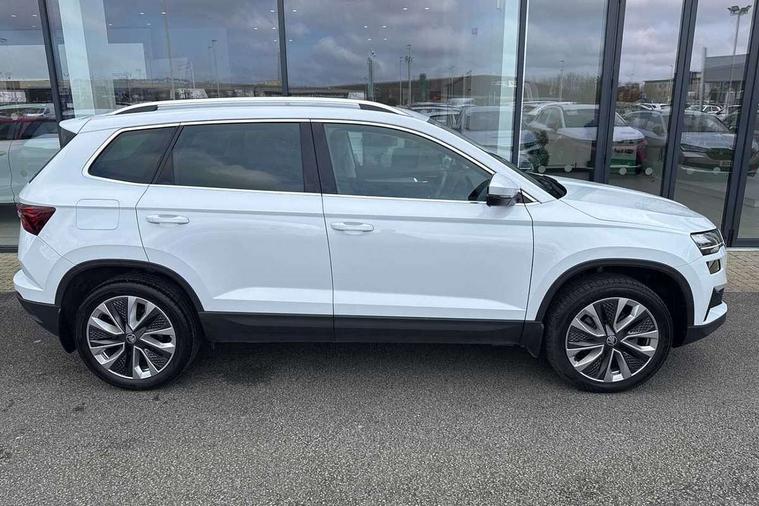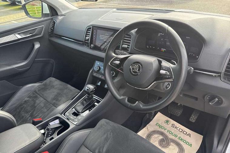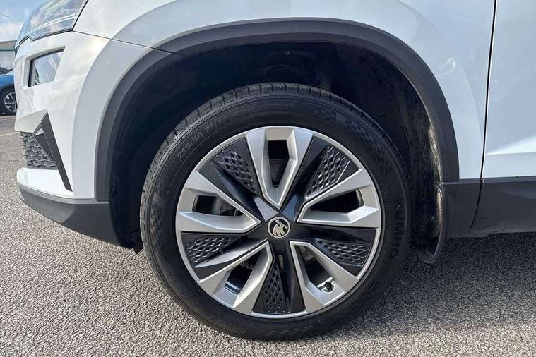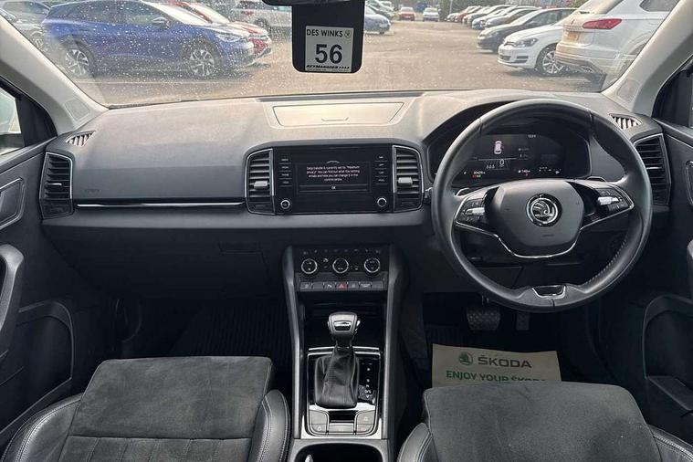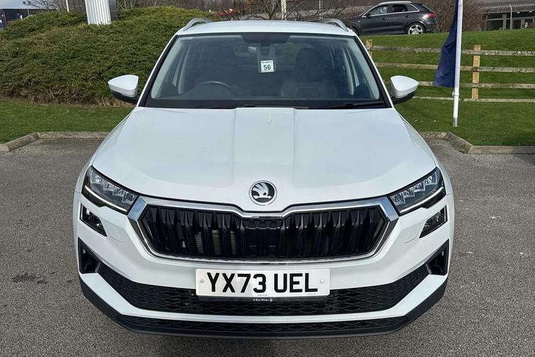 8" Digital display, Care connect, Driver fatigue sensor, Emergency services call system, Outside temperature gauge, Service interval indicator, SmartLink wireless for Apple and wired for Android, Start/stop system with regenerative braking, USB C Port x 2 in front centre console, 8 Speakers, DAB radio with Bluetooth, USB connection, Acoustic glass, Aero front windscreen wipers with intermittent function, Auto dimming rear view mirror with light and rain sensors, Black electric window control buttons, Body colour door mirrors and handles, Dynamic headlight range control with cornering light function, Electric front and rear windows with child proof lock, Heated rear windscreen, LED daytime running lights, LED rear lights with high functionality welcome effect and dynamic indicators, Light assistant (coming/leaving home/tunnel light), Plastic scuff plates, Privacy glass, Rear side wing doors, Rear spoiler, Rear window wiper with washer system and intermittent control, Safety reflectors on front doors, 1.5 litre bottle holders in driver and front passenger door panels, 12V socket in boot, 12v socket in front centre armrest with storage compartment and rear air vents, 2 spoke leather heated multifunction steering wheel with DSG paddles, 2 x Tablet holder, 3 rear height adjustable headrests, 3 seat bench in 2nd row, 4 foldable roof handles with rear coat hooks, Black floor carpet, Chrome inner door handles, Double sided boot floor, Foldable hooks in the boot, Front head restraints, Height adjustable front three point seats belts with tensioners, Height/reach adjust steering wheel, Ice scraper, Illuminated glovebox, Illuminated luggage compartment, Isofix child seat preparation for front passenger seat, Isofix child seat preparation outer rear, Manual lumbar support for front seats, Pen holder, Pollen filter, Rear boot cover, Rear reading lights, Rubbish bin door, Safety vest holder, Single front passenger seat, Storage box in upper central dashboard closed, Sunvisors with illuminated vanity mirrors, Textile floor mats, Ticket holder, VarioFlex seats with standard rear seat release, Boot pack - Karoq, Design Pack - Karoq, Parking pack - Karoq, Automatic door unlocking in case of crash, Automatic fuel cut off in case of crash, Child locks on rear doors, Driver airbag, Electronic parking brake with auto hold function, Emergency rear braking signal, ESC including ABS, MSR, ASR, EDS, HBA, DSR, RBS, MKB and traction control, Front side airbags, Hill hold control, Knee airbags, Passenger airbag with switch-off function, Pedestrian monitor, Seatbelt reminder signalisation and pretensioner for all seats, Three point seatbelts rear, Two tone horn, Tyre pressure display, Tyre pressure monitor, Alarm with interior monitoring, back up horn and tilt sensor with safe function, Electronic engine immobiliser, Keyless entry and start/stop, Remote central locking with 2 remote folding keys, Chrome framed air vents, 18" Miran alloy wheels in black, Anti-theft wheel bolts protection, Tool kit,