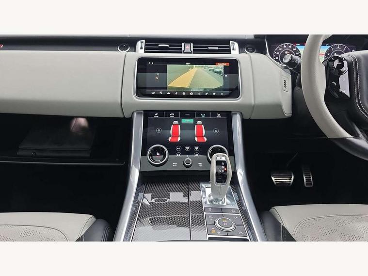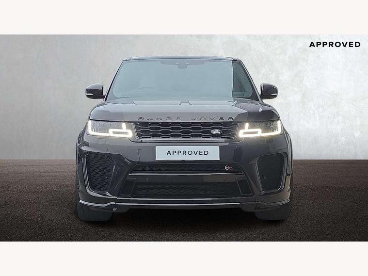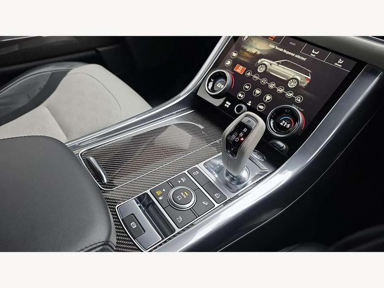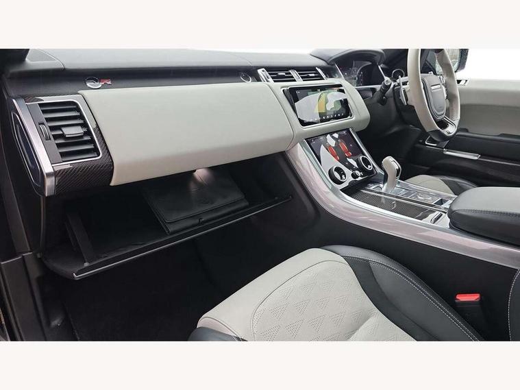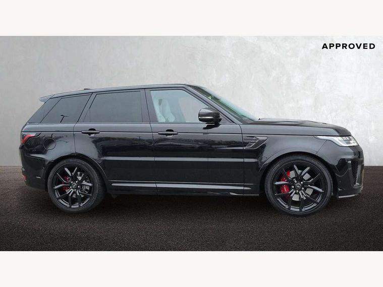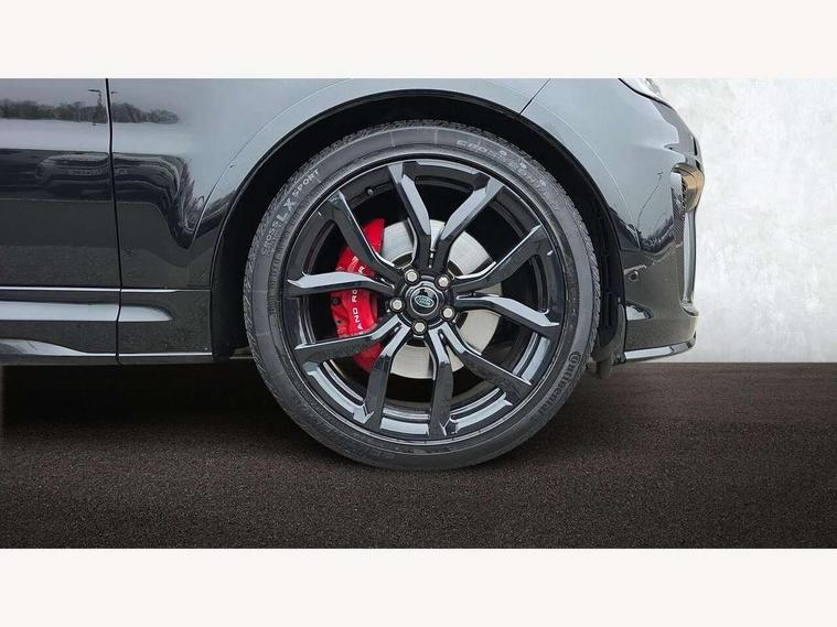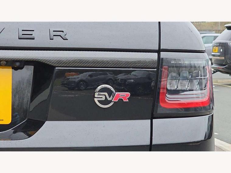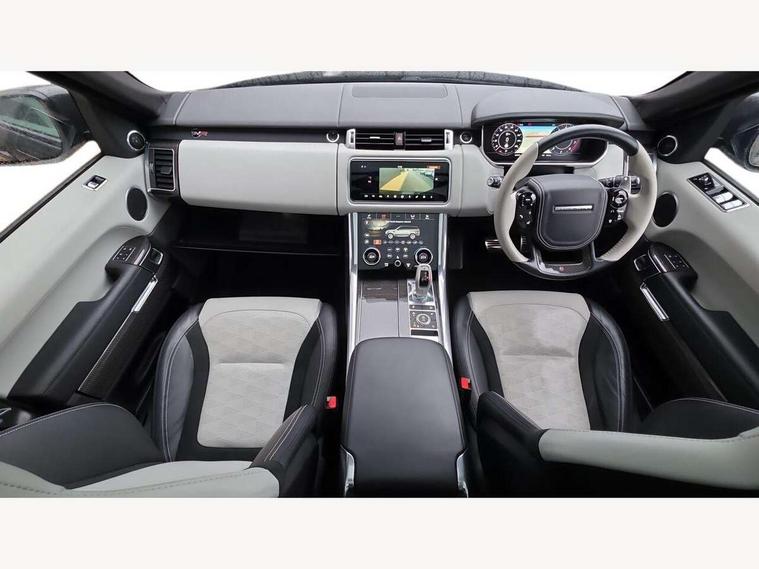 360 Parking aid, All Terrain Info Centre, Android Auto, Apple car play, Bluetooth connectivity, Clear exit monitor, Driver condition monitor, Electric power assisted steering (EPAS), Incontrol apps in vehicle touchscreen, Interactive Driver display instrument cluster, Mist sensor, Navigation pro system with 10" touch screen, app interface and media storage, Powered gesture tailgate/boot lid, Pro services and wifi hotspot, Push button start, Rear traffic monitor, Remote premium - Upgraded Incontrol remote app including remote climate control (engine dependent), remote lock + Unlock and remote beep + flash, Touch pro duo system, Traffic sign recognition with adaptive speed limiter, Trip computer, Adaptive dynamics, All terrain progress control, Carbon fibre engine covers with SVR logo, Configurable dynamics, Electronic active differential with brake torque vectoring, Gradient release control (GRC), SVR sports suspension with dynamic response (active roll control), Terrain Response 2 with dynamic program, Twin speed transfer box, Bluetooth audio streaming, DAB Radio (Digital Audio Broadcasting), Incontrol protect - SOS emergency call with automatic collision detection, optimised assistance call and Incontrol remote app essential, USB/aux input socket, Acoustic front and toughened rear side glass, Acoustic laminated front windows, Active exhaust system with integrated exhaust mounted quad tailpipes, Adaptive brake lights, Auto dimming interior rear view mirror, Automatic headlights, Body coloured side sills and bumpers corners, Centre high mounted stop light, Electric windows with one touch open/close and anti trap, Electrical towing preparation, Follow me home lighting, Front and rear recovery eyes, Headlight power wash, Heated rear window, Heated windscreen includes heated washer jets, Illuminated metal treadplates with brand name script, LED rear lamps, Power fold, auto-dimming, heated door mirrors with memory and approach lights, Rain sensing windscreen wipers, Rear fog lights, Rear side wing doors, Rear wash/wipe, Remote window closing, Side repeater indicators in mirror, SVR badge, SVR exterior styling, Switchable sports exhaust, Trailer stability assist, Unique light weight exhaust system, 16 way driver/passenger electrically adjustable SVR performance seats with memory, 2 way rear head restraints, 3 seat bench in 2nd row, 4 way lumbar support with memory function, 60/40 split folding rear seat, Aluminium gear shift paddles, Auto air recirculation, Bright metal foot pedals, Centre console with armrest, Climate control memory, Configurable Ambient interior lighting, Customer configurable single point entry, Driver's footrest, Extended leather upgrade includes door top rolls and leather instrument panel mid section, Front and rear cupholders, Front and rear premium carpet mats, Front door storage space, Front map lights, Front seat back map pockets, Front stowage pocket, Front/rear passenger grab handles, Heated steering wheel, Integrated front head restraints, Isofix child seat preparation, Loadspace light, Loadspace mounting provisions, Lockable glovebox, Multifunction steering wheel, Pollen filter, Power socket, Reach/rake electric adjustable steering column + entry/exit tilt away, Rear centre armrest, Rear ISOFIX, Roller blind loadspace cover, Single front passenger seat, Sports pedals, SVR leather steering wheel, SVR Performance seats, Three 12V accessory power outlets, Smartphone pack - Range Rover Sport, SVR Carbon fibre exterior pack with exposed carbon fibre bonnet - Range Rover Sport, 3 point seatbelts on all seats, Anti-lock braking system (ABS), Brake pre-fill technology, Cornering brake control (CBC), Curtain airbags, Customer configurable autolock, DSC - Dynamic Stability Control, Dual stage driver/passenger airbags, EBD - Electronic brakeforce distribution, Electric parking brake, Electronic traction control, Emergency braking includes city, urban AEB and pedestrian, Front seatbelt pretensioners, Gradient acceleration control, Height adjustable front seatbelts, High speed emergency braking, Hill descent control, Hill launch assist, Low traction launch, Passenger seat occupant detector with front airbags, Power operated child locks, Roll stability control, Seatbelt warning, TPMS (Tyre pressure monitoring system), Immobiliser, Intrusion sensor, Keyless entry, Locking wheel nuts, Perimetric and volumetric anti theft alarm, Remote locking, Extended carbon fibre trim finisher, 22" 5 split spoke forged gloss black finish alloy wheels - Style 5083,