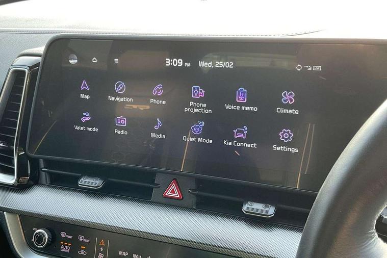 12.3" Driver display screen, 12.3" Touchscreen navigation system, 360 degree around view monitor, Blind spot collision avoidance assist, Blind spot view monitor, Bluetooth connection, Customisable head-up display, Digital key 2.0, Drive mode selector, Driver attention warning, E-call, Emergency stop signalling system, Forward collision avoidance assist 2.0, Front and rear parking sensors, Highway Driving Assist (HDA 2.0), Intelligent speed limit assist, Kia Connect (UVO), Lane Following Assist (LFA), Lane keep assist, Low washer fluid warning, Motor driven power steering, Over the air (OTA) functionality, Parking collision avoidance assist (PCA), Rear cross traffic collision avoidance assist (RCCA), Reversing camera, Safe exit warning (SEW), Smart cruise control with stop and go functionality, Smart power tailgate, Speed limiter, Trip computer, Windscreen washer level indicator, Wireless apple car play/android Auto, Wireless Smartphone charger, DAB Radio with MP3, Front passenger 1x USB-C port, Harman Kardon premium sound system with 8 speakers, Rear passenger 2x USB-C port, Steering wheel mounted audio controls, USB-C port for connection of a media device, Auto dimming rear view mirror, Automatic defog system, Automatic headlight control system, Black and body coloured bumpers, Black window surrounds, Body colour exterior door handles, Body colour radiator upper garnish and door garnish, Dual LED headlights with adaptive driving beam, Electric front and rear windows with front one touch function, Electrically adjustable/heated/folding door mirrors with LED indicators, Front and rear body colour skid plates, Gloss black door mirrors, Gloss black radiator grille, Gloss black wheel arches, Glossy black roof rails, GT-Line exterior styling, Heated rear window, High beam assist, LED daytime running lights, LED front fog lamps, LED High mounted stop light, LED rear lights, Panoramic sunroof with tilting and sliding function with electric blind, Privacy glass in rear windows and tailgate, Rain sensing wipers, Rear fog lamp, Rear roof spoiler, Rear side wing doors, Rear wiper, Satin finished beltline, Trailer stability assist, 12V power socket in front and luggage compartment, 3 seat bench in 2nd row, 3 x passenger assist grips, 40/20/40 split folding rear seat, All-round height adjustable headrests, Alloy pedals, Automatic air conditioning, Black headlining, Centre console storage box, Cupholders in rear armrest, Customisable ambient lighting, Door courtesy lamps, Driver and front passenger sunvisors with illuminated vanity mirrors, Drivers seat power lumbar support, Electric adjustable driver seat with memory function, Electric adjustable front passenger seat, Front and rear door storage, Front seat and rear pockets, Gear shift indicator, Glovebox, GT-Line Interior Styling, Heated front and outer rear seats, Heated steering wheel, ISOFIX Child seat top tethers and anchor fixings outer rear seats, Leather steering wheel, Leather/suede upholstery, LED front cabin light, LED interior personal lamp, LED lighting in overhead console, LED rear reading lights, Luggage area LED light, Luggage area load cover, Luggage area parcel shelf, Luggage board, Luggage compartment under floor storage, Luggage net hooks, Manual adjust steering wheel, Metal paint interior door handles, Paddle shift controls, Rear air conditioning, Rear cabin light, Rear coat hooks, Single front passenger seat, Ventilated front seats, Ventilation ducts to rear compartment, Active front headrests, All round 3-point seatbelts, Anti-lock braking system (ABS), Dual front side airbags, Dual horn, Dynamic brake control, Electronic parking brake with auto hold function, Electronic stability control with downhill brake control, Front passenger airbag cut-off switch, Front seatbelt pretensioners + load limiters, Height adjustable front seatbelts, Hill start assist control (HAC), Impact sensing auto door unlocking, Multi collision brake assist, Rear airbags, Rear door child safety locks, Rear seat alert system, Seatbelt reminder warning, Traction control, Twin curtain airbags, Twin front airbags, Tyre pressure monitoring system, Vehicle stability management, Customisable automatic door locking, Customisable automatic door unlocking, Door deadlocks, Engine Start/Stop Button with Smart Entry System, Locking wheel nuts, Smart key with motion sensor, Speed sensitive auto door locking, Thatcham category 2 security alarm and immobiliser, Visible vehicle identification number, 18" GT-Line alloy wheels, Tyre mobility kit,