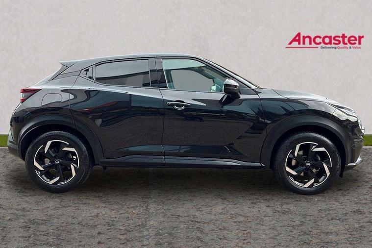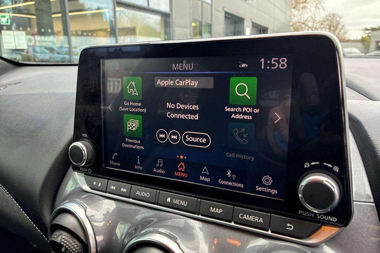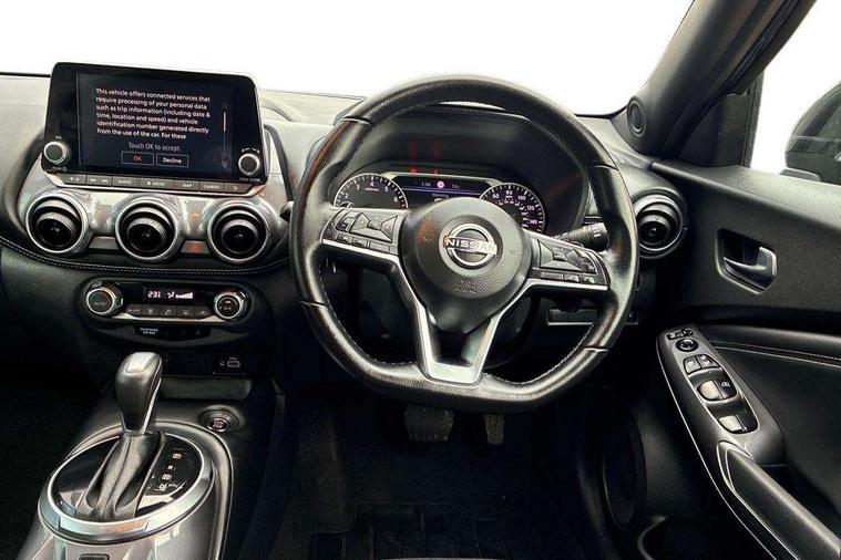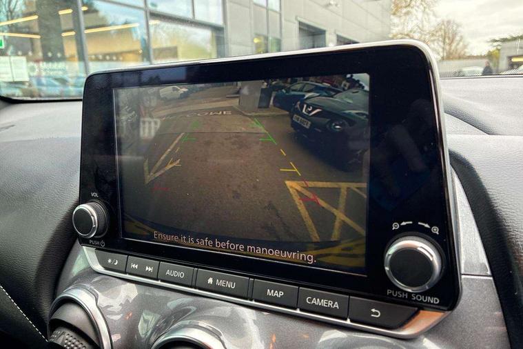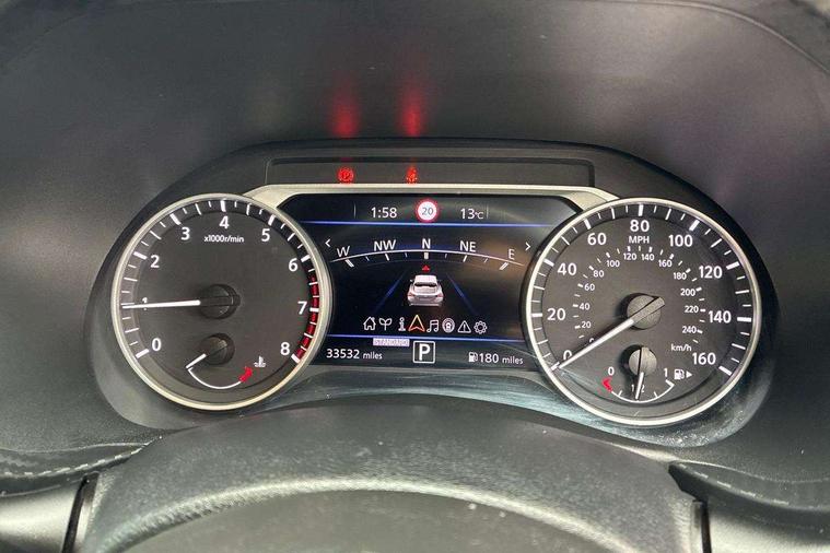 7" full colour TFT screen combimeter, Apple CarPlay and Google Android auto, Drive modes select (Eco, normal and sport), Emergency and breakdown call, Front parking sensor, Idle start/stop system, Intelligent lane intervention, Lane departure warning system, Nissan connect 8" touch screen entertainment system, Nissan connect nav with TomTom traffic, Nissan connect services and Wifi connection, Outside temperature sensor, Power Steering, Rear parking sensor, Traffic sign recognition, Trip computer, Voice recognition, Gasoline particulate filter, 6 speakers, Bluetooth system, USB, Aux-in and 12V socket, DAB Digital radio, Rear console USB port, Auto dimming interior rear view mirror, Auto headlights, Automatic hazard signal with emergency stop signal, Body colour bumpers, Body colour door handles, Electrically adjustable door mirrors with integrated indicators, Follow me home headlights, Front and rear electric window with one touch driver window, Heated and auto folding door mirrors, High beam assist, LED 3rd brake light, LED daytime running lights, LED headlamps, LED rear fog lamp, LED rear lamps, Rain sensor windscreen wipers, Rear privacy glass, Rear side wing doors, Rear wiper, Roof spoiler, Shark fin roof antenna in Pearl Black, Three blink turn signal, 3 height adjustable rear headrests, 3 seat bench in 2nd row, 60/40 split folding rear seat, Automatic climate control, Card holder on driver sunvisor, Cloth upholstery with black and metallic grey syntech leather inserts, Driver and passenger sliding and reclining seats, Driver side rear coat hanger, Driver/passenger sunvisors and vanity mirrors, Front and rear cabin lights, Front armrest, Front door pockets with bottle holders, Front head restraints, Front/rear passenger grab handles, Grey synthetic leather kneepad, Height adjustable driver's seat, Internal chrome door handles, Leather gearshift knob, Leather steering wheel, Luggage board, Luggage space lighting, Monoform sporty seats, Multifunction steering wheel, Rear door bottle holders, Single front passenger seat, Steering wheel mounted gearshift paddles, Telescopic steering wheel adjustment, Two cupholders in front centre console, Two rear isofix child seat anchorage points with top tether, Welcome light and console tray ambient lighting, ABS with EBD and brake assist, Active ride control, Active Trace Control, Driver and passenger airbags, Driver and passenger side airbags, Electric handbrake with auto hold function, Electronic Stability Programme (ESP), Front and rear curtain airbags, Height adjustable seatbelts, Hill start assist, Intelligent emergency braking with pedestrian and cyclist recognition, Rear door child safety locks, Seatbelt reminder for driver/front passenger and rear seats, Single tone horn, Three 3 point rear seatbelts, Traction control, Tyre pressure monitoring system, VDC Dynamic Vehicle Control, Ventilated rear brake discs, Alarm, Immobiliser, Intelligent key and start push button with walk away lock and approach unlock functions, Remote central locking,