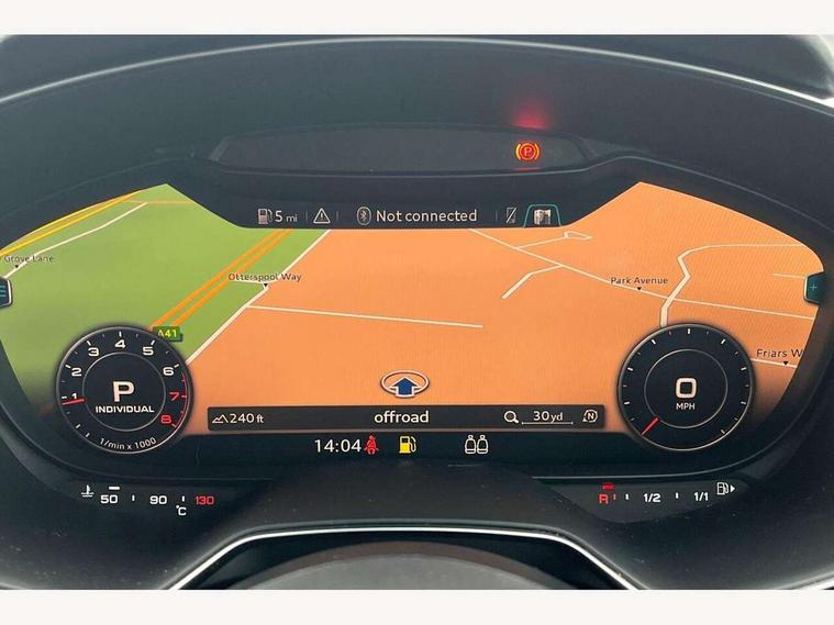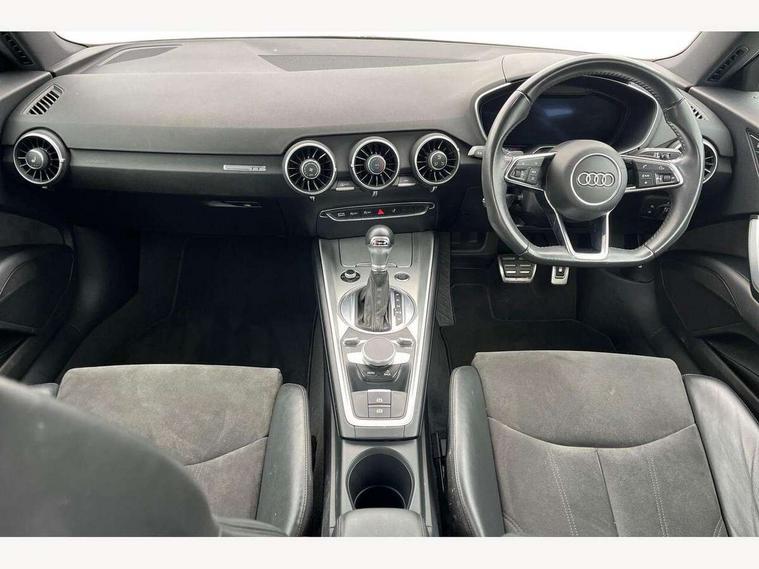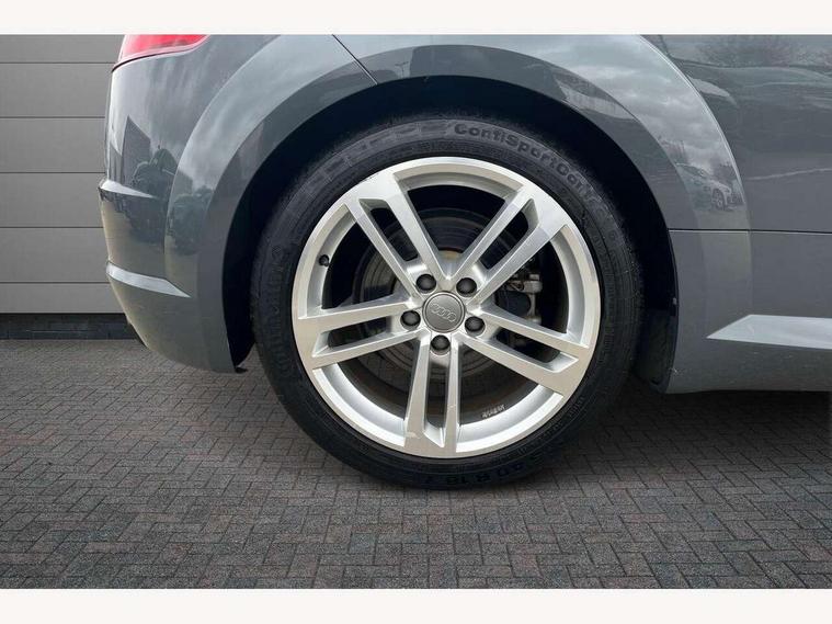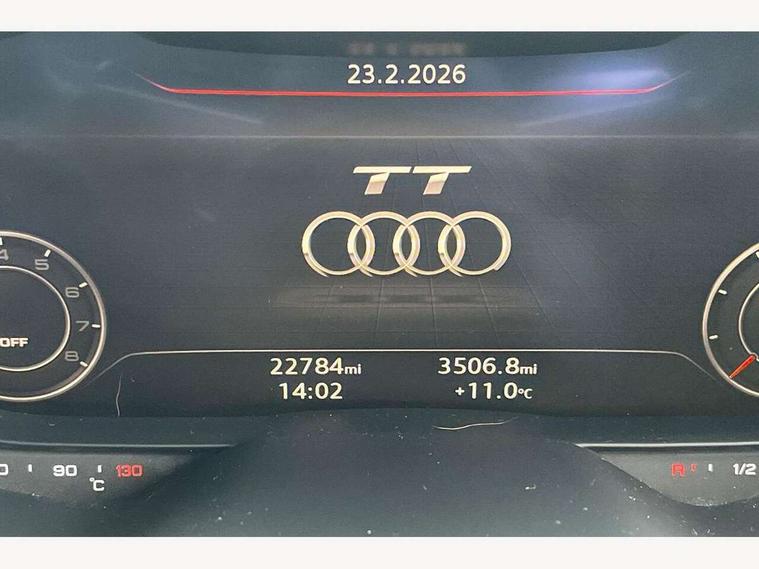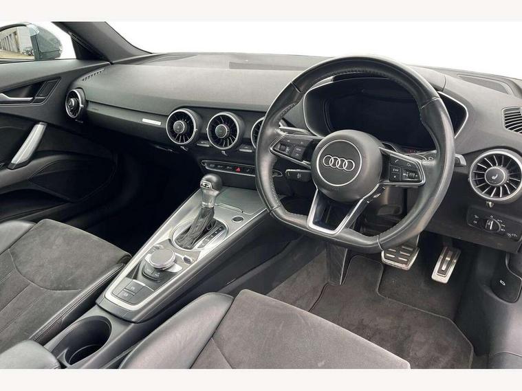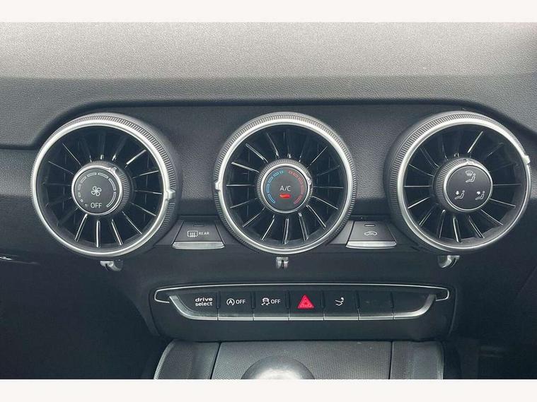 Audi drive select with 4 Pre configured modes, Audi virtual cockpit - 12.3" high-resolution LCD display with fully customisable instrument cluster, Cruise control + speed limiter, MMI touch panel, Mobile phone preparation with bluetooth interface, Progressive power assisted steering, Service interval indicator, Start/Stop system with energy recuperation, TP memo, Sports suspension, AM/FM radio, Audi music interface, Bluetooth audio streaming, DAB Digital radio, MMI Radio with CD player and SD/XC card slot, Auto dimming rear view mirror, Body colour bumpers, Body colour electrically adjustable and heated door mirrors with built in LED side indicators, Electric folding door mirrors, Electric front windows, Front fog lights, Green tinted heat insulating glass, Light and rain sensors, Retractable rear spoiler, Sunband for windscreen, Xenon headlights with LED daytime running lights with automatic headline range control + LED rear lights, brake lights and rear indicators, 12V socket, 3 spoke flat bottomed high multi-function leather sport steering wheel with gearshift paddles, Air conditioning, Alcantara/Leather upholstery includes seat centre panels, door trim inserts in black Alcantara with side bolsters, head restraints in black leather, Aluminium door sill trims, Front centre armrest, Front sports seats, Heated front seats, Height adjustable driver's seat, Height adjustable front head restraints, Height/reach adjust steering wheel, ISOFIX child seat mounting for front passenger seat with airbag deactivation, Reading lights, Rear head restraints, Rear top tether child seat ISOFIX attachment, Split folding rear seat, Tool kit, Top tether anchor plate for isofix child seat, Non smoking pack - TT/TT RS, 3 point front seat belts, ABS, ASR traction control, Brake energy regeneration, Curtain airbags, Driver and front passenger airbag with front passenger airbag deactivation, EDL traction control, Electromechanical parking brake, ESP, First aid kit, Front side airbags, Head airbags, Hill hold assist, Seatbelt warning, Tyre pressure warning, Warning triangle, Anti theft alarm, Anti theft wheel bolts, Immobiliser, Keyless Go, Remote central locking, Aluminium design inlays, Tyre repair kit,